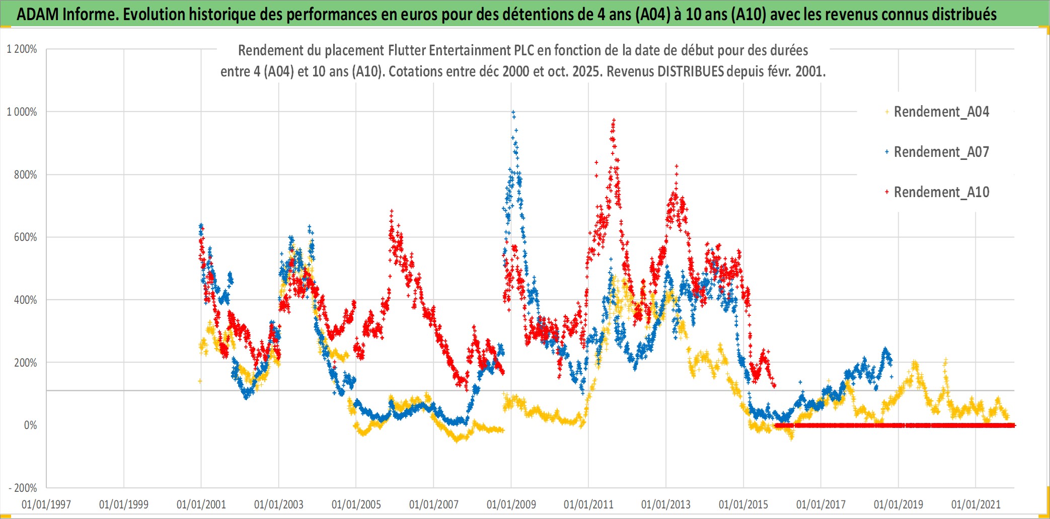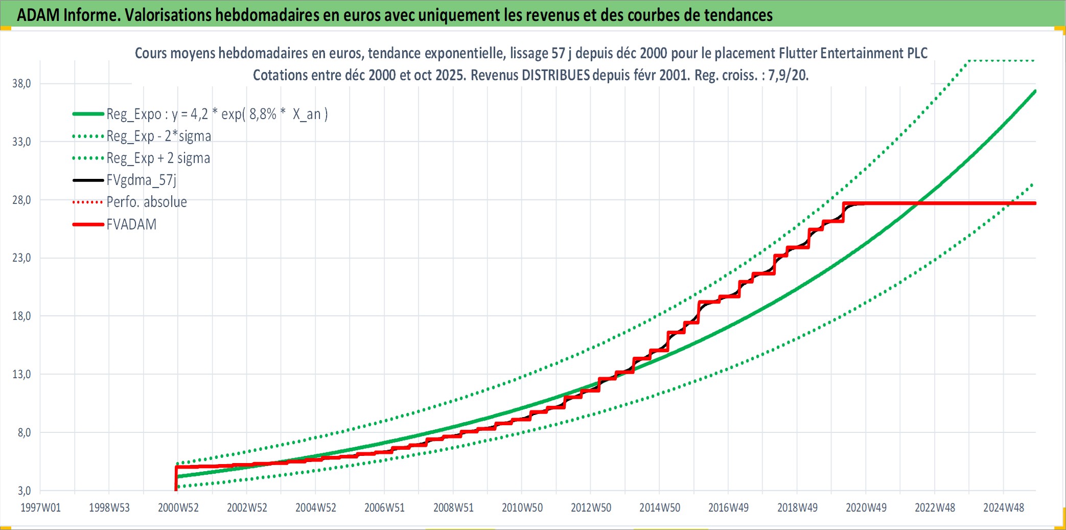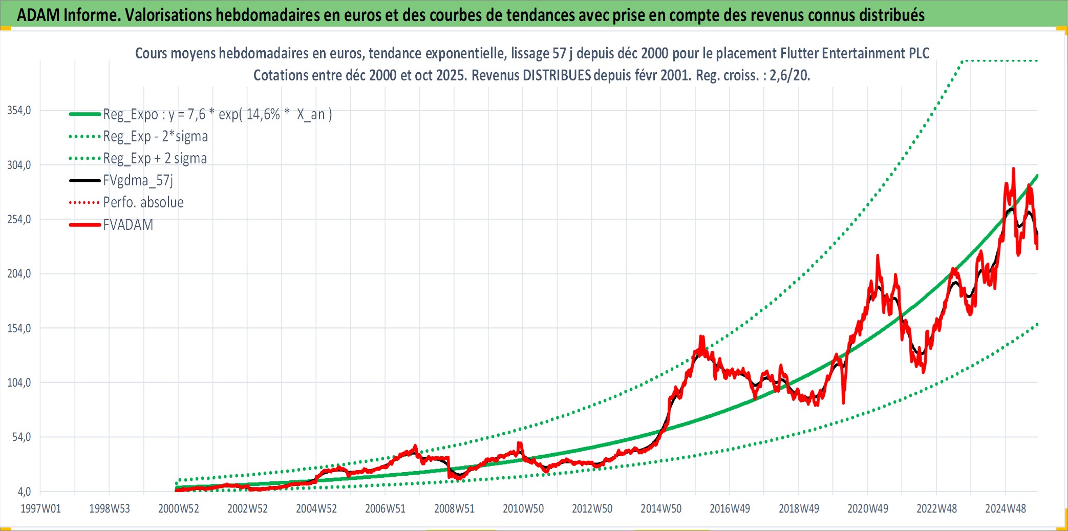 Site dédié aux investisseursPage dédiée sur site financeAnalyse des valorisations hebdomadaires de l'action Flutter Entertainment PLC. Cet actif est cote en GBX. Les valorisations sont en contrevaleur EURO et couvrent les semaines 2000W49 a 2025W44. Les revenus de cet actif financier sont pris en compte depuis la semaine 2001W09. La note globale ESG de cet actif est estimee a 7.0 (apres rebasage entre 0 et 20).