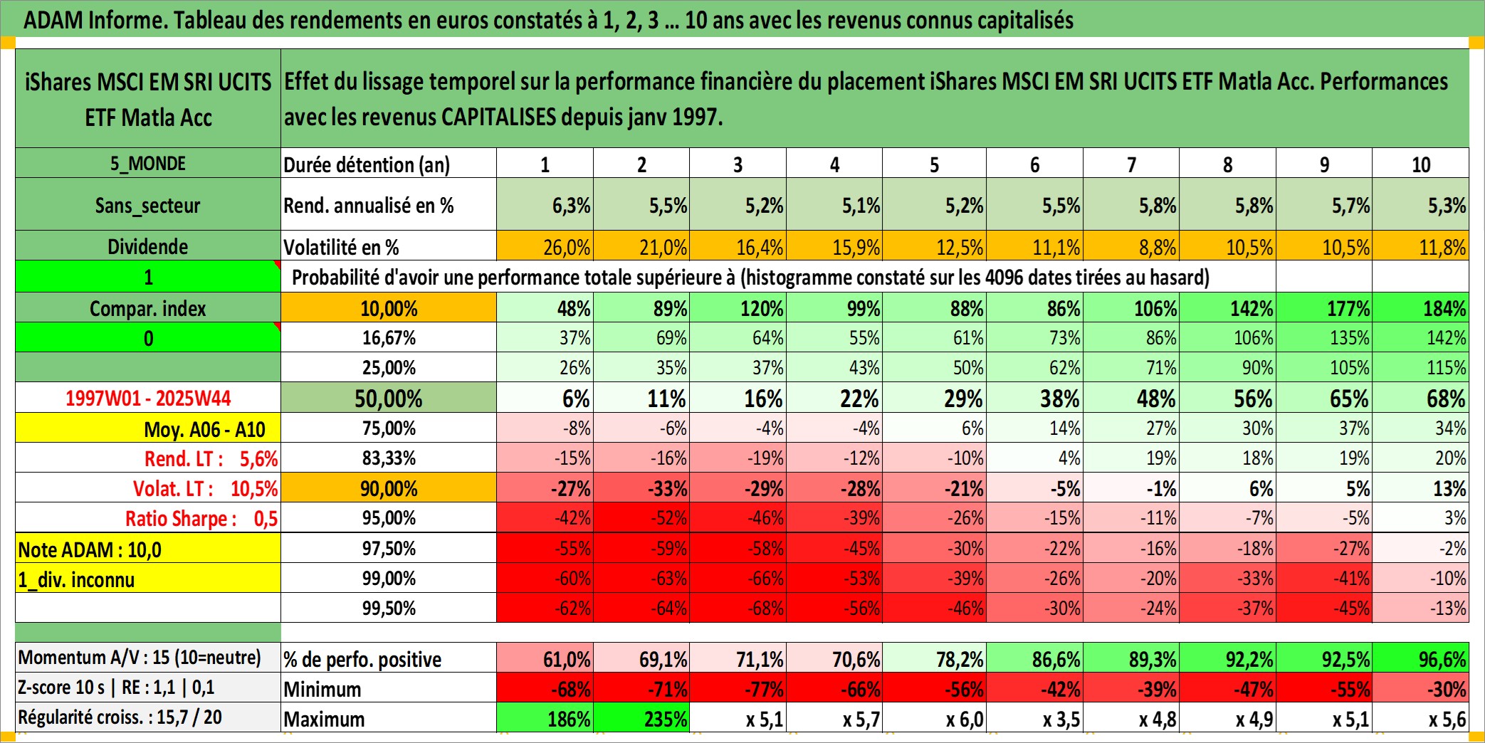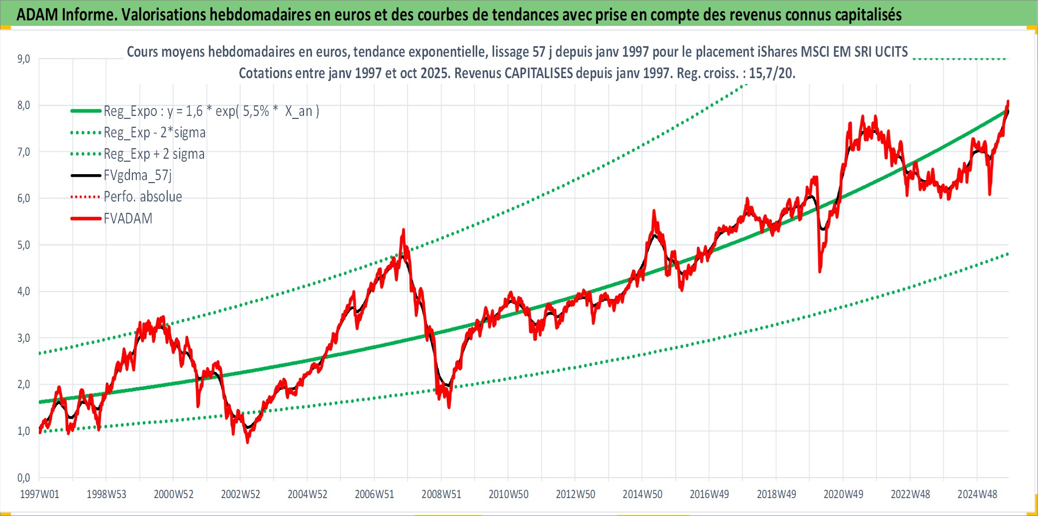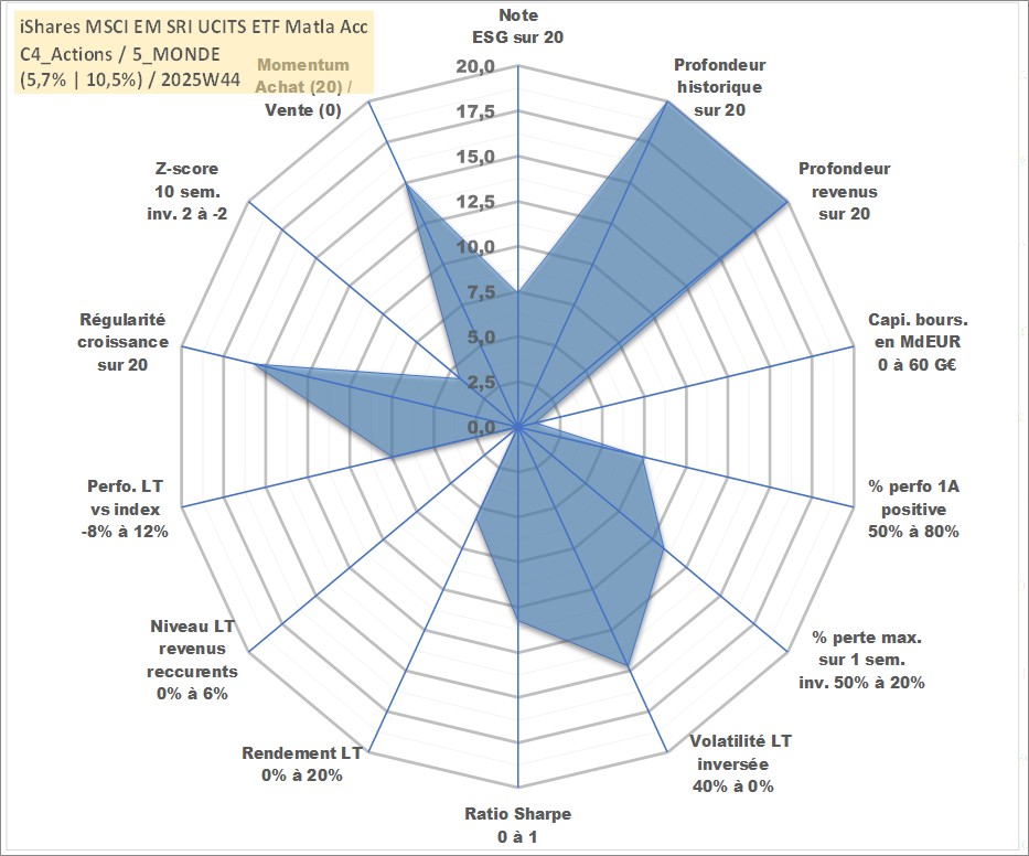 Site dédié aux investisseursPage dédiée sur site financeAnalyse des valorisations hebdomadaires du fonds iShares MSCI EM SRI UCITS ETF Matla Acc. Cet actif est cote en USD. Les valorisations sont en contrevaleur EURO et couvrent les semaines 1997W01 a 2025W44. Les revenus de cet actif financier sont pris en compte depuis la semaine 1997W01. La note globale ESG de cet actif est estimee a 7.4 (apres rebasage entre 0 et 20).