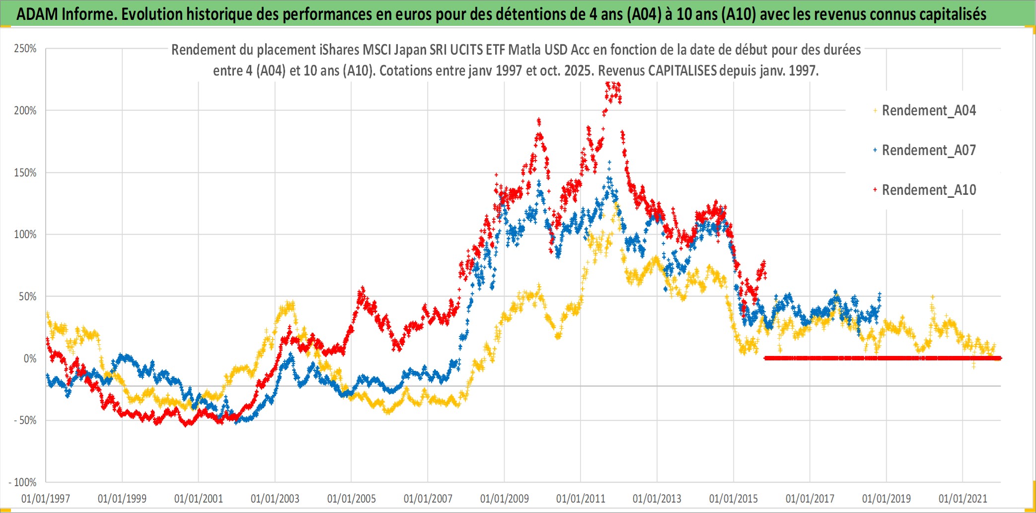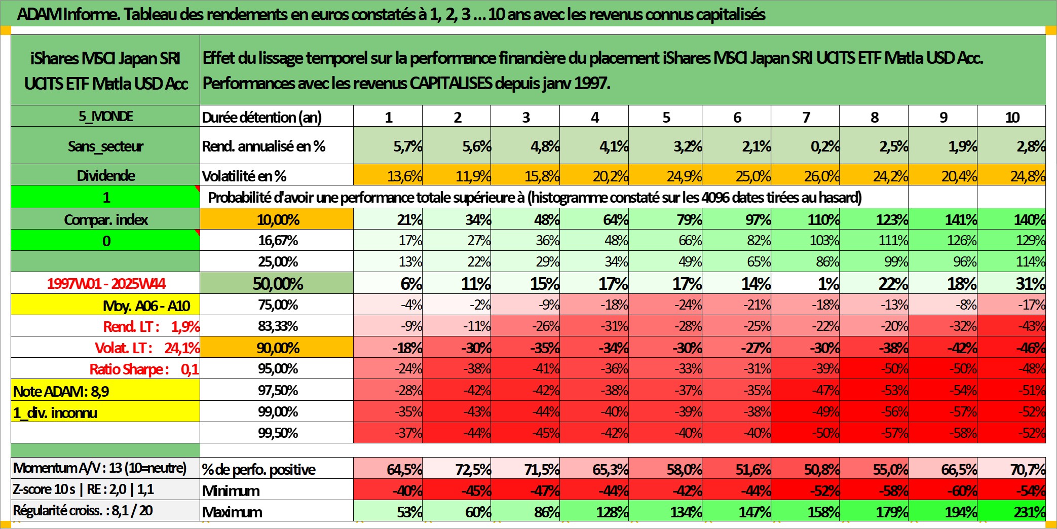 Site dédié aux investisseursPage dédiée sur site financeAnalyse des valorisations hebdomadaires du fonds iShares MSCI Japan SRI UCITS ETF Matla USD Acc. Cet actif est cote en USD. Les valorisations sont en contrevaleur EURO et couvrent les semaines 1997W01 a 2025W44. Les revenus de cet actif financier sont pris en compte depuis la semaine 1997W01. La note globale ESG de cet actif est estimee a 8.9 (apres rebasage entre 0 et 20).