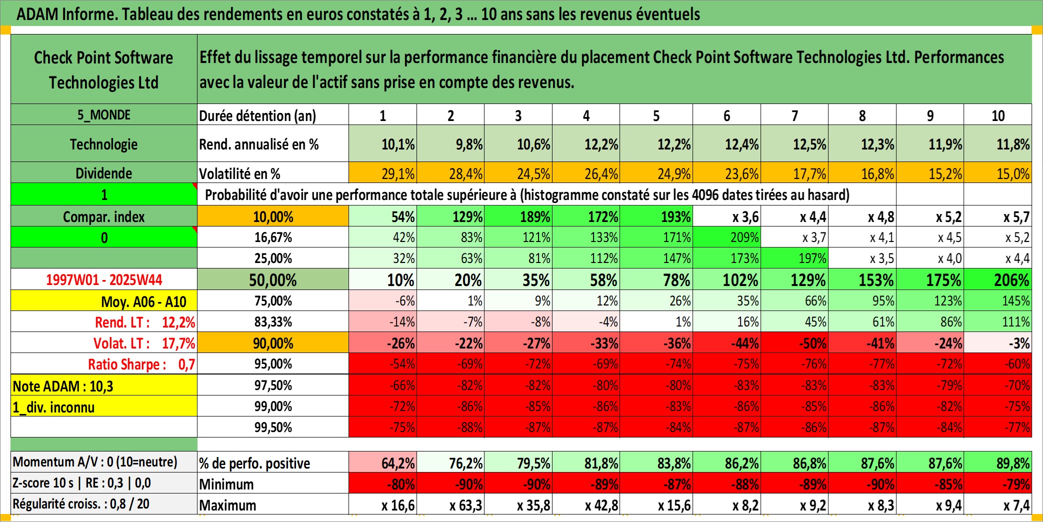 Site dédié aux investisseursPage dédiée sur site financeAnalyse des valorisations hebdomadaires de l'action Check Point Software Technologies Ltd. Cet actif est cote en USD. Les valorisations sont en contrevaleur EURO et couvrent les semaines 1997W01 a 2025W44. Les revenus de cet actif financier ne sont pas connus car non existants ou non disponibles sur le site Yahoo Finance. La note globale ESG de cet actif est estimee a 9.0 (apres rebasage entre 0 et 20).