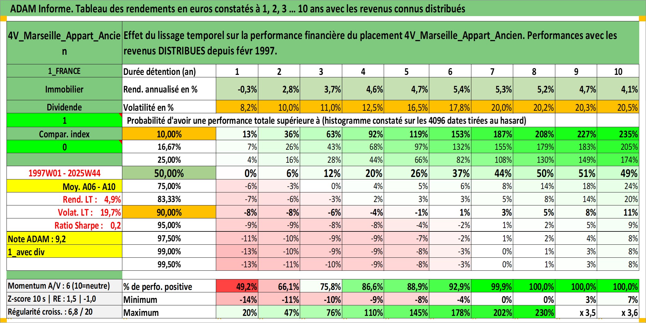 Site dédié aux investisseursPage dédiée sur site financeAnalyse des valorisations hebdomadaires de l'actif 4V_Marseille_Appart_Ancien. Cet actif est cote en EUR. Les valorisations couvrent les semaines 1997W01 a 2025W44. Les loyers de cet actif immobilier sont pris egaux a 3,33% annuels de la valeur venale du logement.
