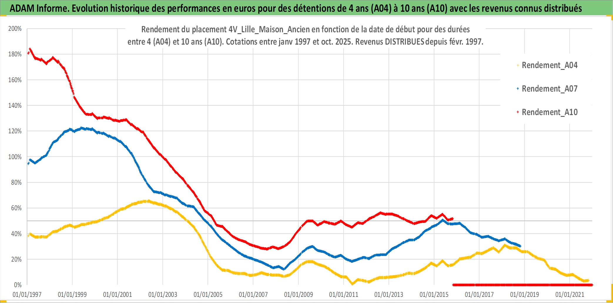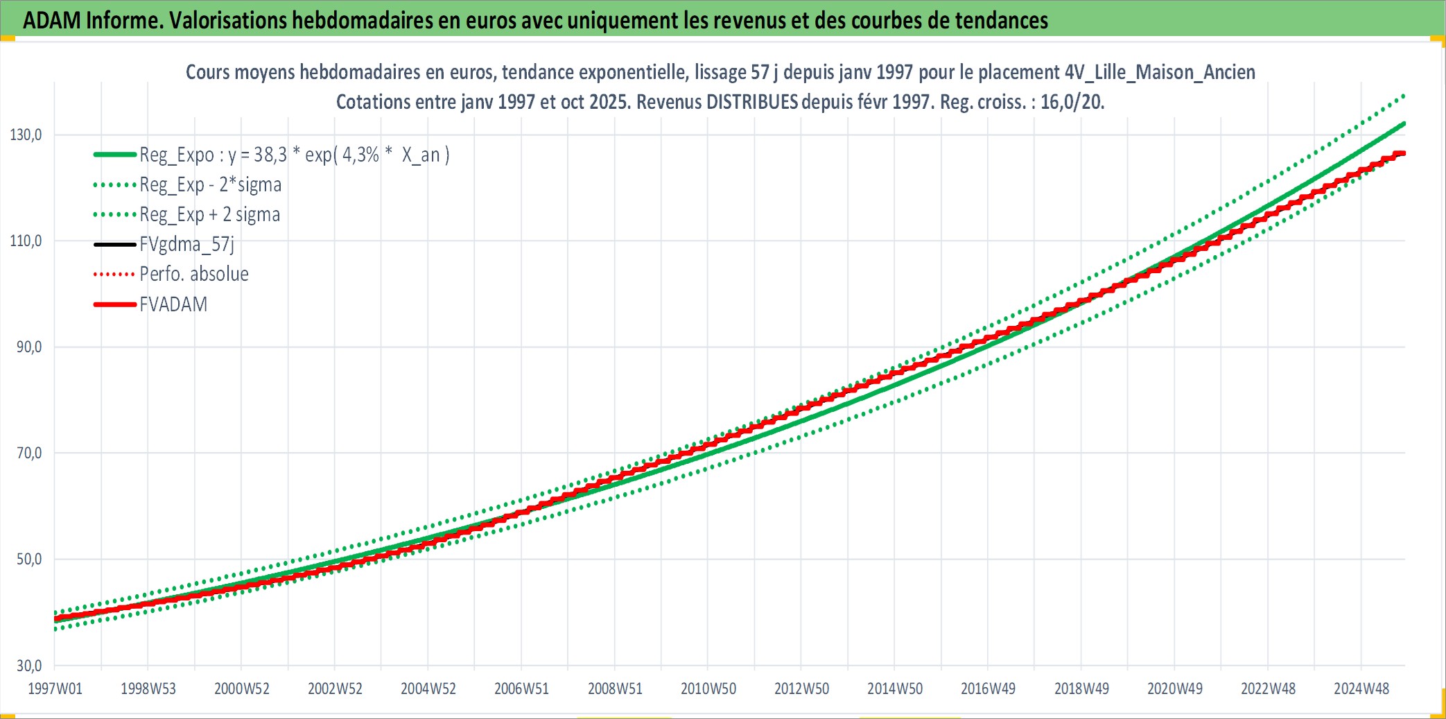 Site dédié aux investisseursPage dédiée sur site financeAnalyse des valorisations hebdomadaires de l'actif 4V_Lille_Maison_Ancien. Cet actif est cote en EUR. Les valorisations couvrent les semaines 1997W01 a 2025W44. Les loyers de cet actif immobilier sont pris egaux a 3,33% annuels de la valeur venale du logement.