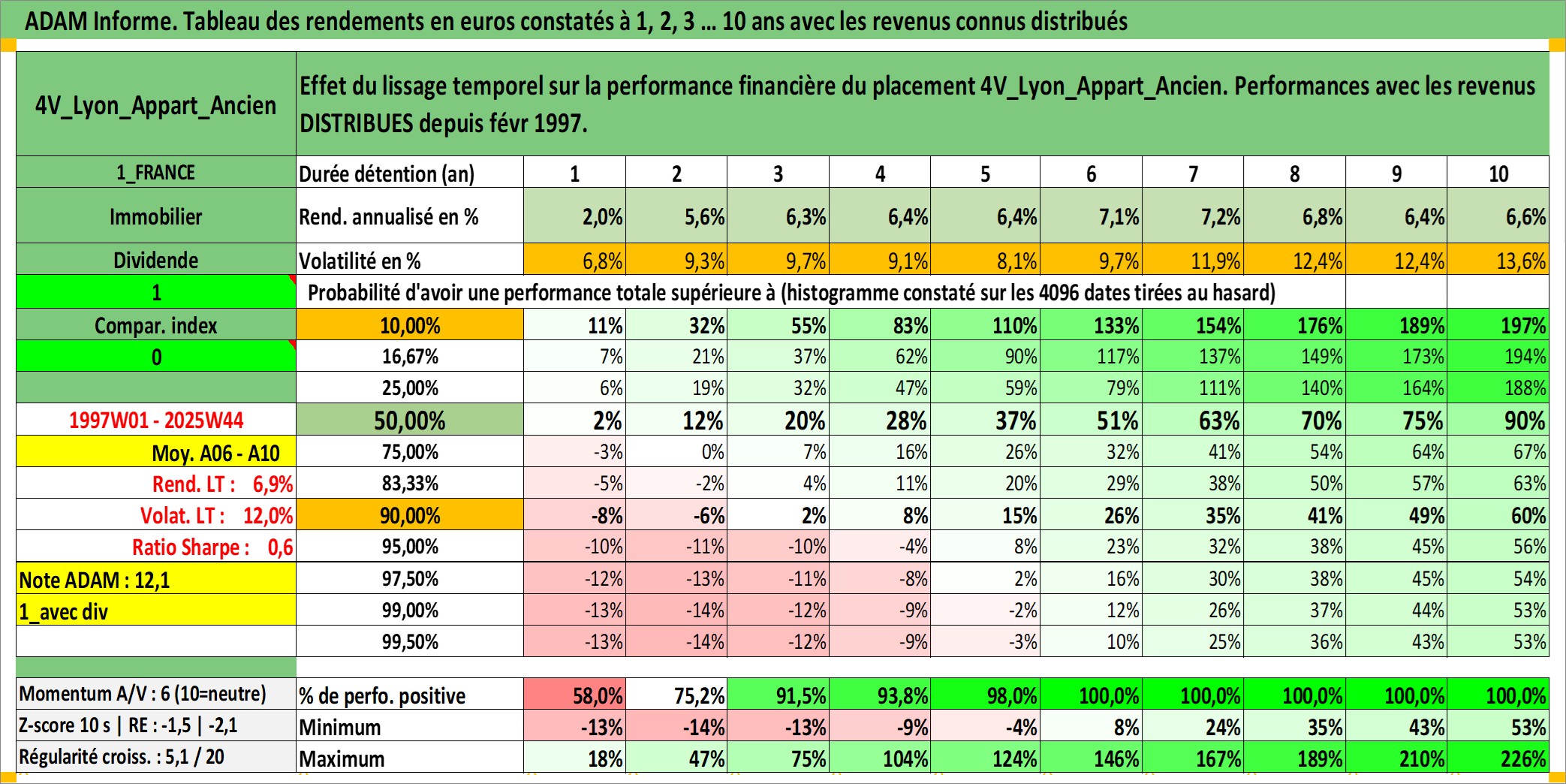 Site dédié aux investisseursPage dédiée sur site financeAnalyse des valorisations hebdomadaires de l'actif 4V_Lyon_Appart_Ancien. Cet actif est cote en EUR. Les valorisations couvrent les semaines 1997W01 a 2025W44. Les loyers de cet actif immobilier sont pris egaux a 3,33% annuels de la valeur venale du logement.