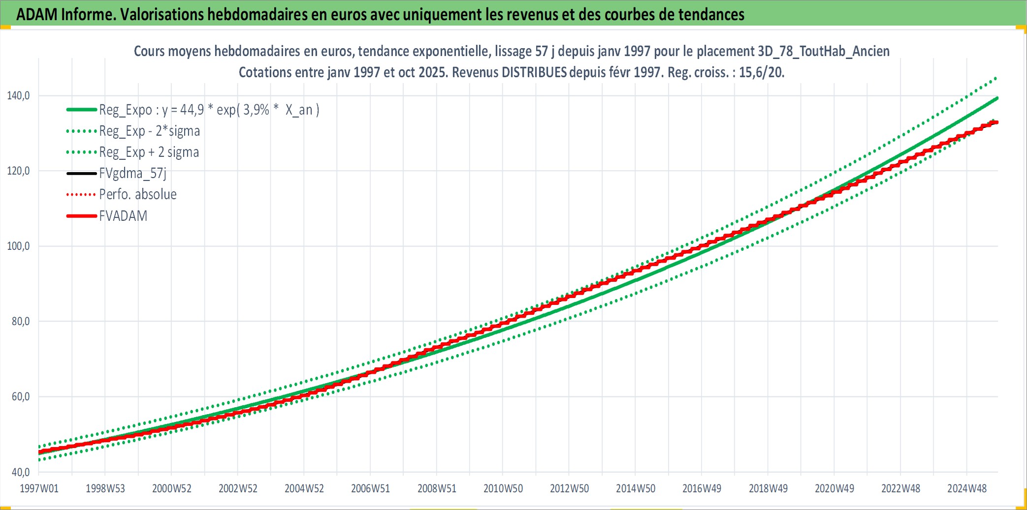 Site dédié aux investisseursPage dédiée sur site financeAnalyse des valorisations hebdomadaires de l'actif 3D_78_ToutHab_Ancien. Cet actif est cote en EUR. Les valorisations couvrent les semaines 1997W01 a 2025W44. Les loyers de cet actif immobilier sont pris egaux a 3,33% annuels de la valeur venale du logement.