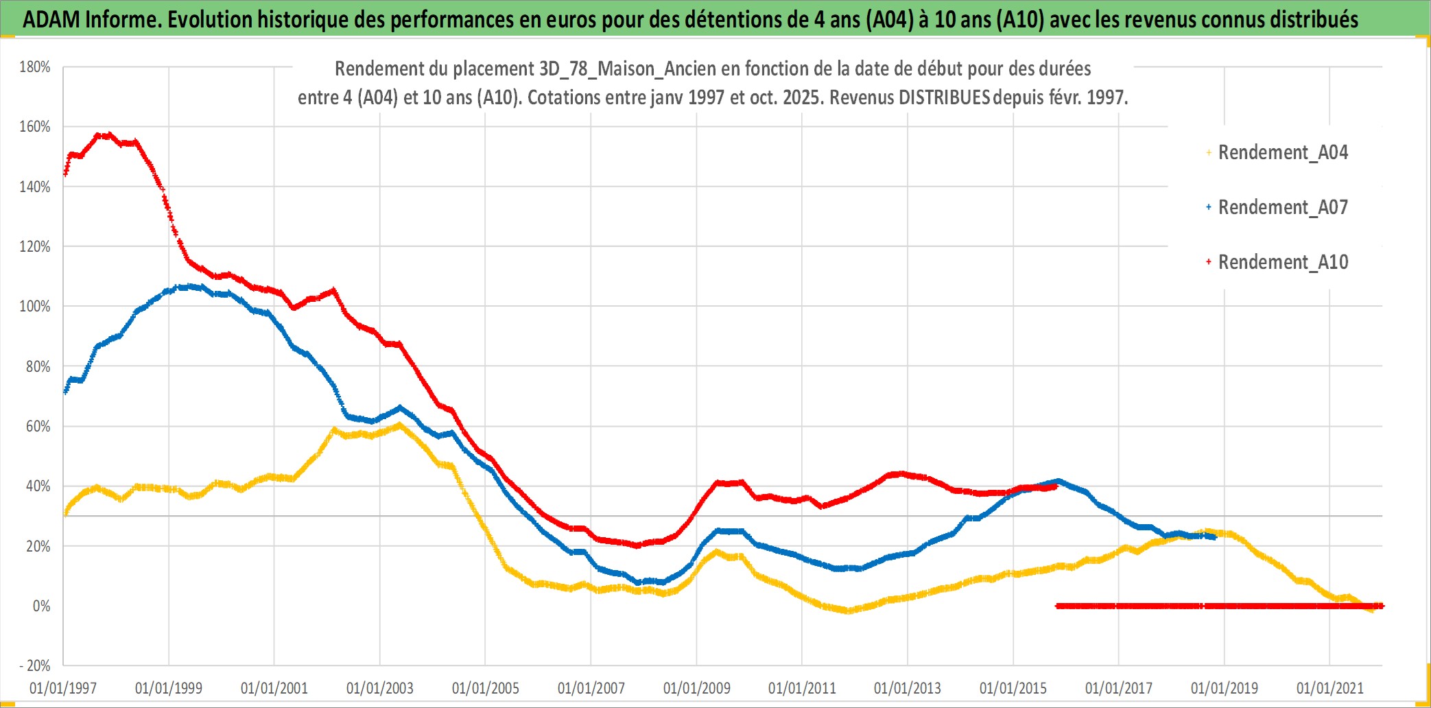 Site dédié aux investisseursPage dédiée sur site financeAnalyse des valorisations hebdomadaires de l'actif 3D_78_Maison_Ancien. Cet actif est cote en EUR. Les valorisations couvrent les semaines 1997W01 a 2025W44. Les loyers de cet actif immobilier sont pris egaux a 3,33% annuels de la valeur venale du logement.