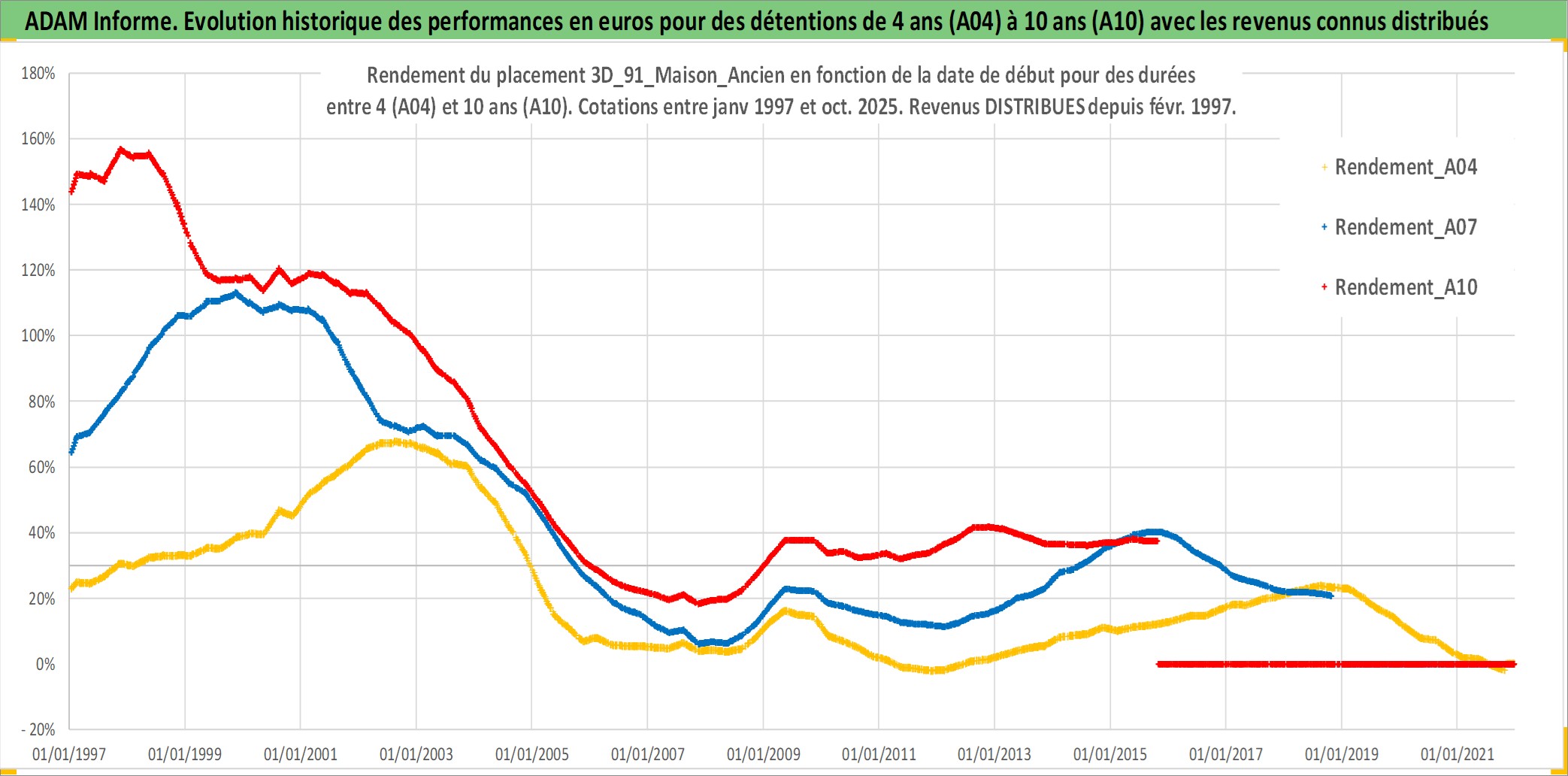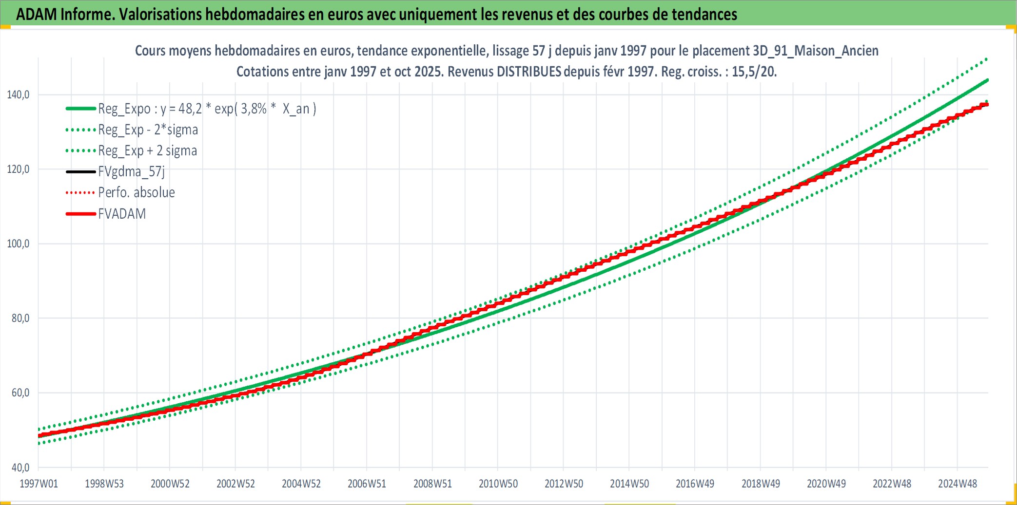 Site dédié aux investisseursPage dédiée sur site financeAnalyse des valorisations hebdomadaires de l'actif 3D_91_Maison_Ancien. Cet actif est cote en EUR. Les valorisations couvrent les semaines 1997W01 a 2025W44. Les loyers de cet actif immobilier sont pris egaux a 3,33% annuels de la valeur venale du logement.