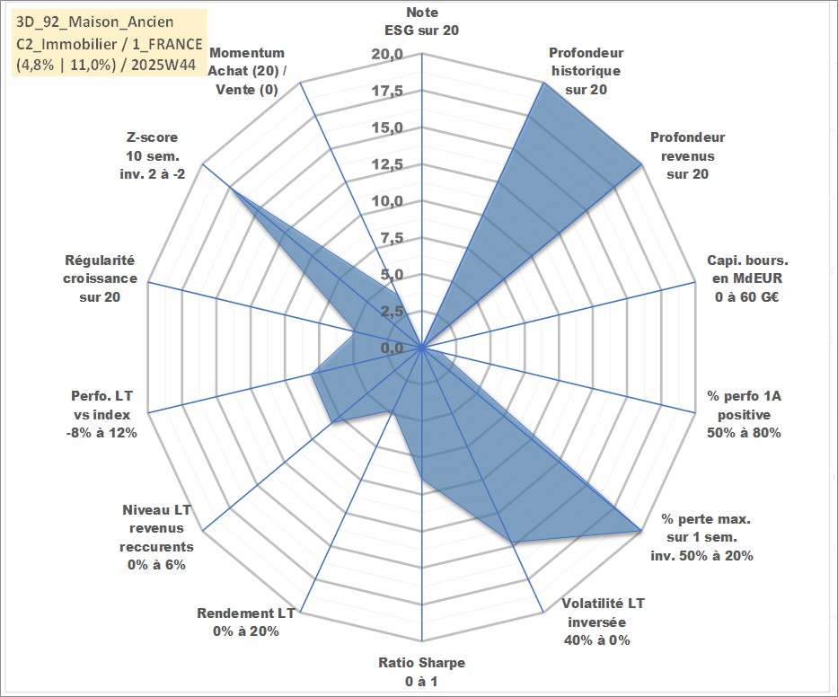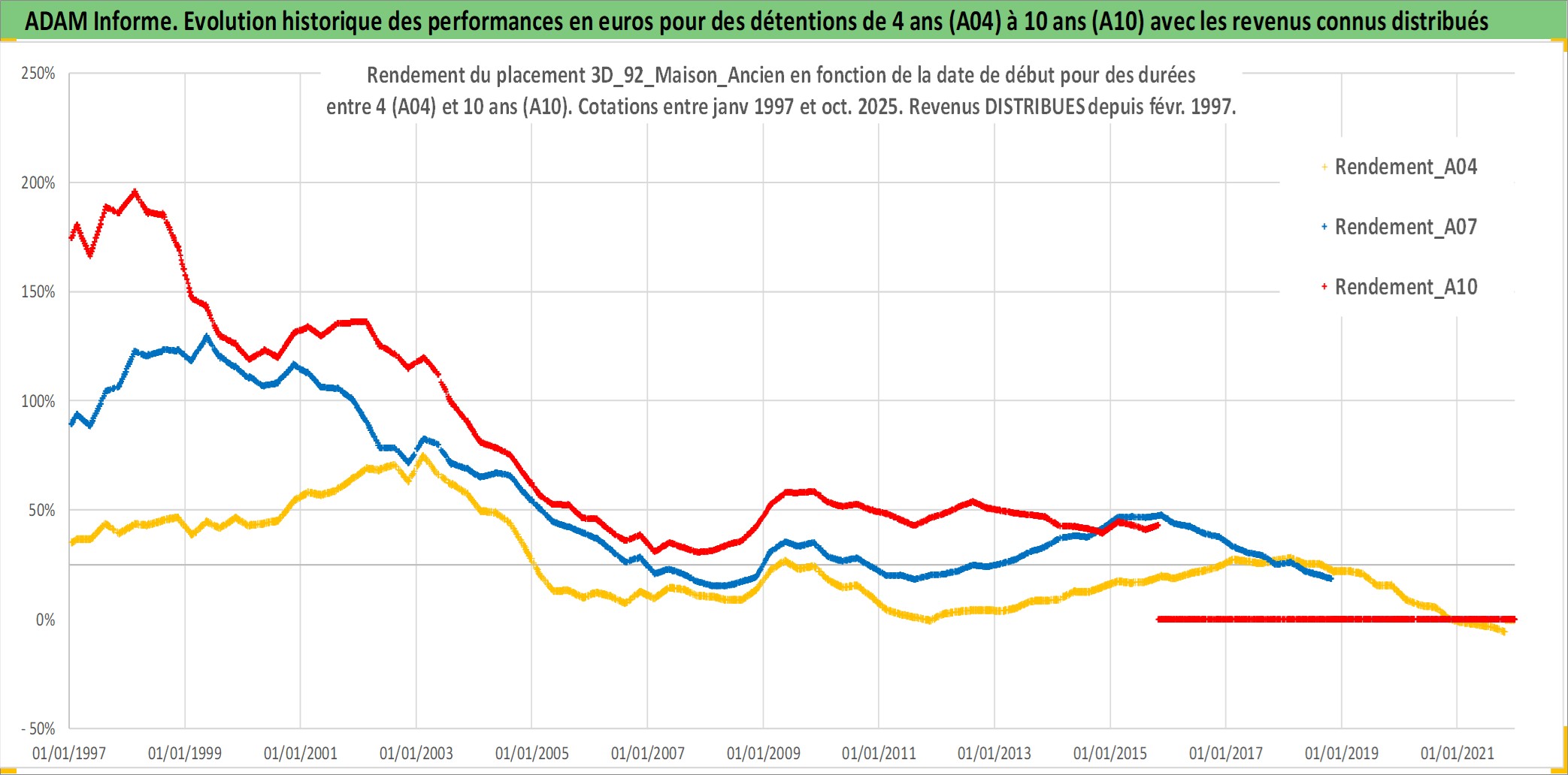 Site dédié aux investisseursPage dédiée sur site financeAnalyse des valorisations hebdomadaires de l'actif 3D_92_Maison_Ancien. Cet actif est cote en EUR. Les valorisations couvrent les semaines 1997W01 a 2025W44. Les loyers de cet actif immobilier sont pris egaux a 3,33% annuels de la valeur venale du logement.