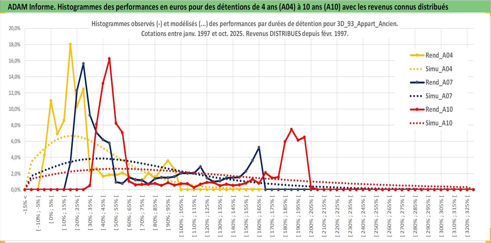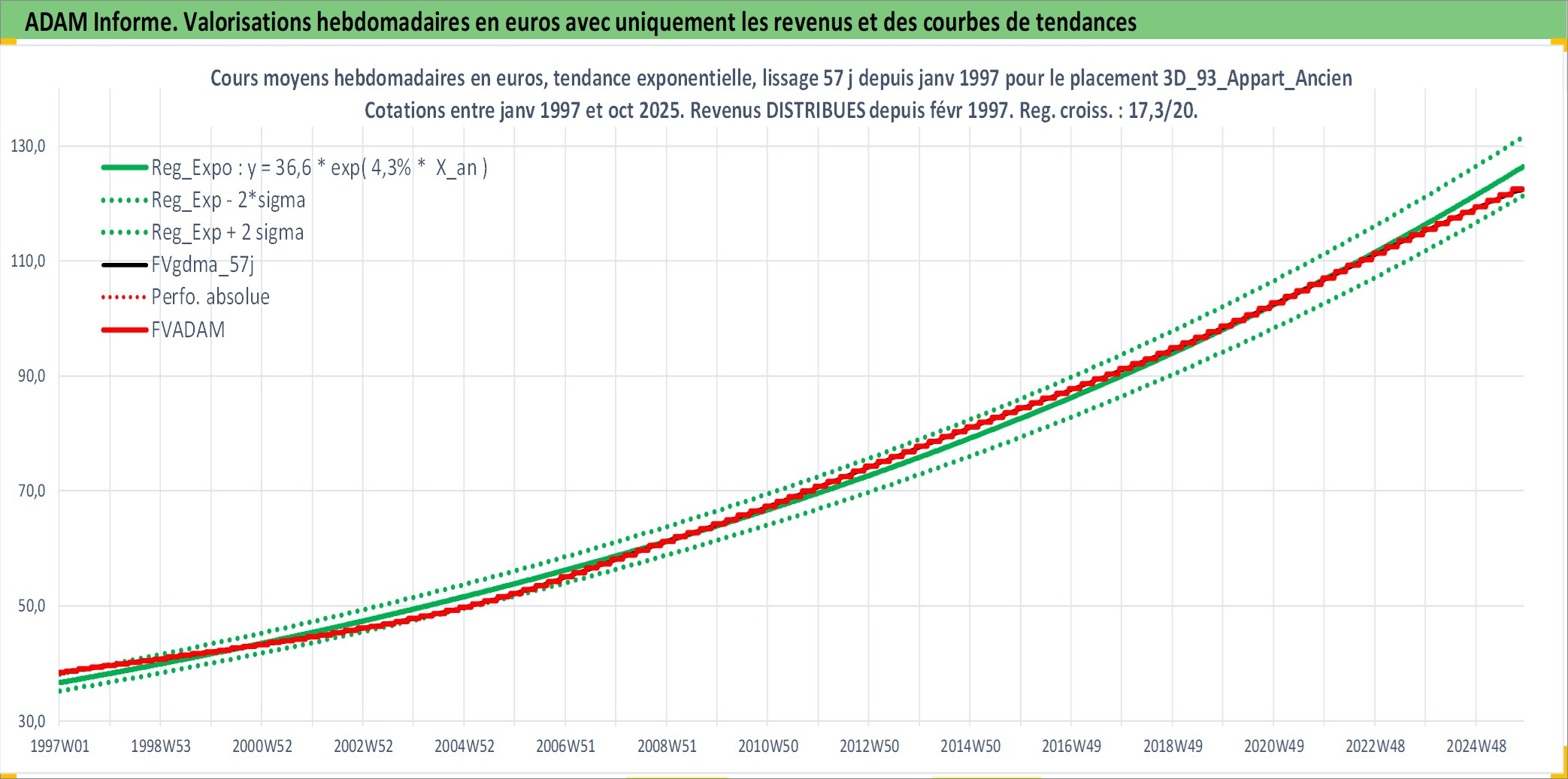 Site dédié aux investisseursPage dédiée sur site financeAnalyse des valorisations hebdomadaires de l'actif 3D_93_Appart_Ancien. Cet actif est cote en EUR. Les valorisations couvrent les semaines 1997W01 a 2025W44. Les loyers de cet actif immobilier sont pris egaux a 3,33% annuels de la valeur venale du logement.