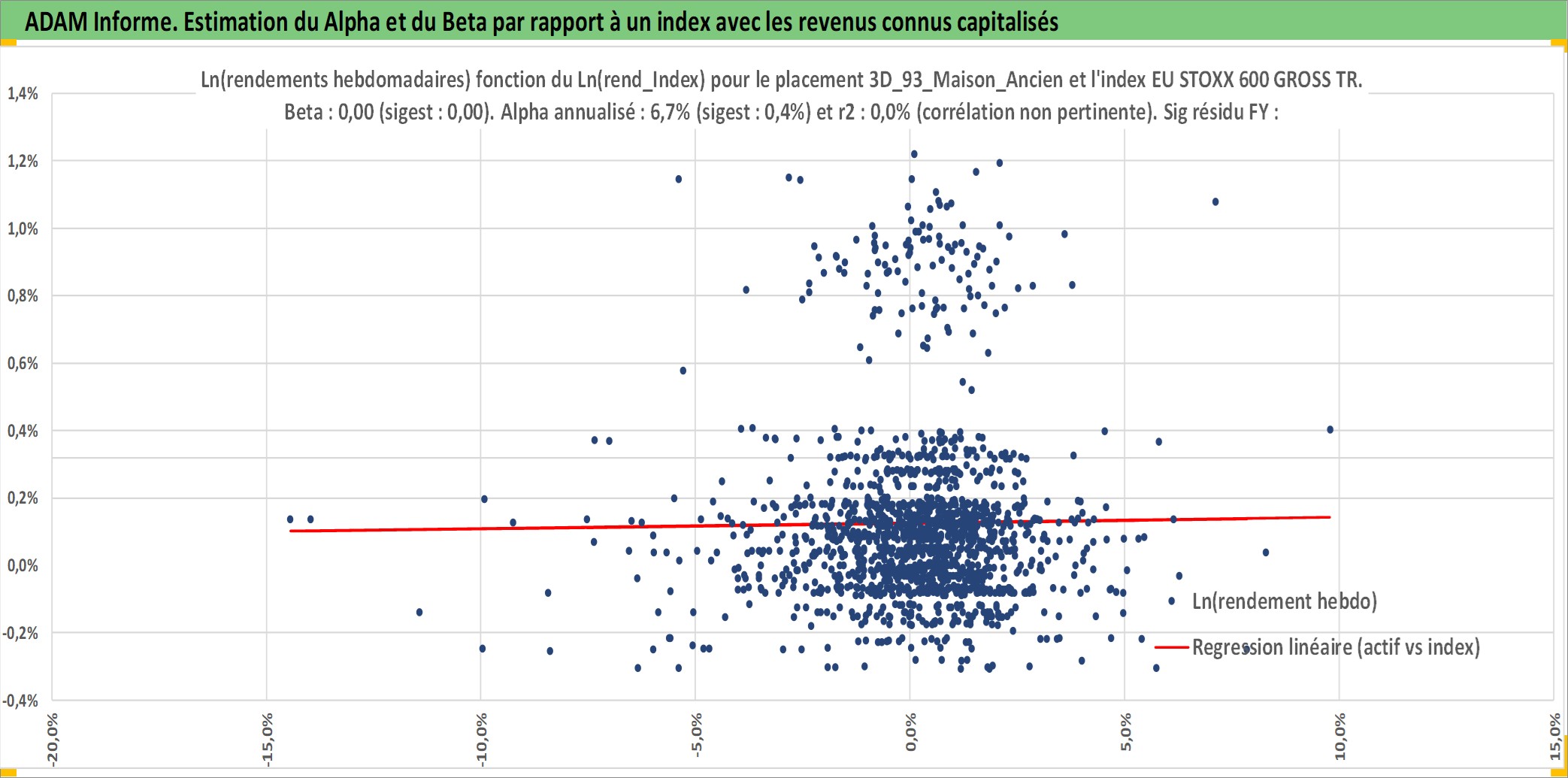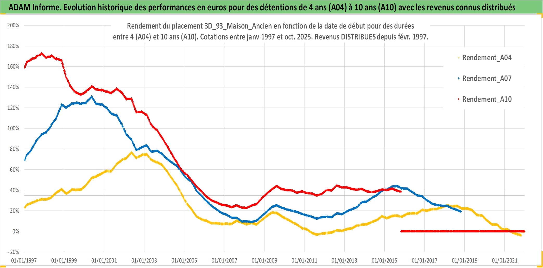Site dédié aux investisseursPage dédiée sur site financeAnalyse des valorisations hebdomadaires de l'actif 3D_93_Maison_Ancien. Cet actif est cote en EUR. Les valorisations couvrent les semaines 1997W01 a 2025W44. Les loyers de cet actif immobilier sont pris egaux a 3,33% annuels de la valeur venale du logement.
