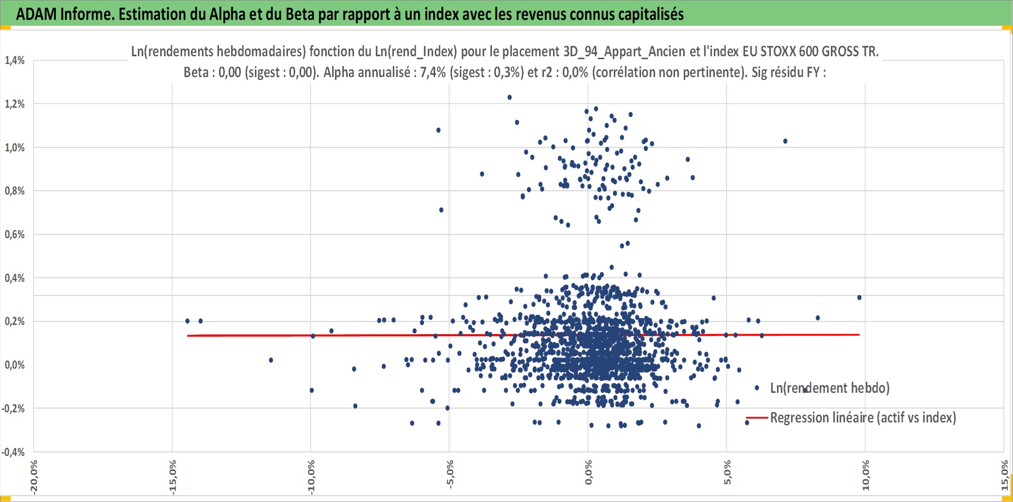 Site dédié aux investisseursPage dédiée sur site financeAnalyse des valorisations hebdomadaires de l'actif 3D_94_Appart_Ancien. Cet actif est cote en EUR. Les valorisations couvrent les semaines 1997W01 a 2025W44. Les loyers de cet actif immobilier sont pris egaux a 3,33% annuels de la valeur venale du logement.
