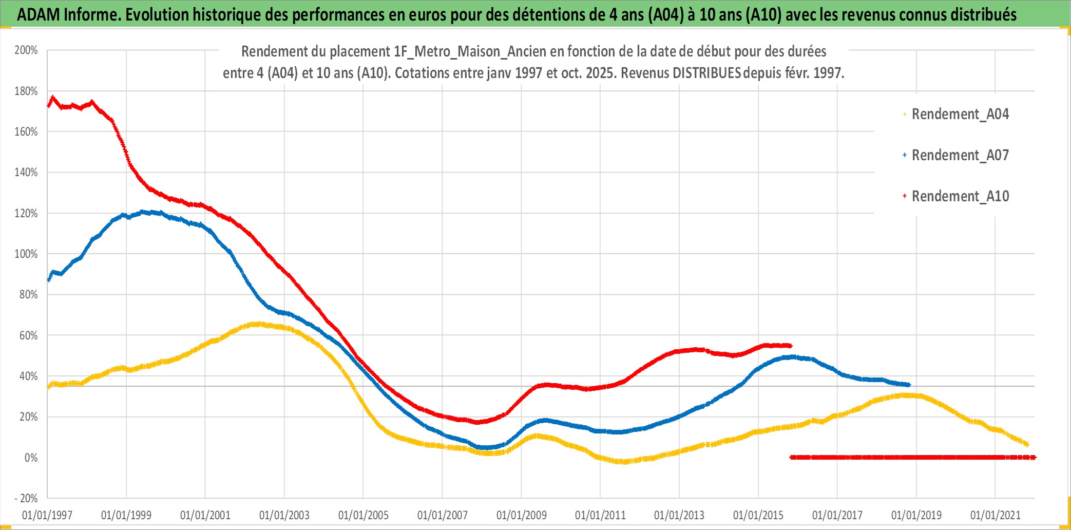 Site dédié aux investisseursPage dédiée sur site financeAnalyse des valorisations hebdomadaires de l'actif 1F_Metro_Maison_Ancien. Cet actif est cote en EUR. Les valorisations couvrent les semaines 1997W01 a 2025W44. Les loyers de cet actif immobilier sont pris egaux a 3,33% annuels de la valeur venale du logement.