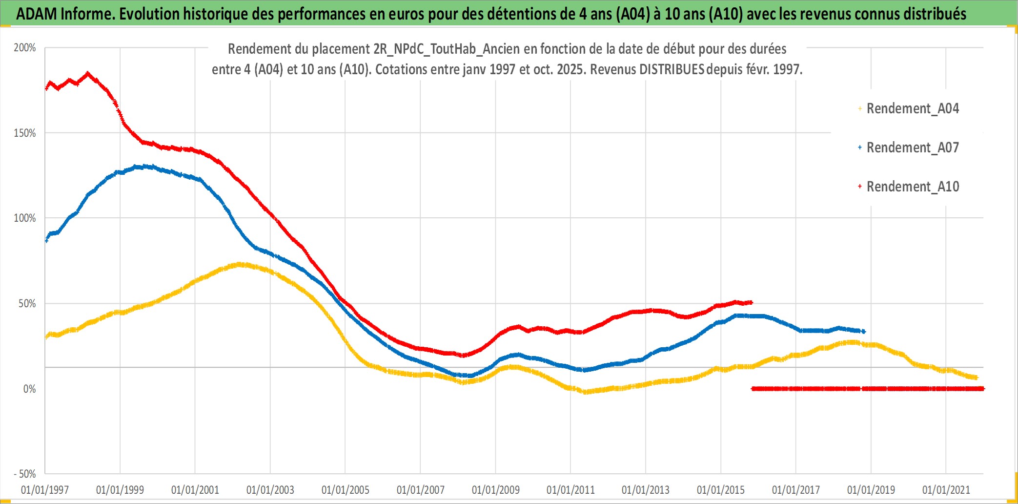 Site dédié aux investisseursPage dédiée sur site financeAnalyse des valorisations hebdomadaires de l'actif 2R_NPdC_ToutHab_Ancien. Cet actif est cote en EUR. Les valorisations couvrent les semaines 1997W01 a 2025W44. Les loyers de cet actif immobilier sont pris egaux a 3,33% annuels de la valeur venale du logement.