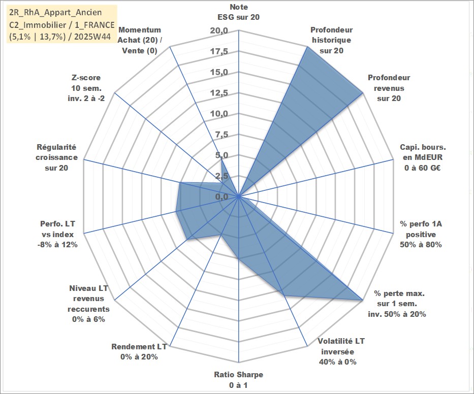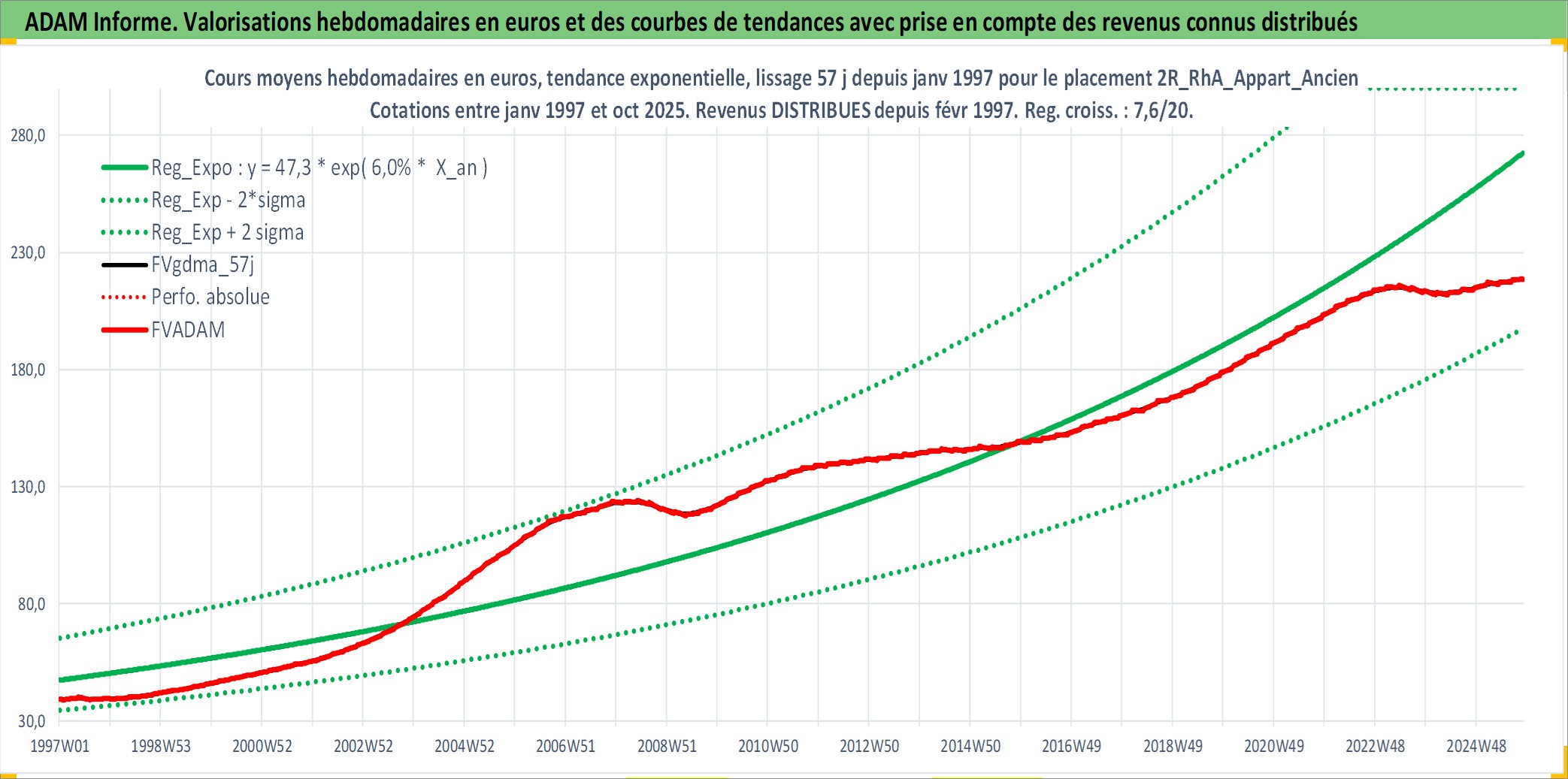 Site dédié aux investisseursPage dédiée sur site financeAnalyse des valorisations hebdomadaires de l'actif 2R_RhA_Appart_Ancien. Cet actif est cote en EUR. Les valorisations couvrent les semaines 1997W01 a 2025W44. Les loyers de cet actif immobilier sont pris egaux a 3,33% annuels de la valeur venale du logement.