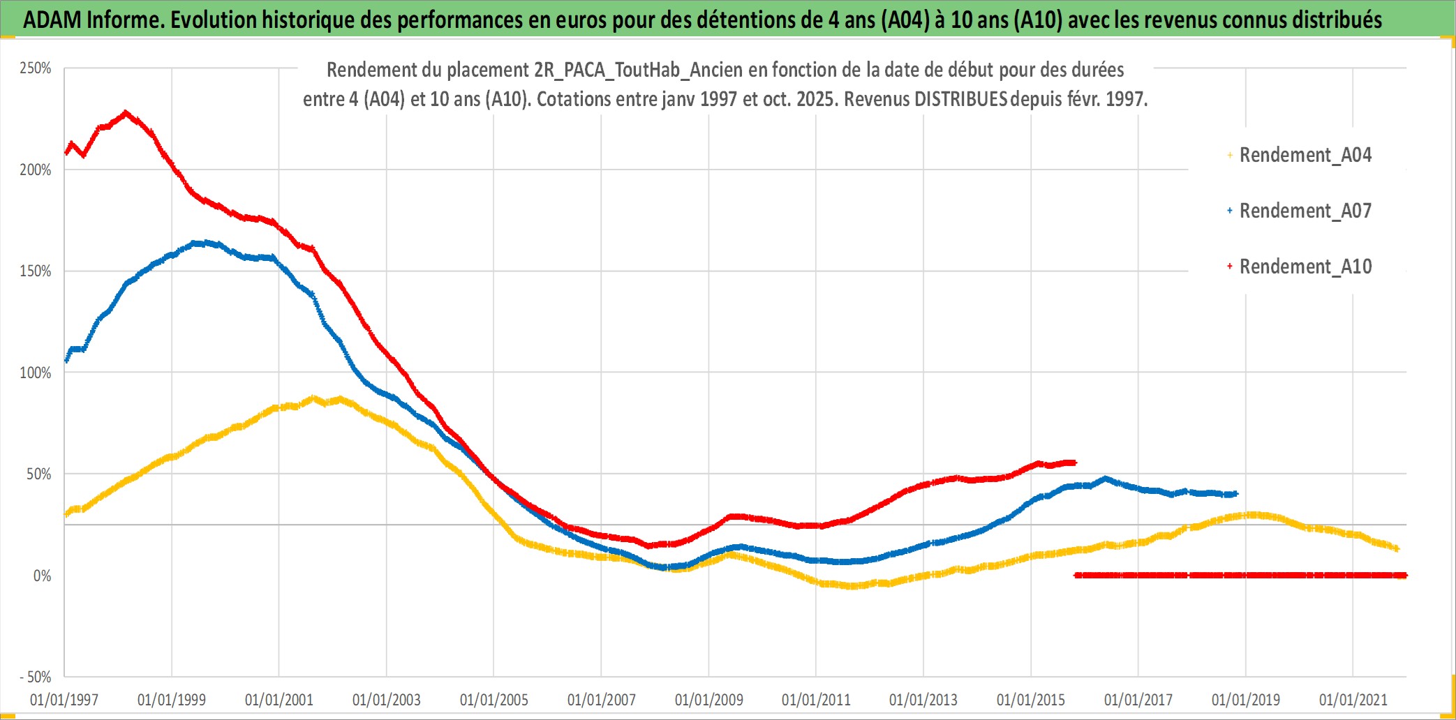 Site dédié aux investisseursPage dédiée sur site financeAnalyse des valorisations hebdomadaires de l'actif 2R_PACA_ToutHab_Ancien. Cet actif est cote en EUR. Les valorisations couvrent les semaines 1997W01 a 2025W44. Les loyers de cet actif immobilier sont pris egaux a 3,33% annuels de la valeur venale du logement.
