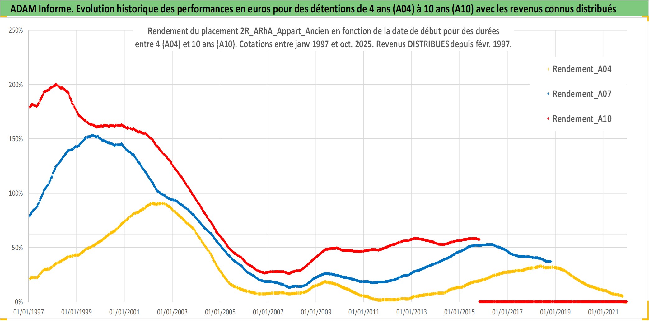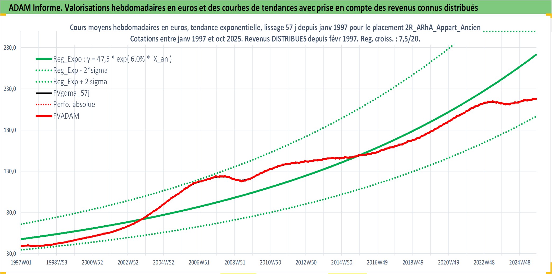 Site dédié aux investisseursPage dédiée sur site financeAnalyse des valorisations hebdomadaires de l'actif 2R_ARhA_Appart_Ancien. Cet actif est cote en EUR. Les valorisations couvrent les semaines 1997W01 a 2025W44. Les loyers de cet actif immobilier sont pris egaux a 3,33% annuels de la valeur venale du logement.