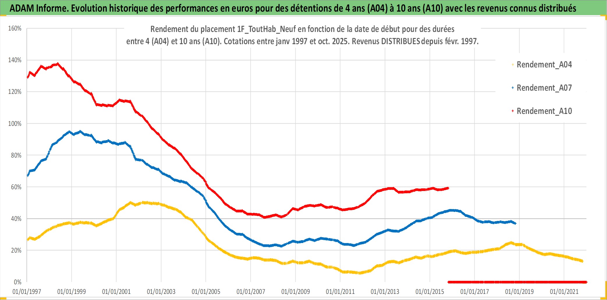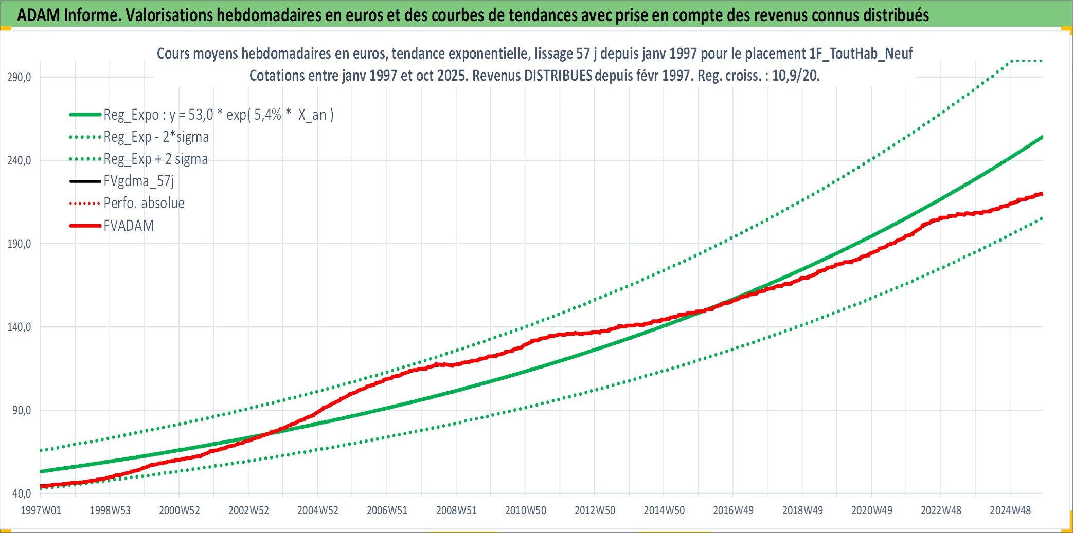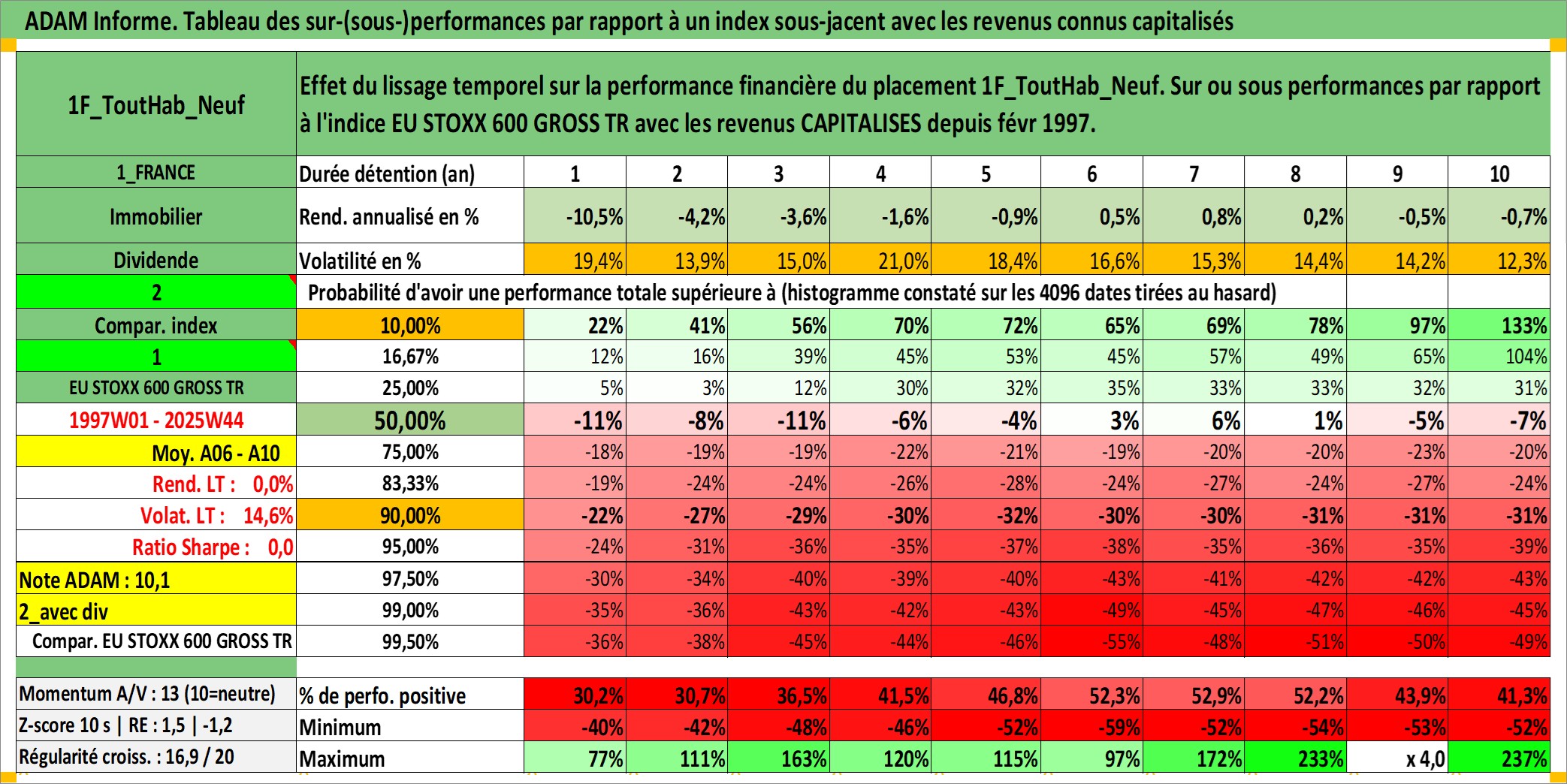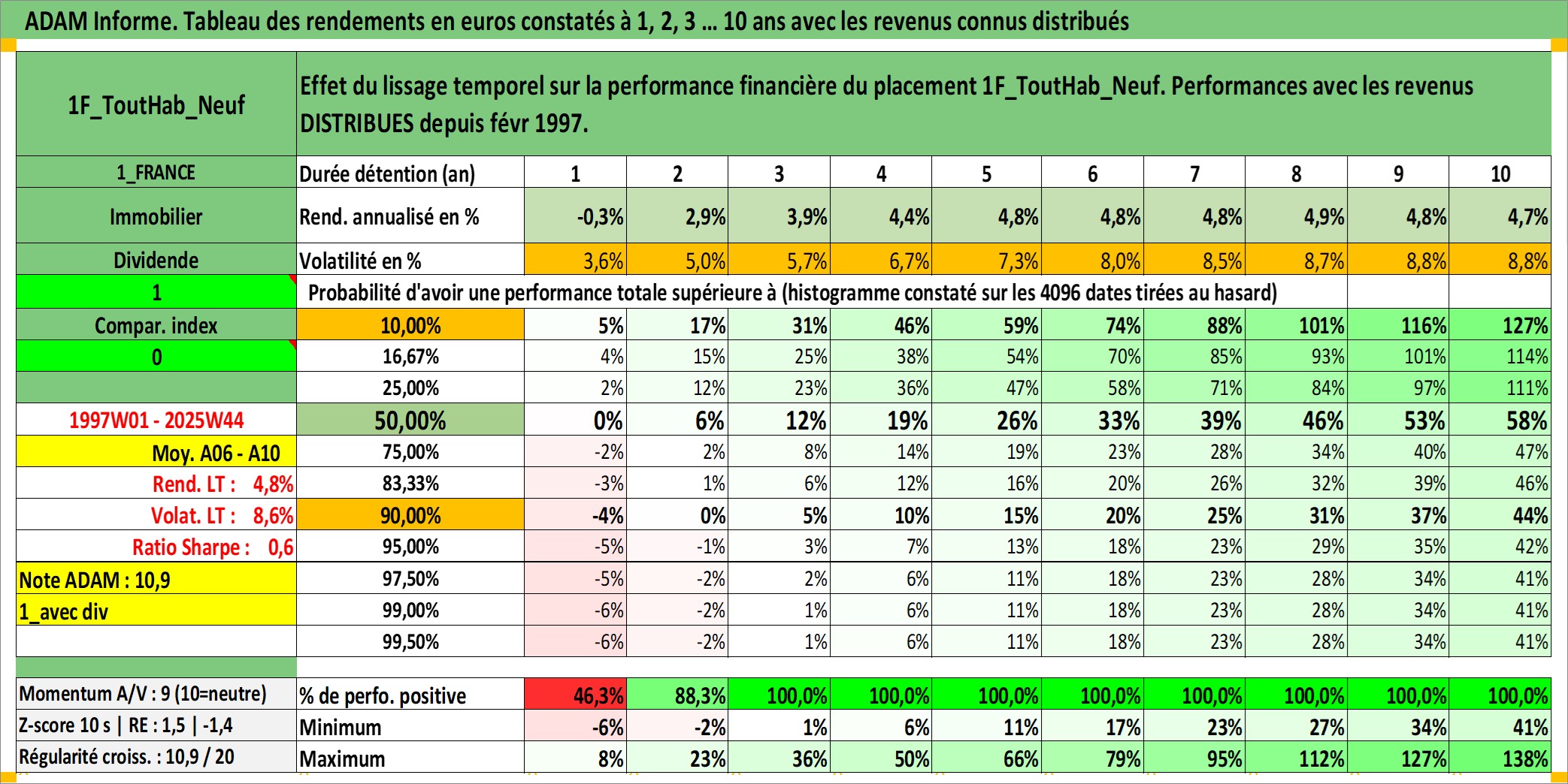 Site dédié aux investisseursPage dédiée sur site financeAnalyse des valorisations hebdomadaires de l'actif 1F_ToutHab_Neuf. Cet actif est cote en EUR. Les valorisations couvrent les semaines 1997W01 a 2025W44. Les loyers de cet actif immobilier sont pris egaux a 3,33% annuels de la valeur venale du logement.