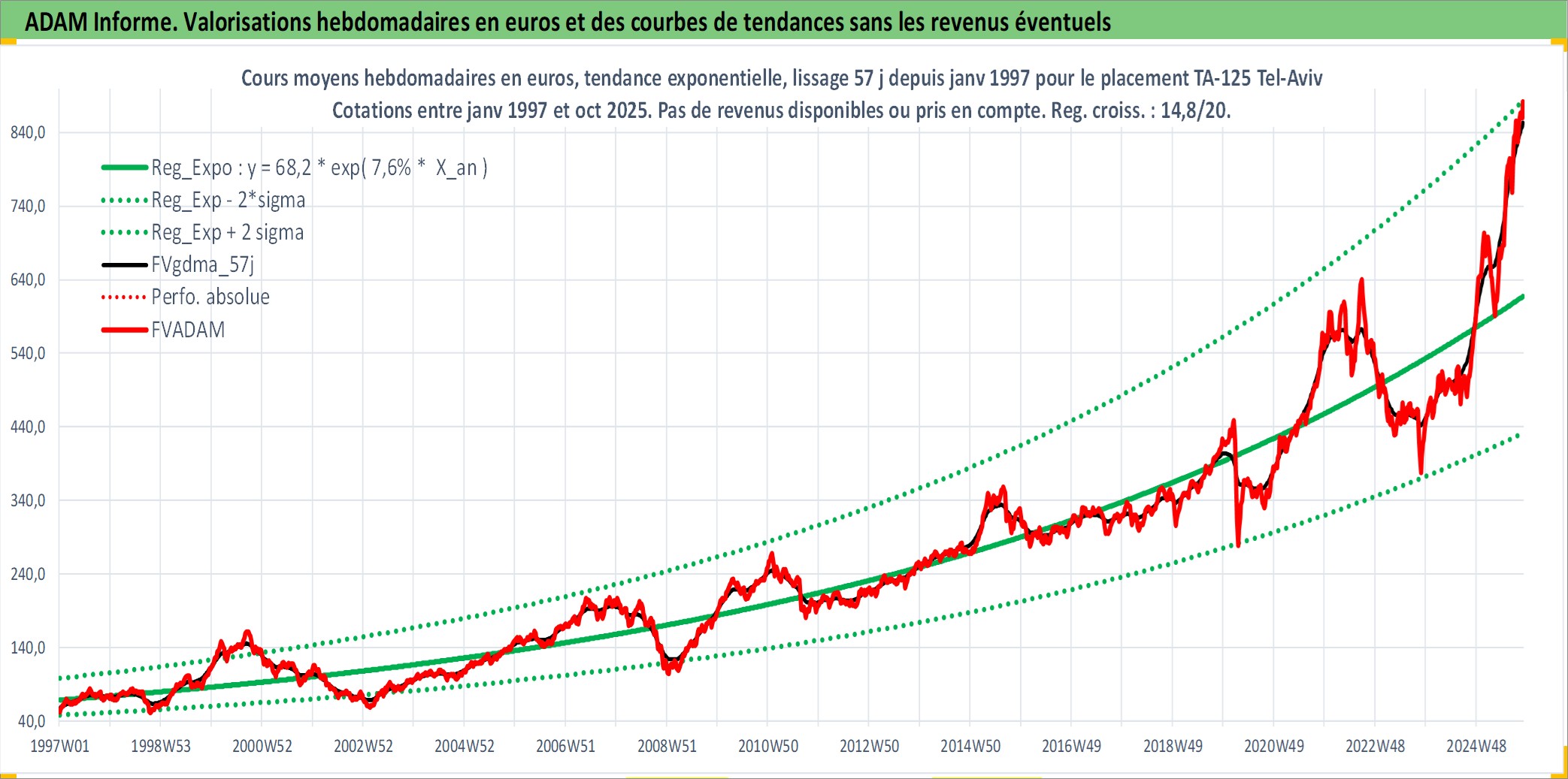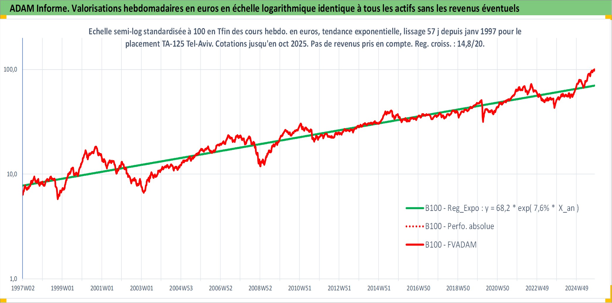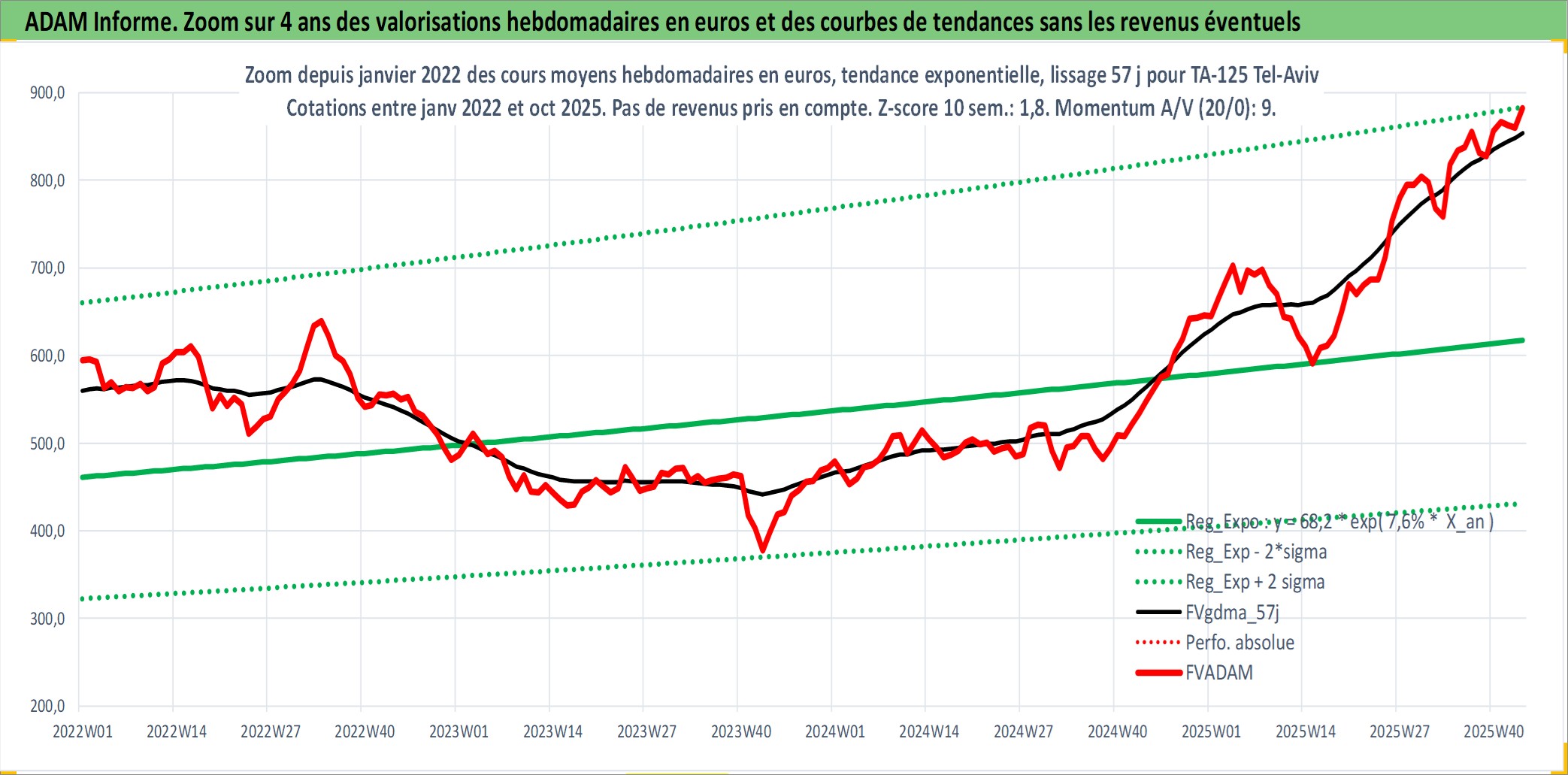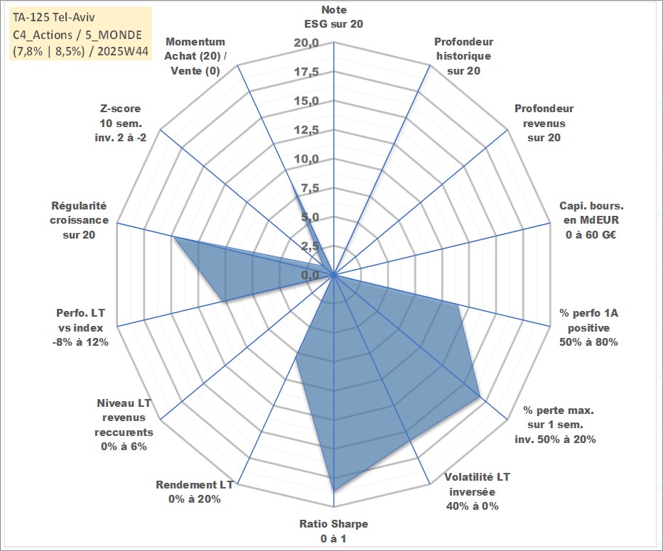 Site dédié aux investisseursPage dédiée sur site financeAnalyse des valorisations hebdomadaires de l'actif TA-125 Tel-Aviv. Cet actif est cote en ILS. Les valorisations sont en contrevaleur EURO et couvrent les semaines 1997W01 a 2025W44. Les revenus de cet actif financier ne sont pas connus car non existants ou non disponibles sur le site Yahoo Finance. La note ESG de cet actif n'est pas connue.