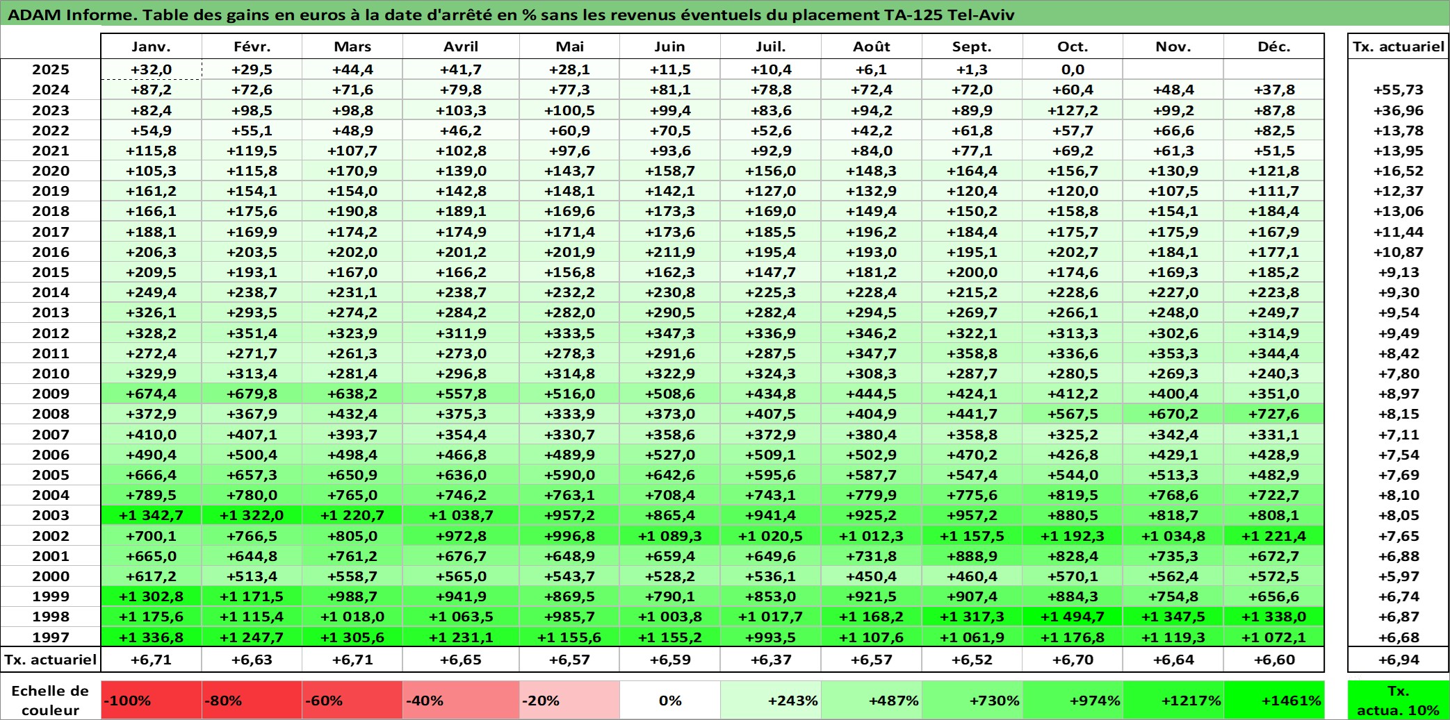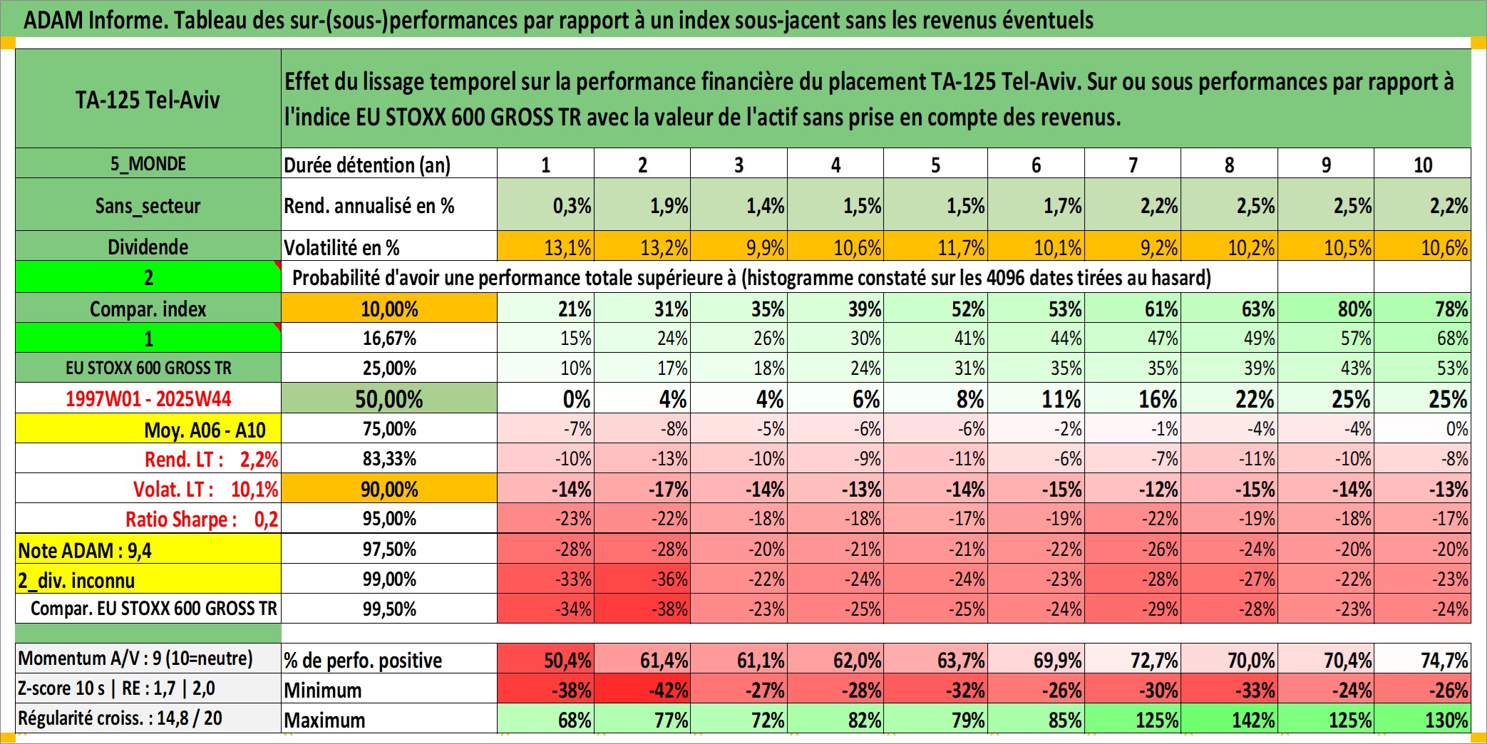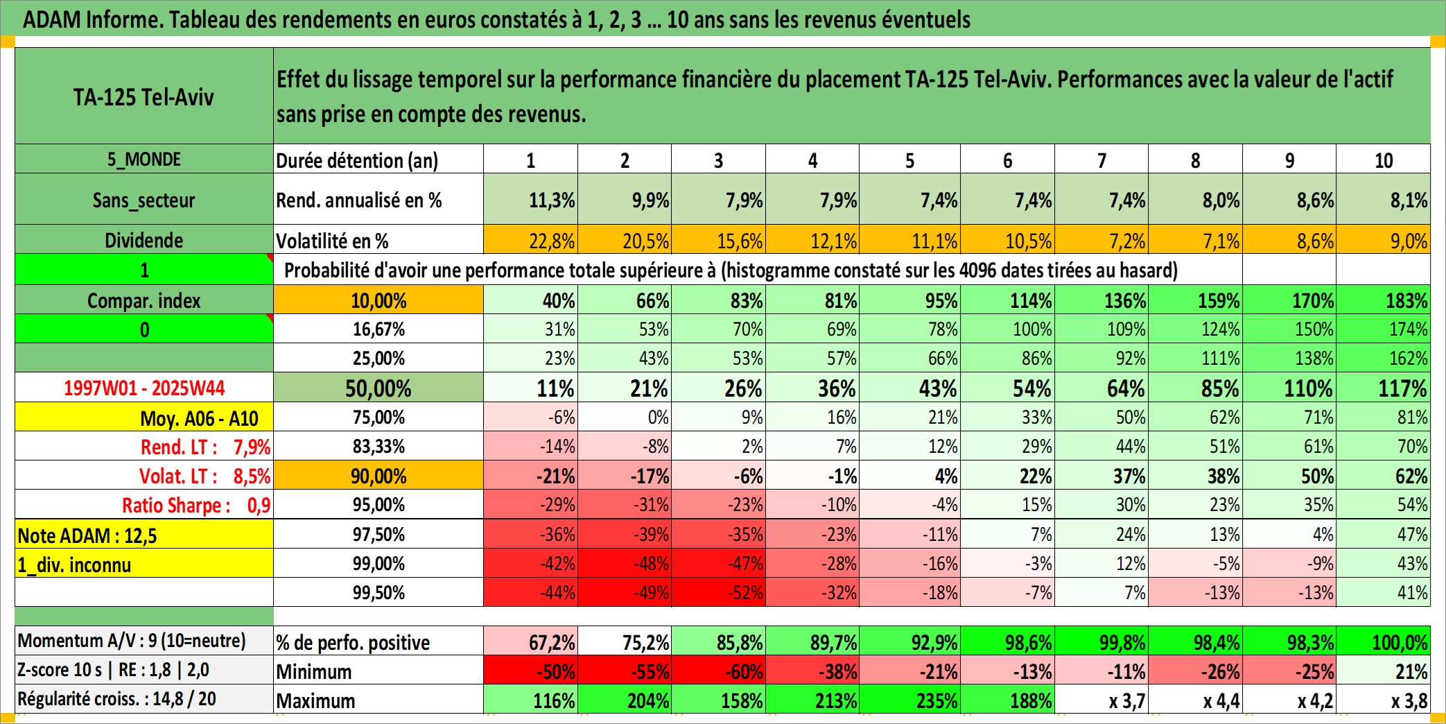 Site dédié aux investisseursPage dédiée sur site financeAnalyse des valorisations hebdomadaires de l'actif TA-125 Tel-Aviv. Cet actif est cote en ILS. Les valorisations sont en contrevaleur EURO et couvrent les semaines 1997W01 a 2025W44. Les revenus de cet actif financier ne sont pas connus car non existants ou non disponibles sur le site Yahoo Finance. La note ESG de cet actif n'est pas connue.