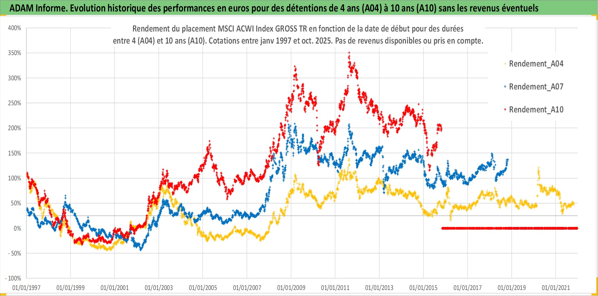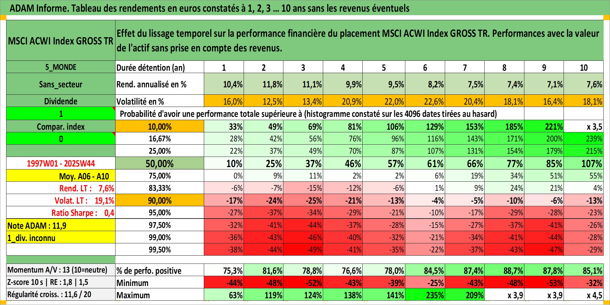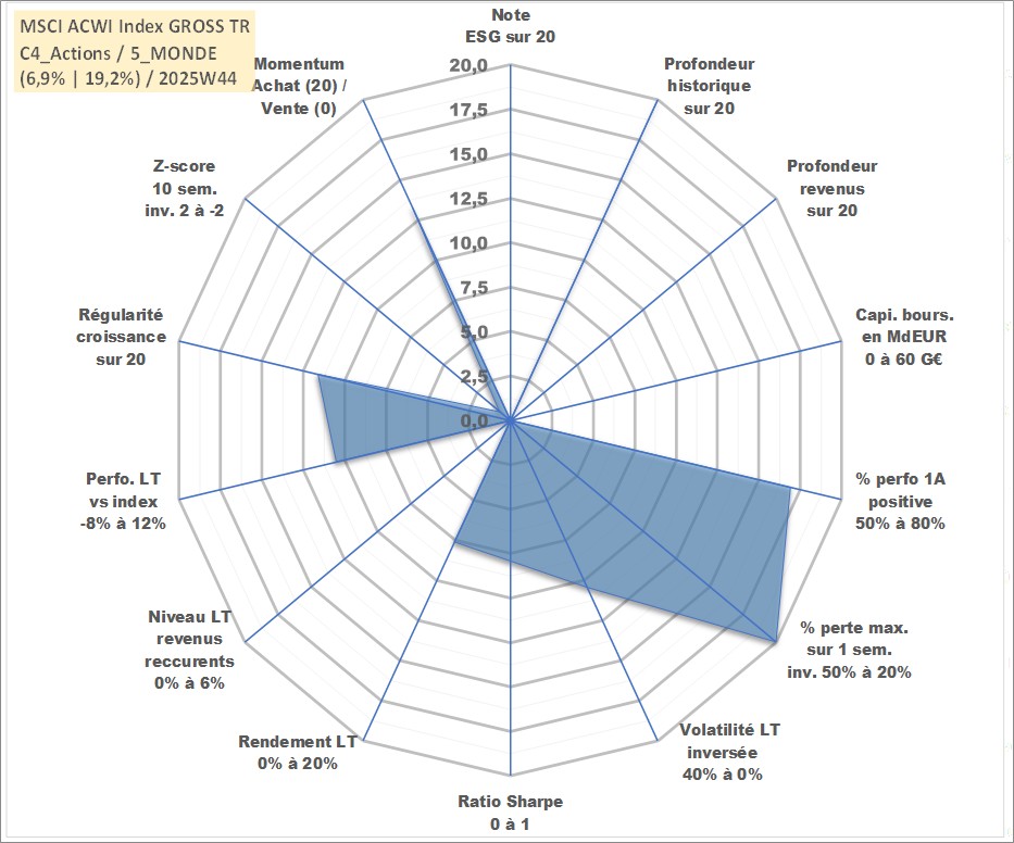 Site dédié aux investisseursPage dédiée sur site financeAnalyse des valorisations hebdomadaires de l'actif MSCI ACWI Index GROSS TR. Cet actif est cote en USD. Les valorisations sont en contrevaleur EURO et couvrent les semaines 1997W01 a 2025W44. Les revenus de cet actif financier ne sont pas connus car non existants ou non disponibles sur le site Yahoo Finance. La note ESG de cet actif n'est pas connue.