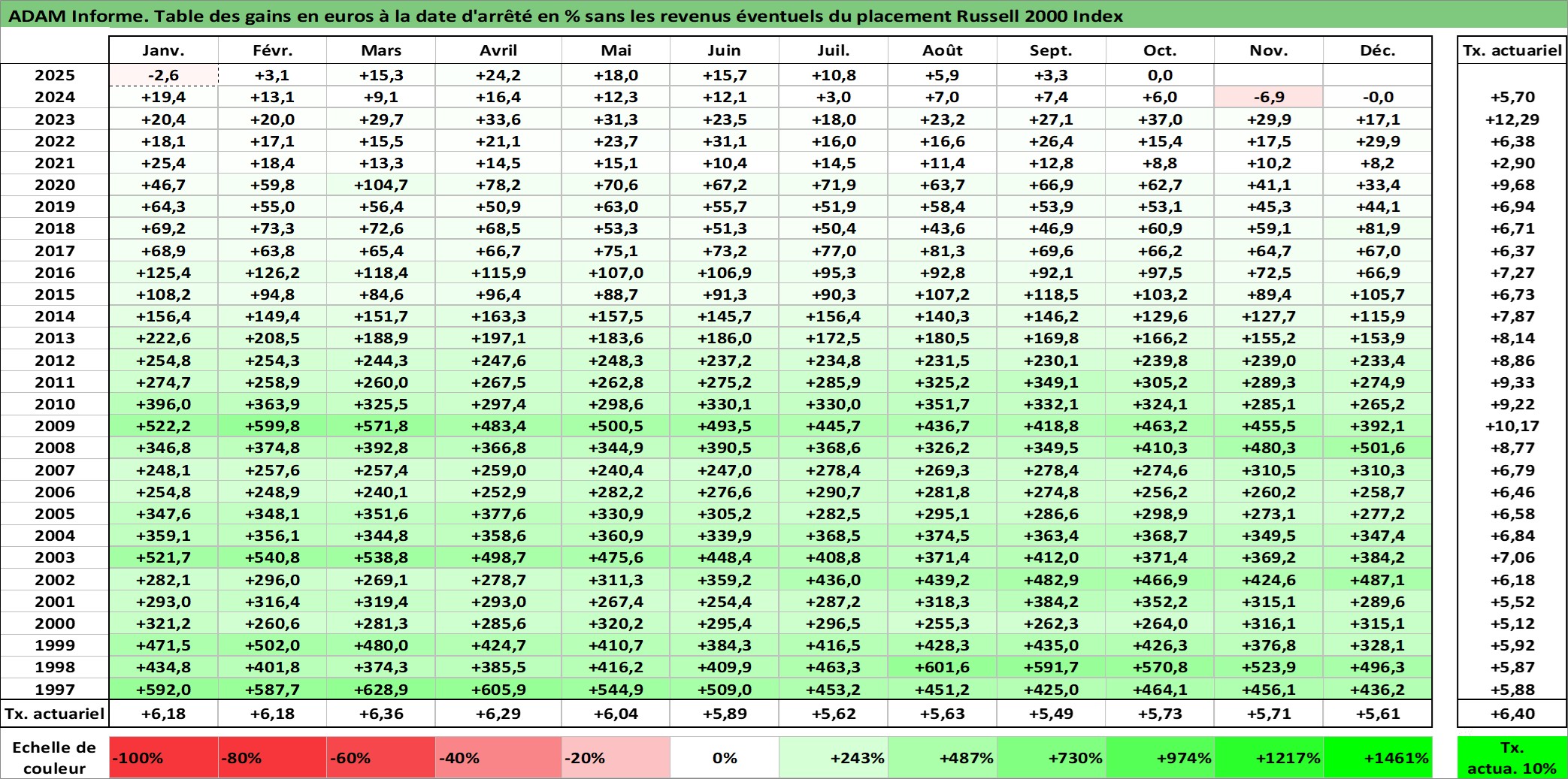 Site dédié aux investisseursPage dédiée sur site financeAnalyse des valorisations hebdomadaires de l'actif Russell 2000 Index. Cet actif est cote en USD. Les valorisations sont en contrevaleur EURO et couvrent les semaines 1997W01 a 2025W44. Les revenus de cet actif financier ne sont pas connus car non existants ou non disponibles sur le site Yahoo Finance. La note ESG de cet actif n'est pas connue.
