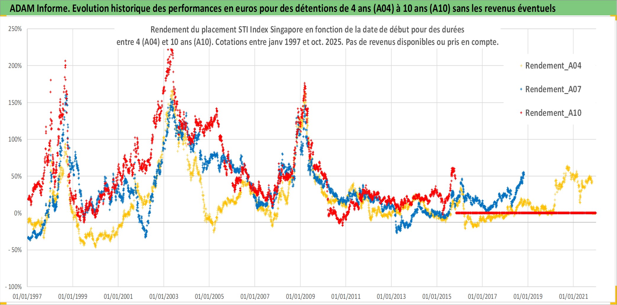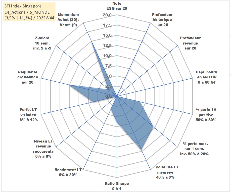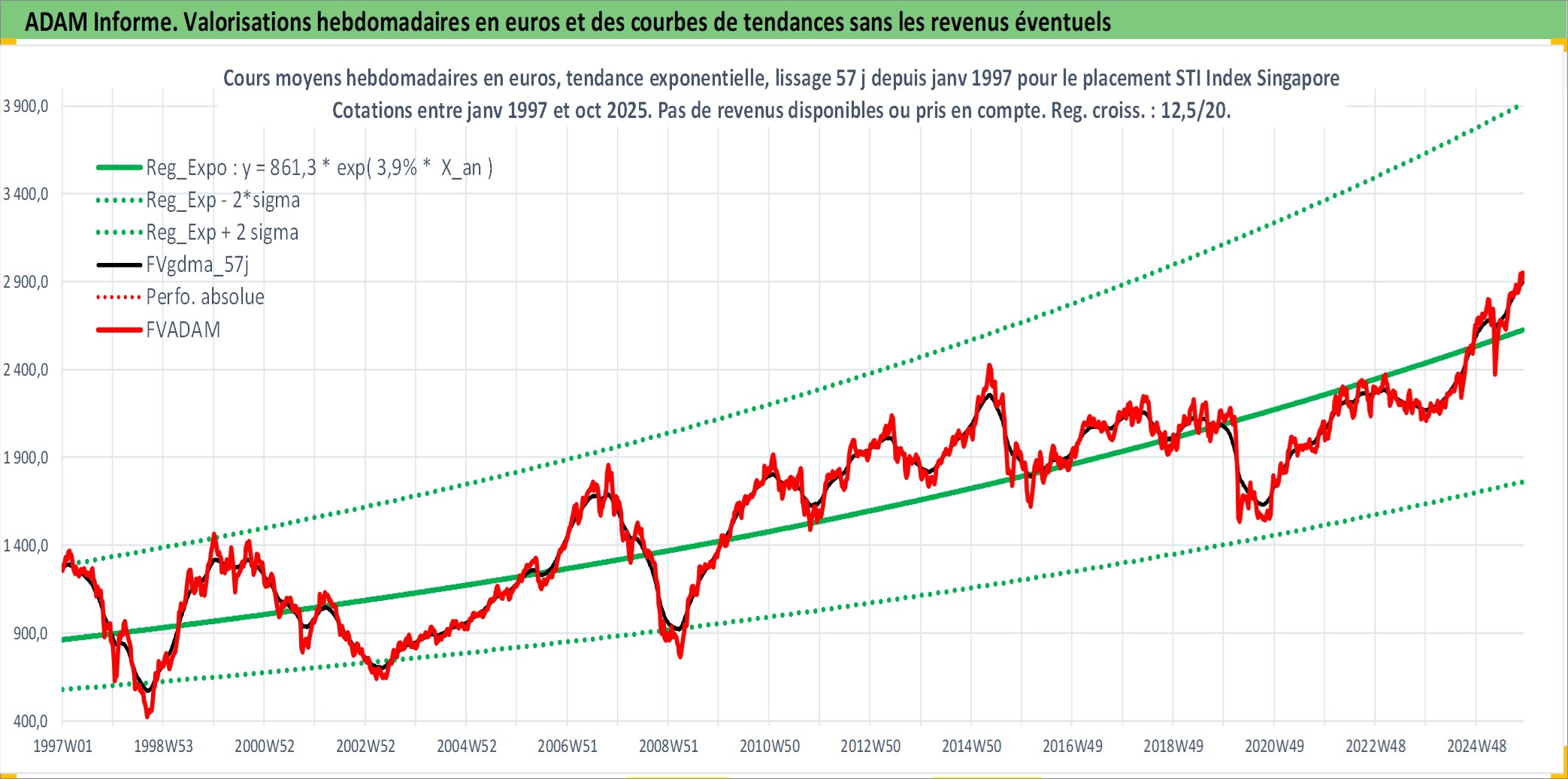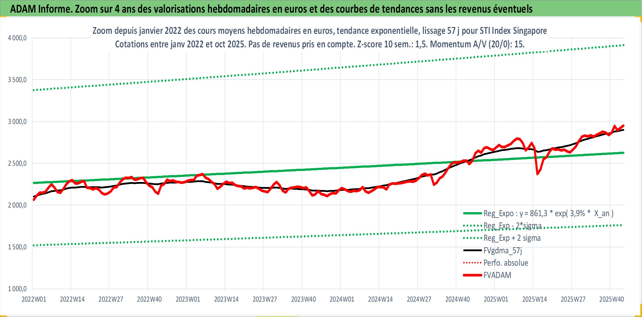 Site dédié aux investisseursPage dédiée sur site financeAnalyse des valorisations hebdomadaires de l'actif STI Index Singapore. Cet actif est cote en SGD. Les valorisations sont en contrevaleur EURO et couvrent les semaines 1997W01 a 2025W44. Les revenus de cet actif financier ne sont pas connus car non existants ou non disponibles sur le site Yahoo Finance. La note ESG de cet actif n'est pas connue.