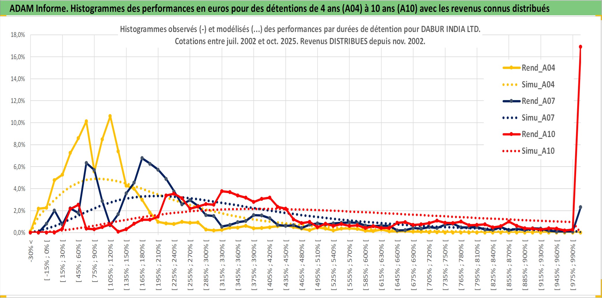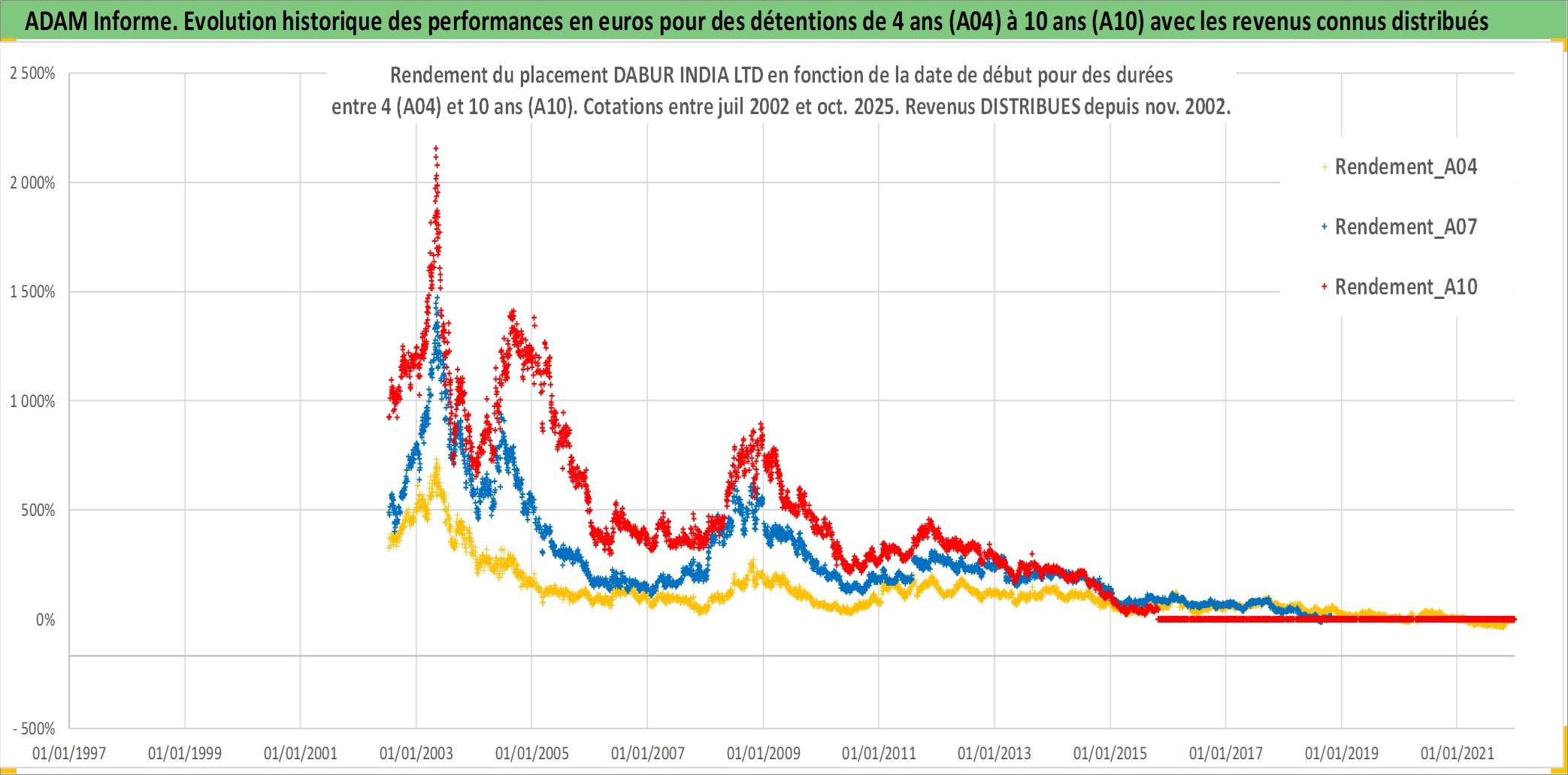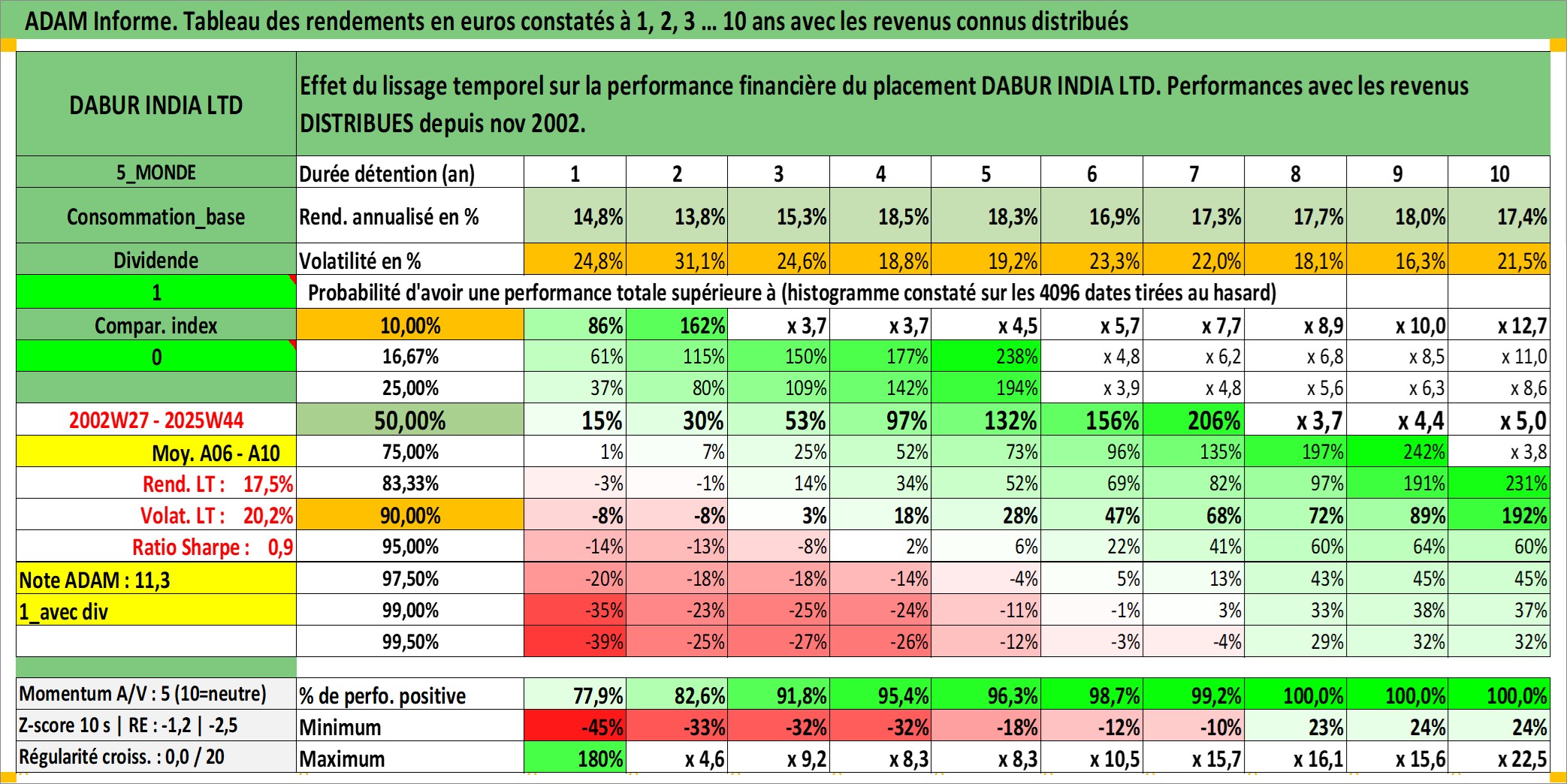 Site dédié aux investisseursPage dédiée sur site financeAnalyse des valorisations hebdomadaires de l'action DABUR INDIA LTD. Cet actif est cote en INR. Les valorisations sont en contrevaleur EURO et couvrent les semaines 2002W27 a 2025W44. Les revenus de cet actif financier sont pris en compte depuis la semaine 2002W46. La note globale ESG de cet actif est estimee a 5.0 (apres rebasage entre 0 et 20).