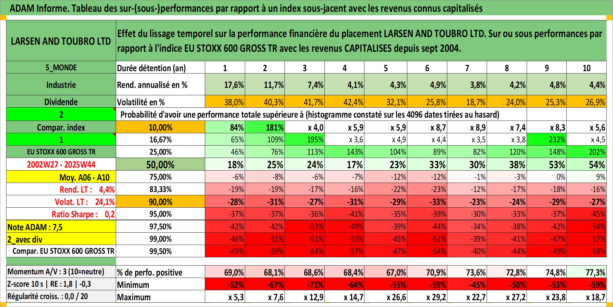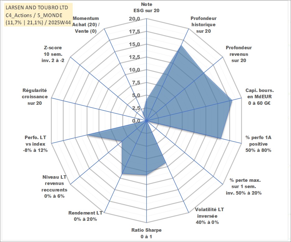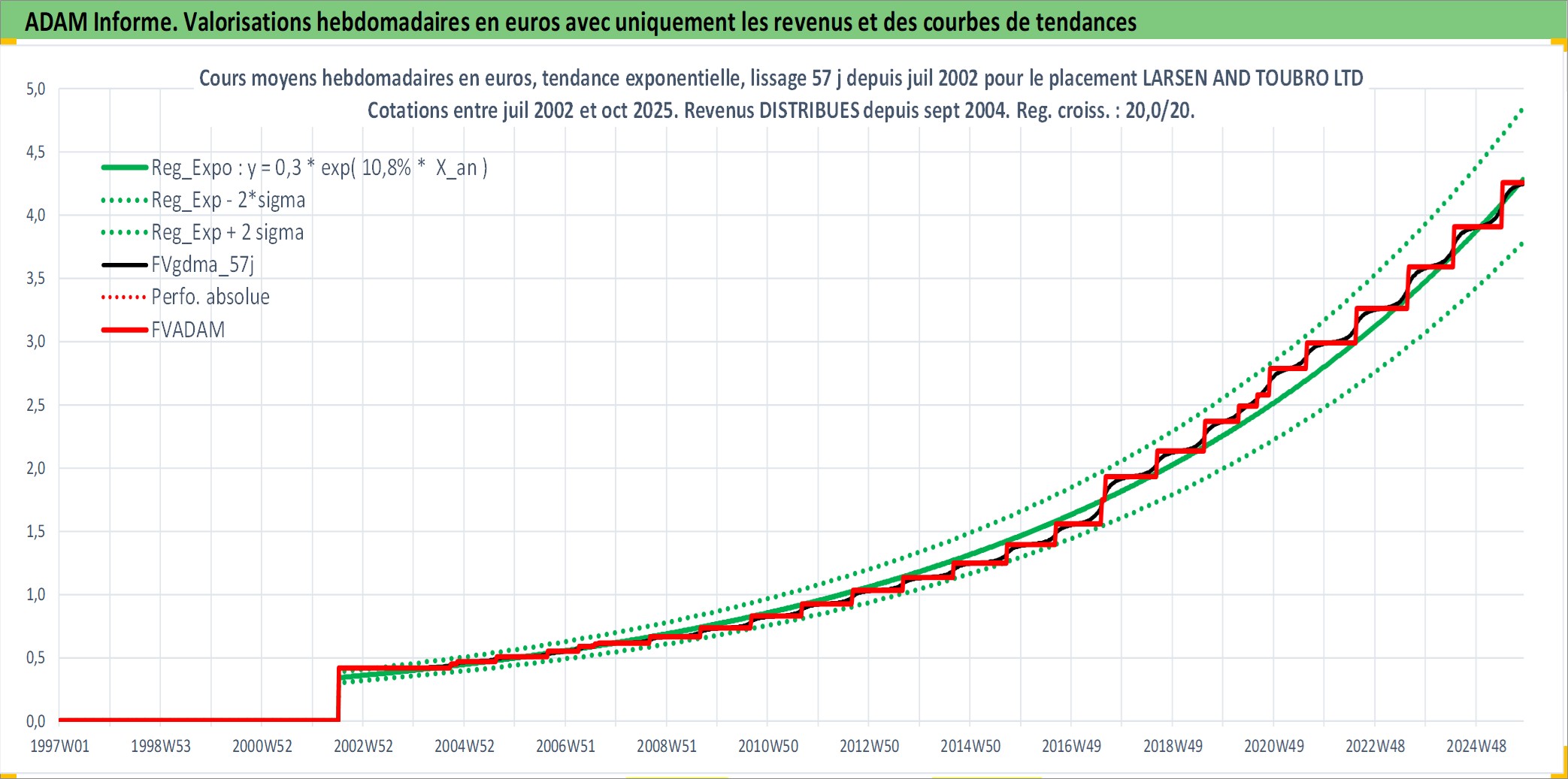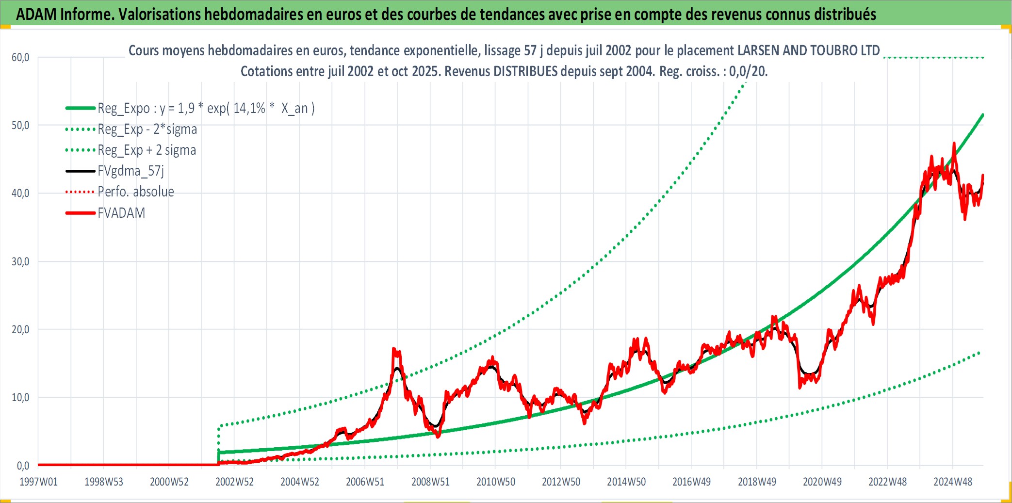 Site dédié aux investisseursPage dédiée sur site financeAnalyse des valorisations hebdomadaires de l'action LARSEN AND TOUBRO LTD. Cet actif est cote en INR. Les valorisations sont en contrevaleur EURO et couvrent les semaines 2002W27 a 2025W44. Les revenus de cet actif financier sont pris en compte depuis la semaine 2004W38. La note globale ESG de cet actif est estimee a 4.0 (apres rebasage entre 0 et 20).