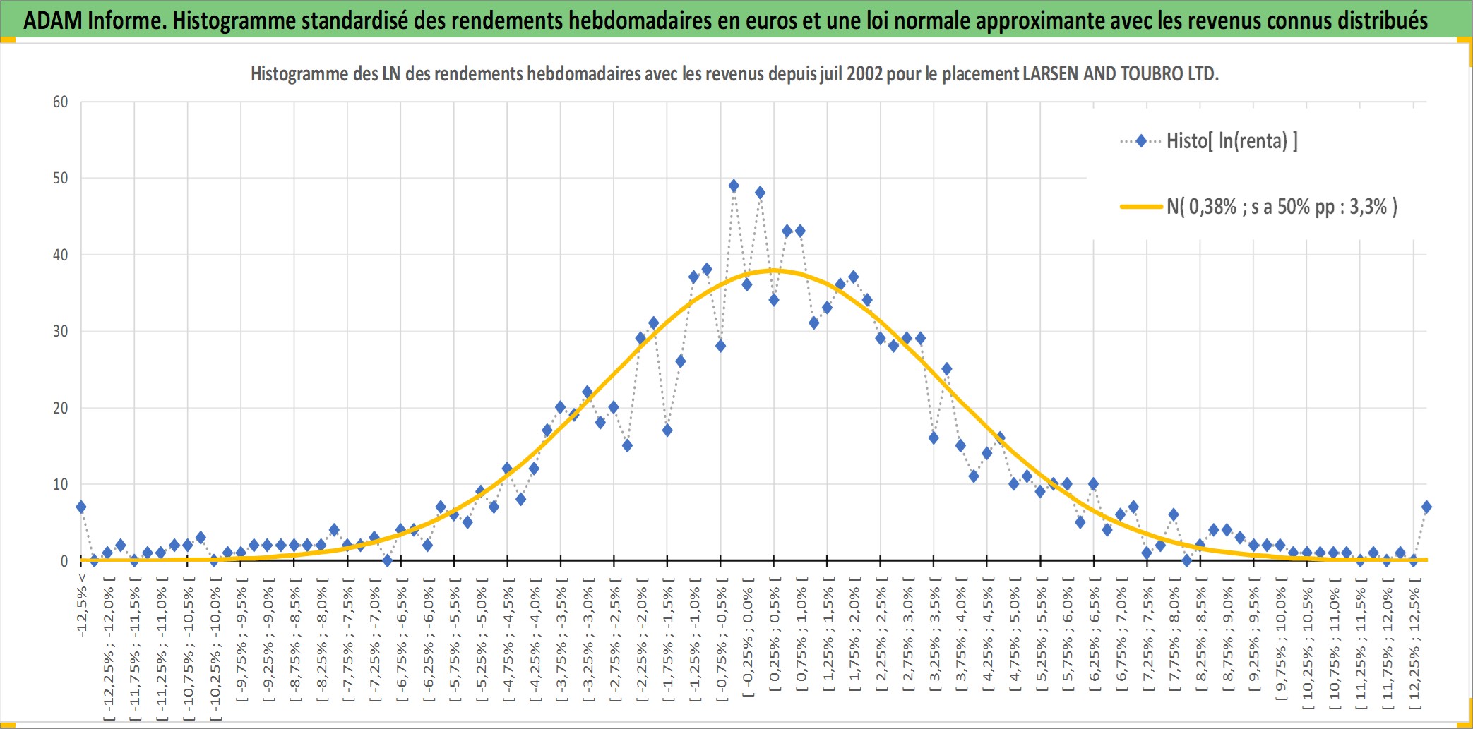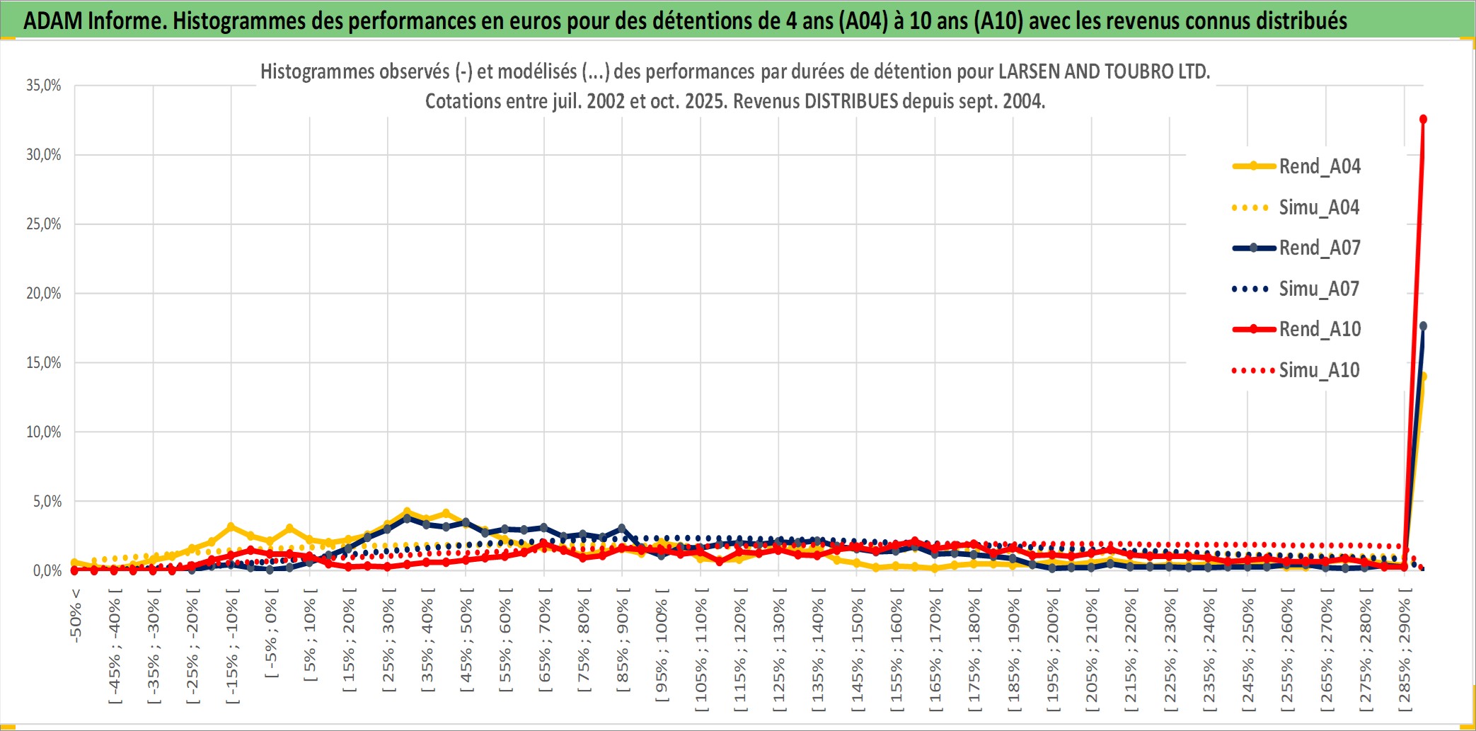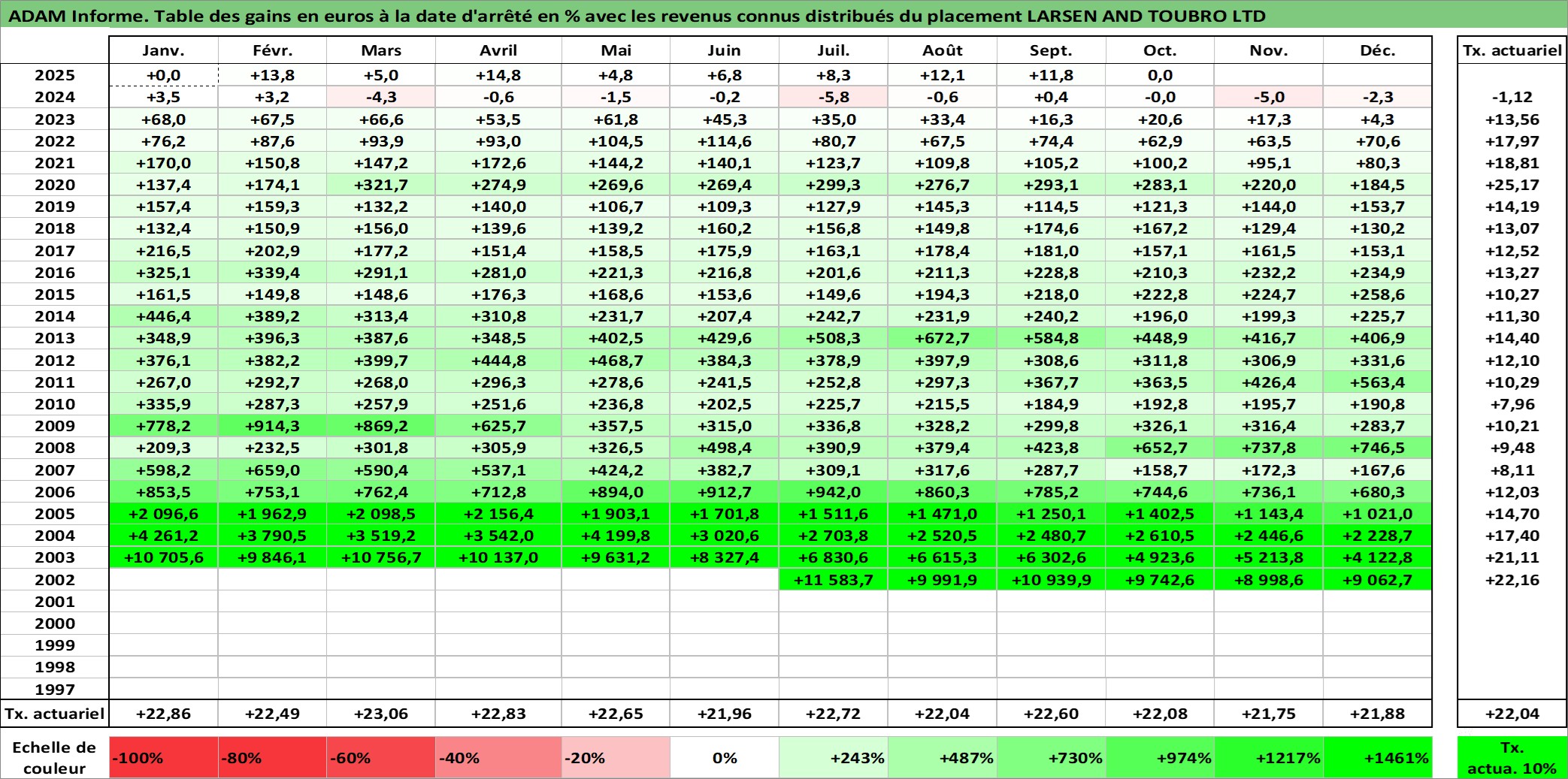 Site dédié aux investisseursPage dédiée sur site financeAnalyse des valorisations hebdomadaires de l'action LARSEN AND TOUBRO LTD. Cet actif est cote en INR. Les valorisations sont en contrevaleur EURO et couvrent les semaines 2002W27 a 2025W44. Les revenus de cet actif financier sont pris en compte depuis la semaine 2004W38. La note globale ESG de cet actif est estimee a 4.0 (apres rebasage entre 0 et 20).