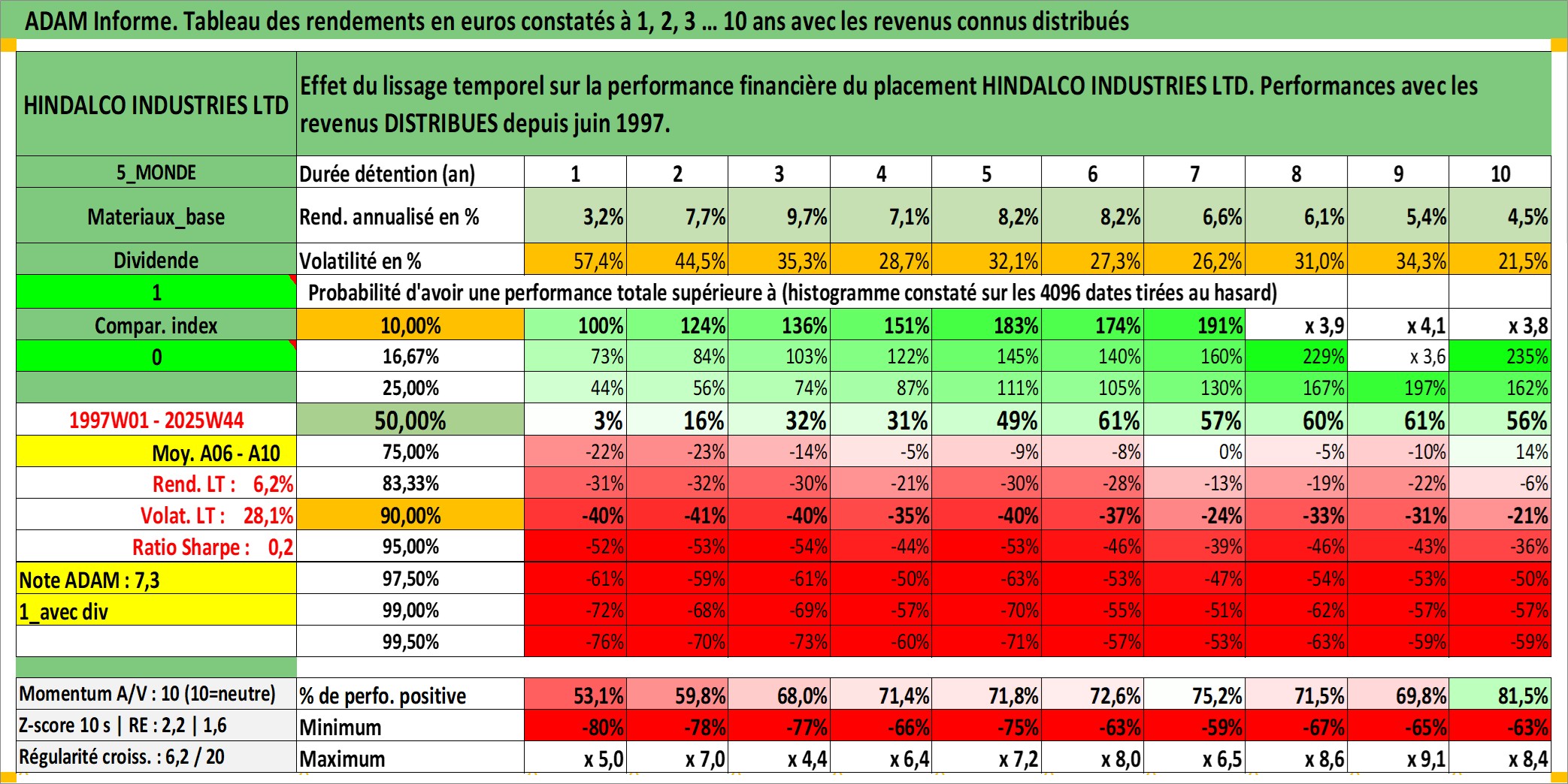Site dédié aux investisseursPage dédiée sur site financeAnalyse des valorisations hebdomadaires de l'action HINDALCO INDUSTRIES LTD. Cet actif est cote en INR. Les valorisations sont en contrevaleur EURO et couvrent les semaines 1997W01 a 2025W44. Les revenus de cet actif financier sont pris en compte depuis la semaine 1997W24. La note globale ESG de cet actif est estimee a 4.0 (apres rebasage entre 0 et 20).