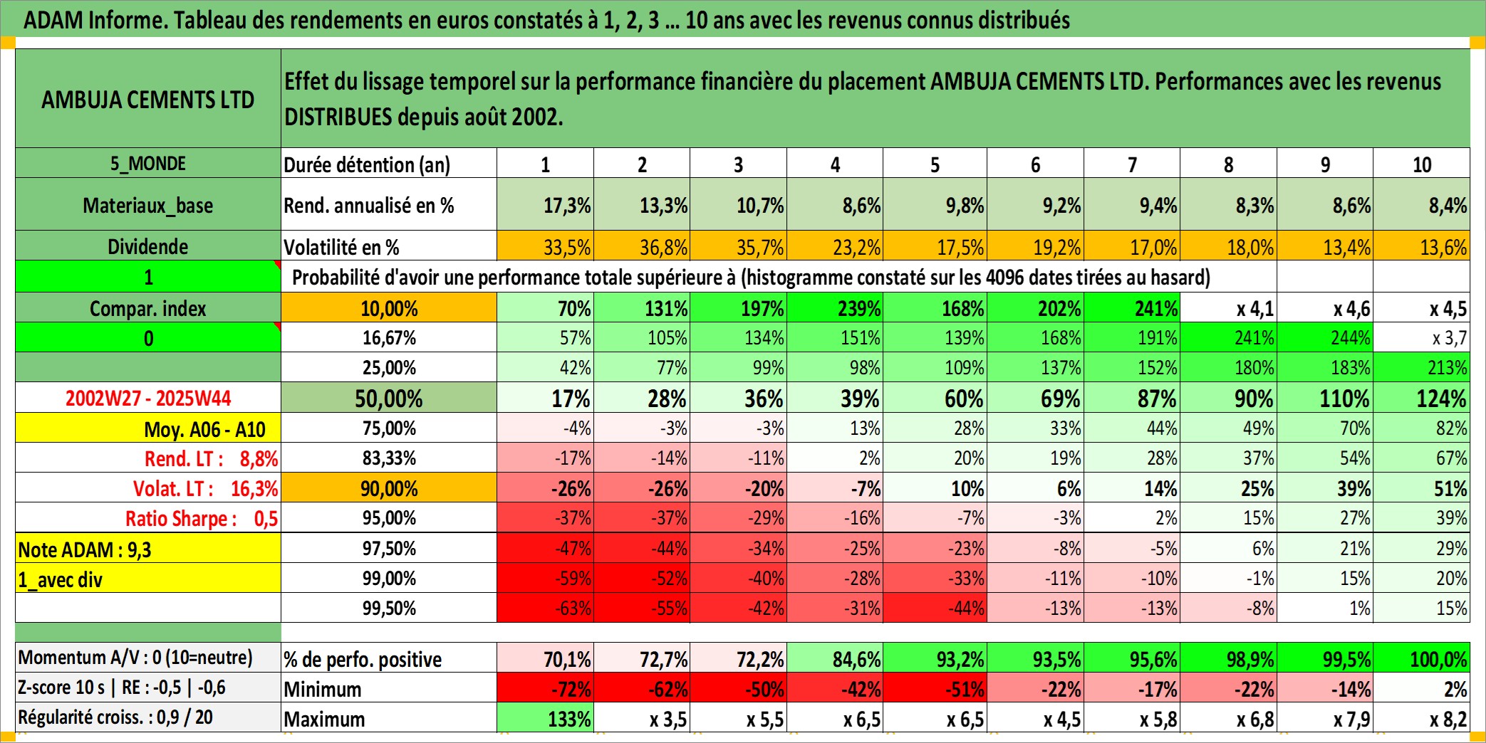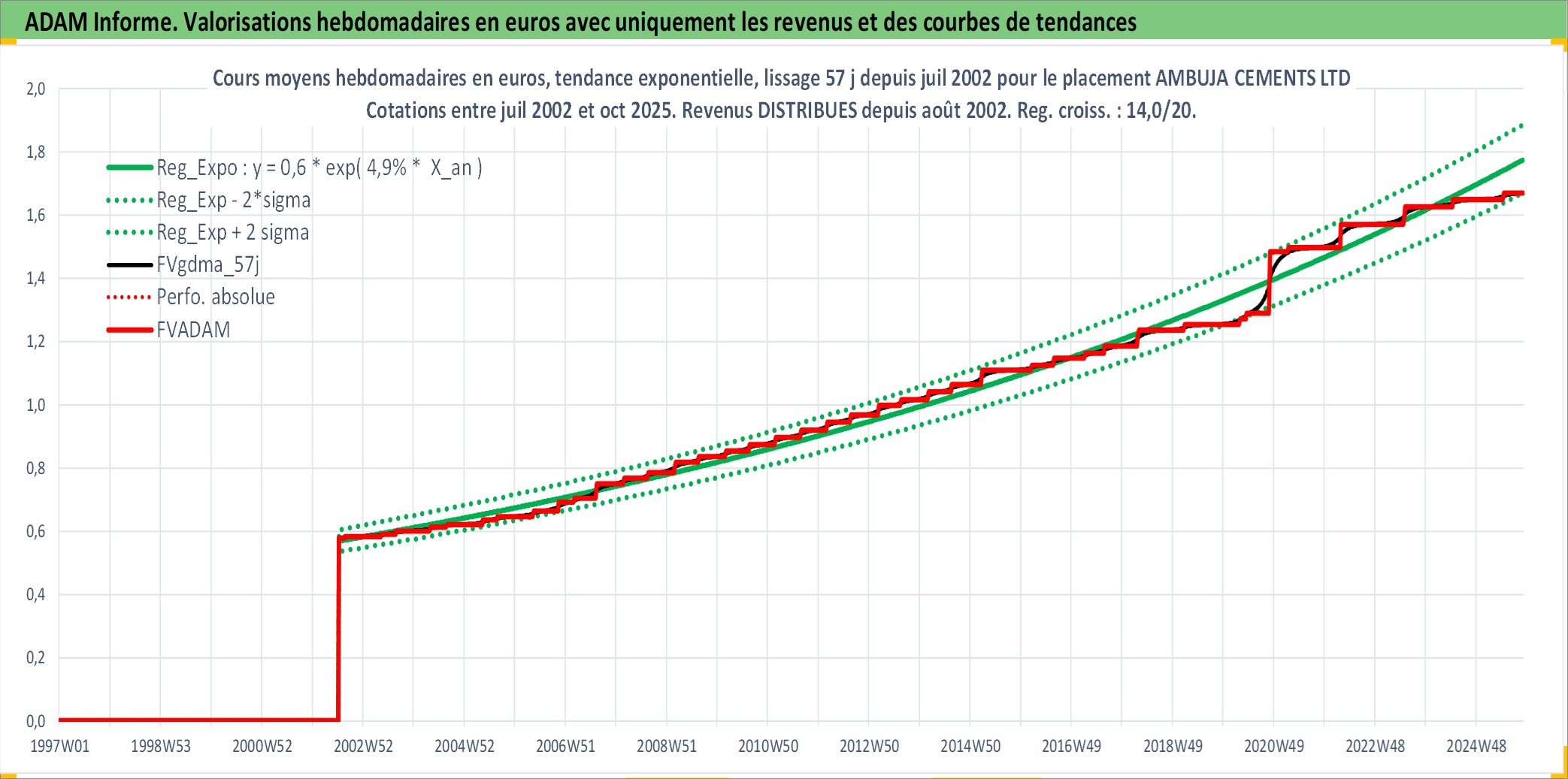 Site dédié aux investisseursPage dédiée sur site financeAnalyse des valorisations hebdomadaires de l'action AMBUJA CEMENTS LTD. Cet actif est cote en INR. Les valorisations sont en contrevaleur EURO et couvrent les semaines 2002W27 a 2025W44. Les revenus de cet actif financier sont pris en compte depuis la semaine 2002W33. La note globale ESG de cet actif est estimee a 8.0 (apres rebasage entre 0 et 20).