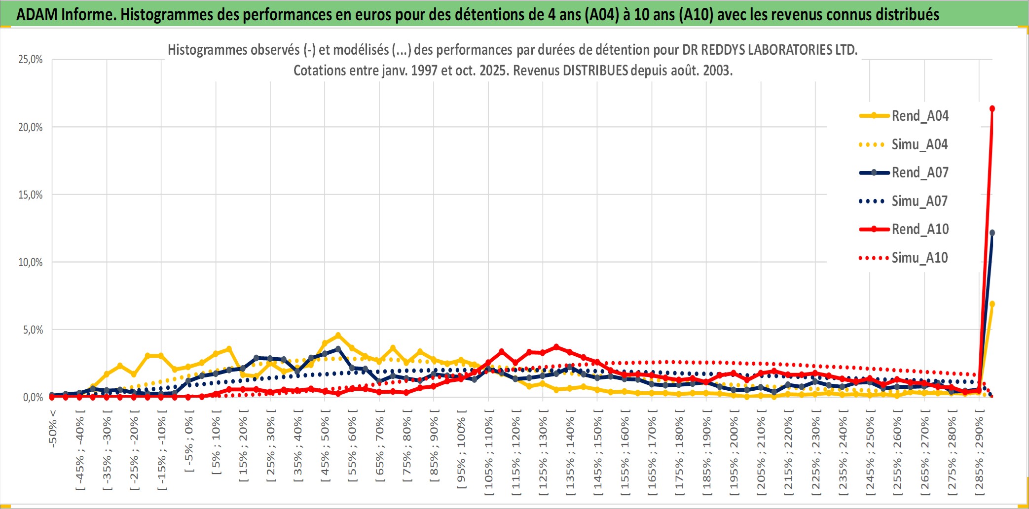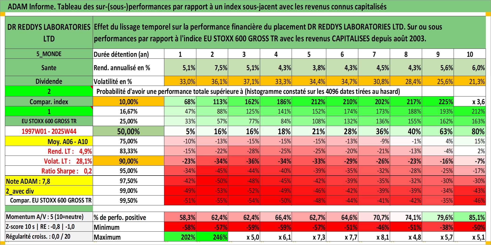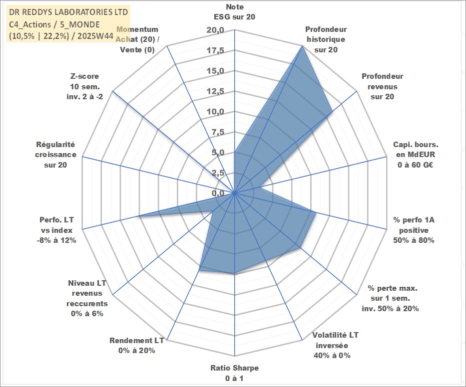 Site dédié aux investisseursPage dédiée sur site financeAnalyse des valorisations hebdomadaires de l'action DR REDDYS LABORATORIES LTD. Cet actif est cote en INR. Les valorisations sont en contrevaleur EURO et couvrent les semaines 1997W01 a 2025W44. Les revenus de cet actif financier sont pris en compte depuis la semaine 2003W32. La note globale ESG de cet actif est estimee a 5.0 (apres rebasage entre 0 et 20).