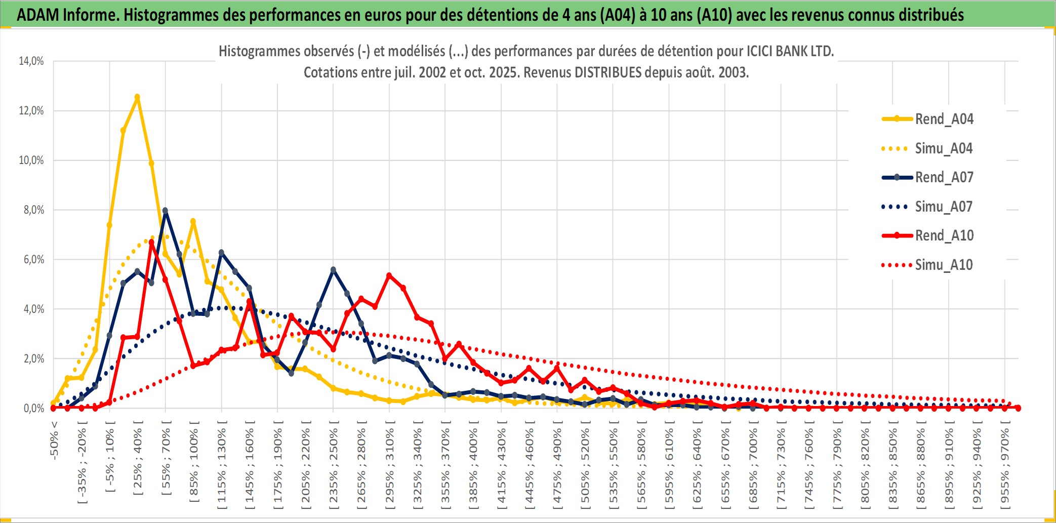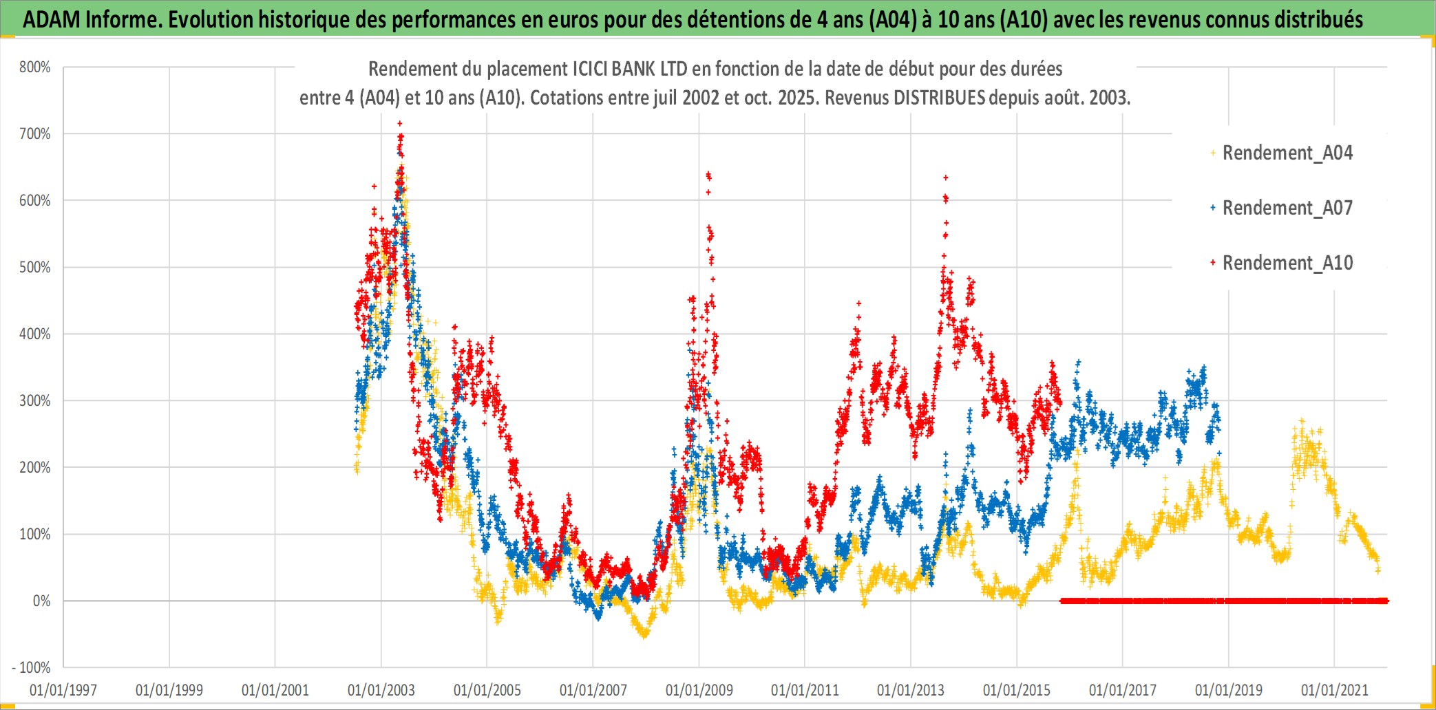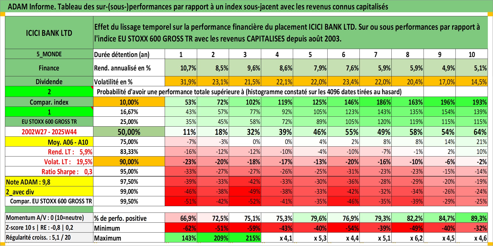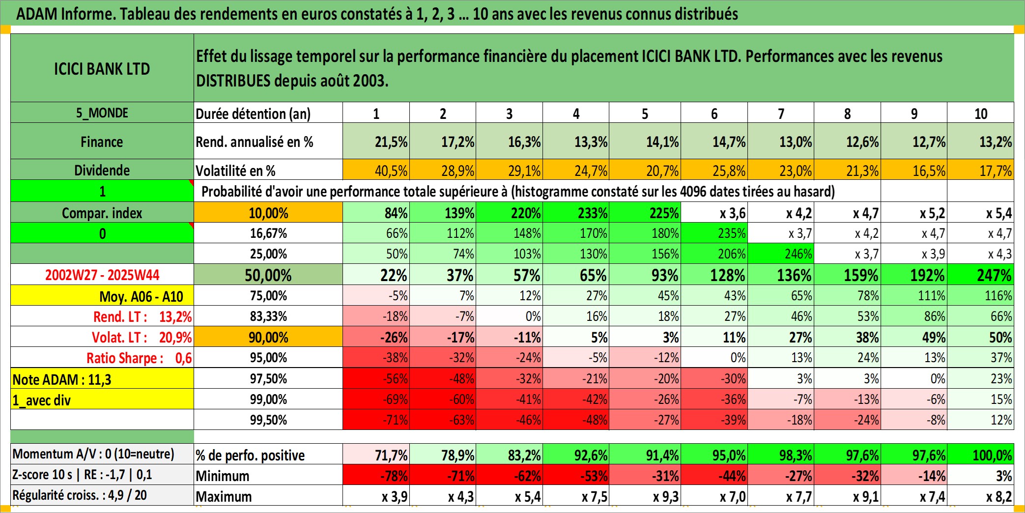 Site dédié aux investisseursPage dédiée sur site financeAnalyse des valorisations hebdomadaires de l'action ICICI BANK LTD. Cet actif est cote en INR. Les valorisations sont en contrevaleur EURO et couvrent les semaines 2002W27 a 2025W44. Les revenus de cet actif financier sont pris en compte depuis la semaine 2003W32. La note globale ESG de cet actif est estimee a 7.0 (apres rebasage entre 0 et 20).