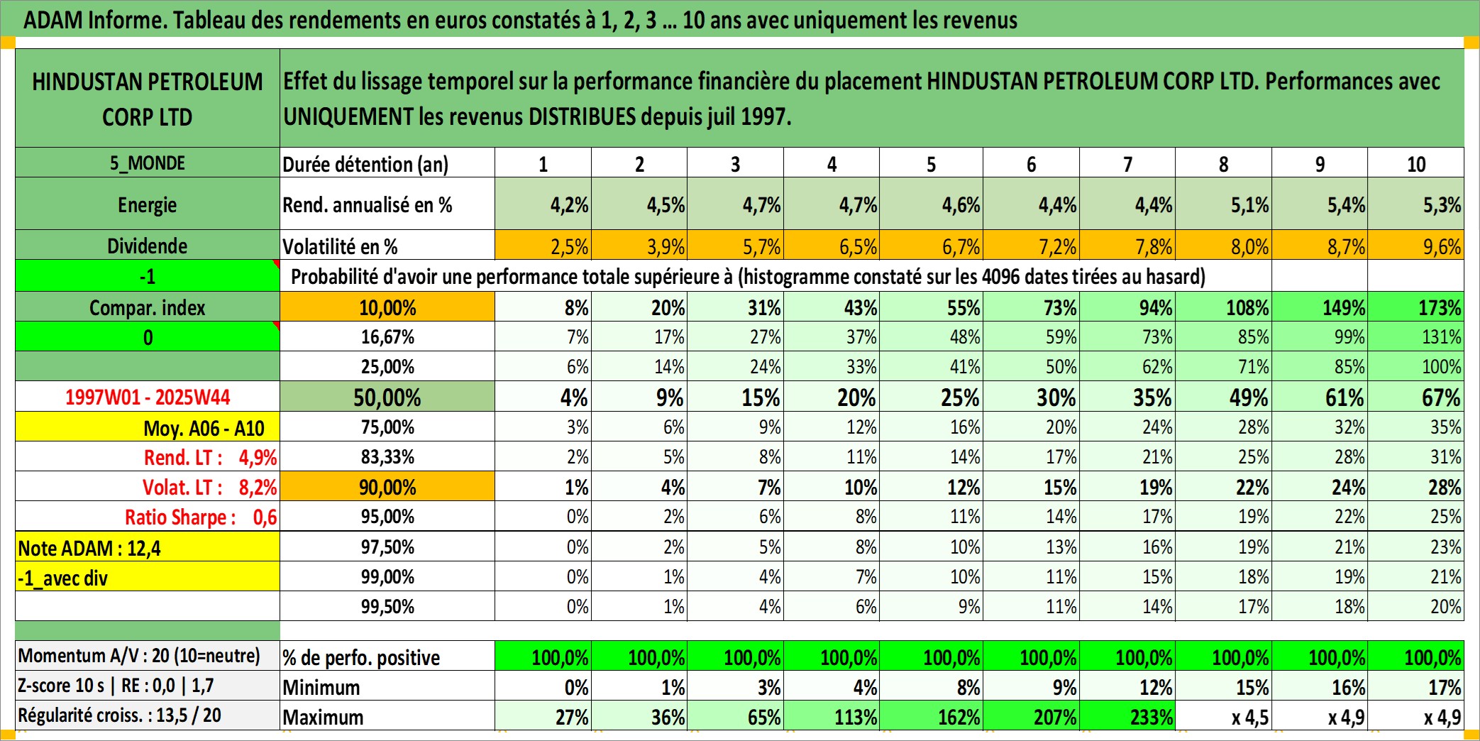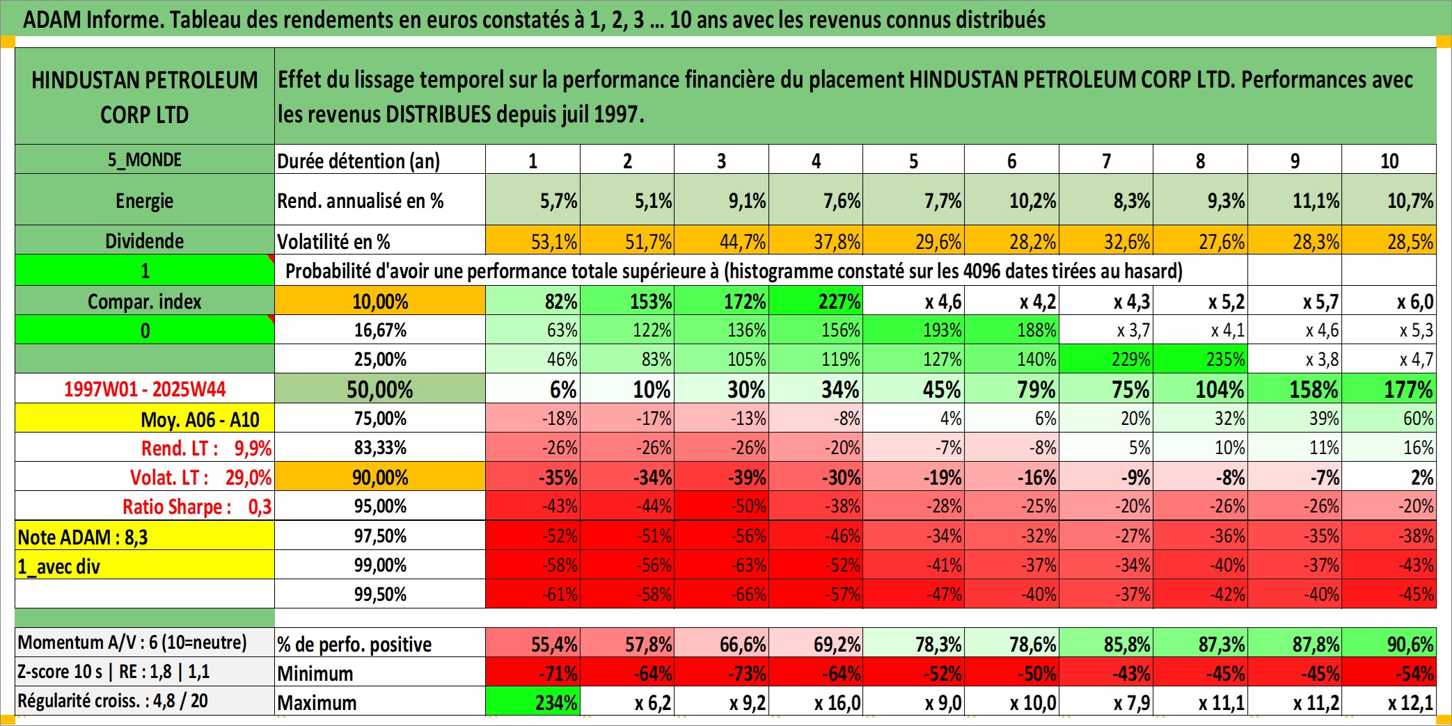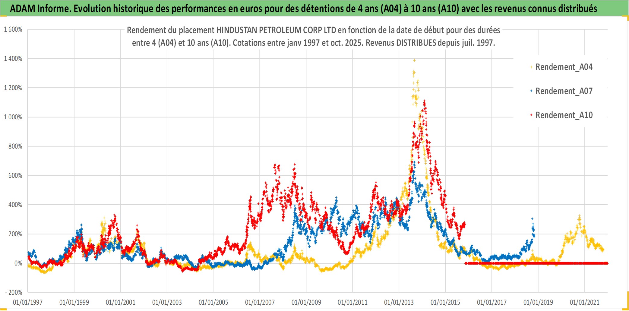 Site dédié aux investisseursPage dédiée sur site financeAnalyse des valorisations hebdomadaires de l'action HINDUSTAN PETROLEUM CORP LTD. Cet actif est cote en INR. Les valorisations sont en contrevaleur EURO et couvrent les semaines 1997W01 a 2025W44. Les revenus de cet actif financier sont pris en compte depuis la semaine 1997W29. La note globale ESG de cet actif est estimee a 2.0 (apres rebasage entre 0 et 20).