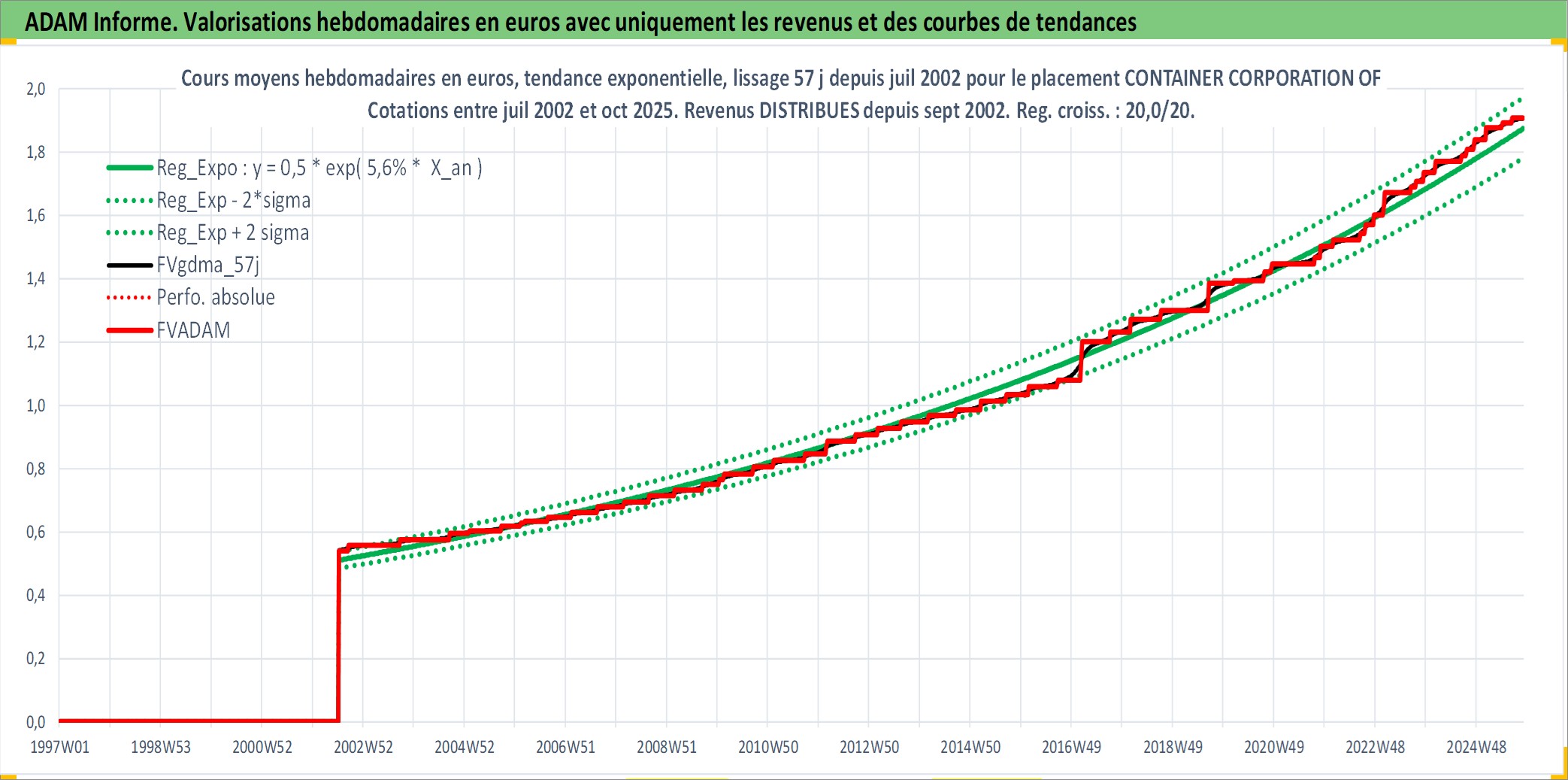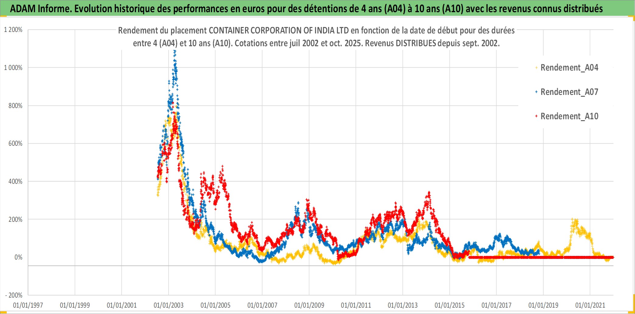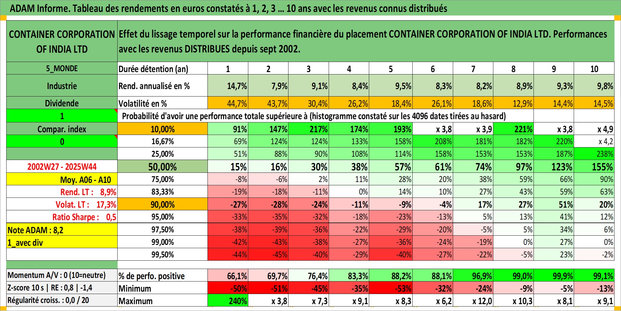 Site dédié aux investisseursPage dédiée sur site financeAnalyse des valorisations hebdomadaires de l'action CONTAINER CORPORATION OF INDIA LTD. Cet actif est cote en INR. Les valorisations sont en contrevaleur EURO et couvrent les semaines 2002W27 a 2025W44. Les revenus de cet actif financier sont pris en compte depuis la semaine 2002W37. La note ESG de cet actif n'est pas connue.