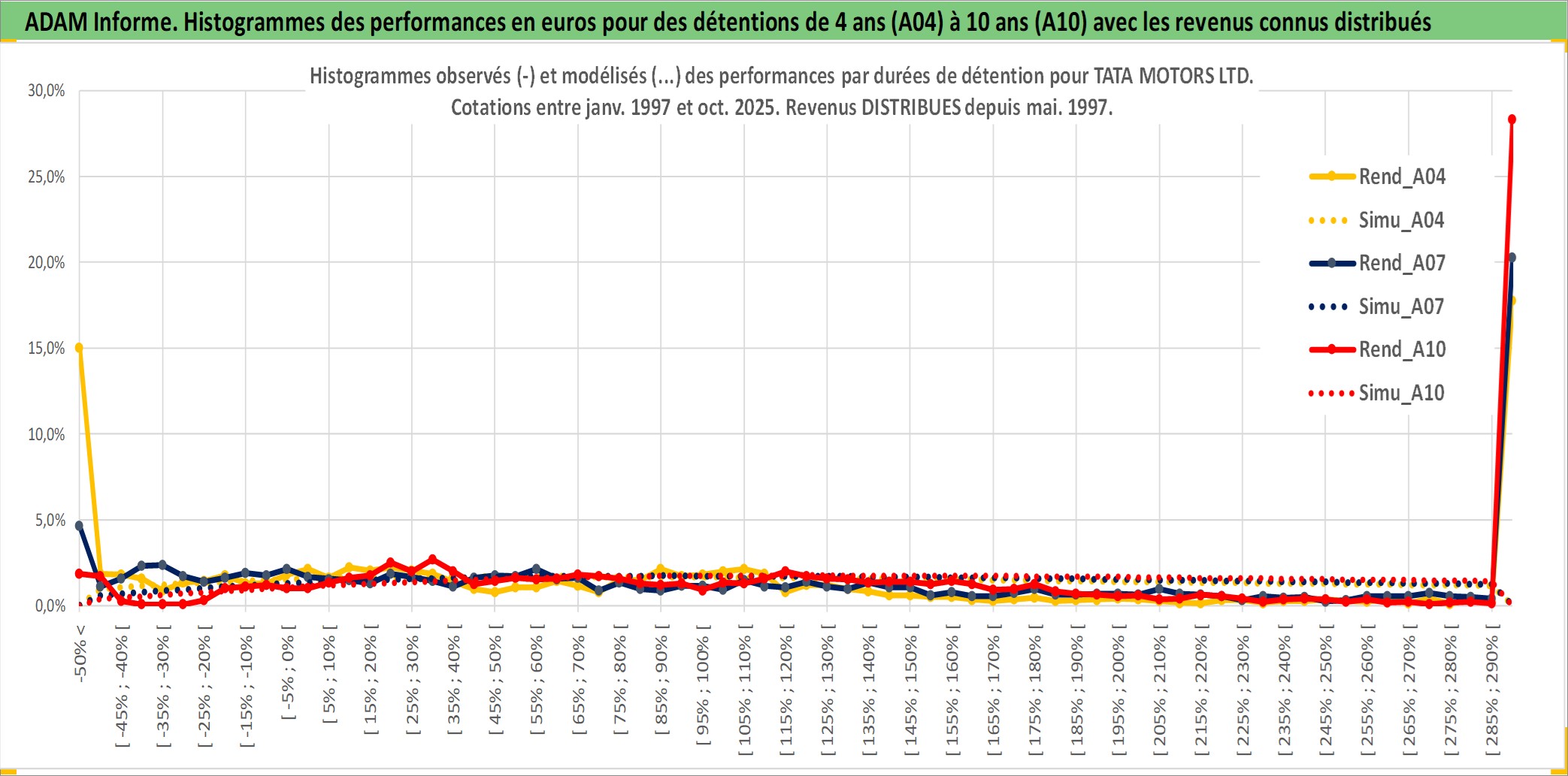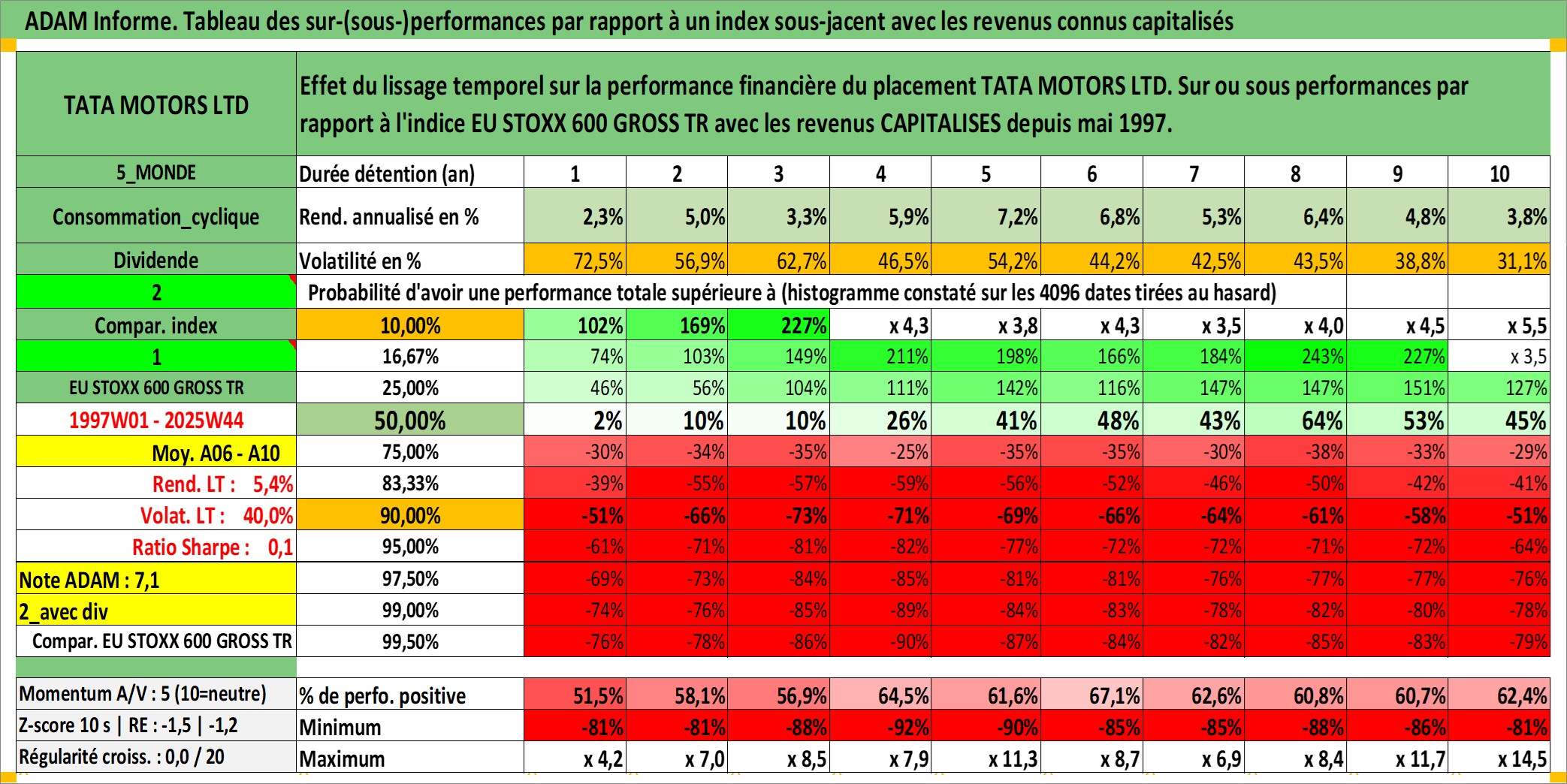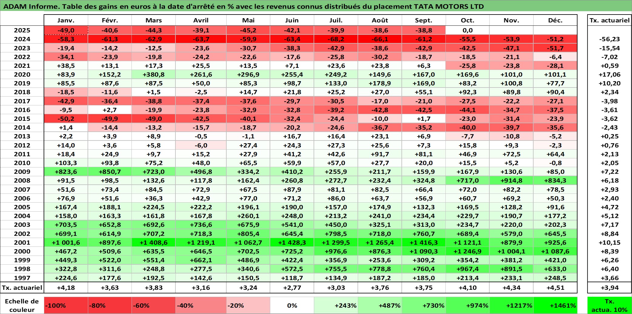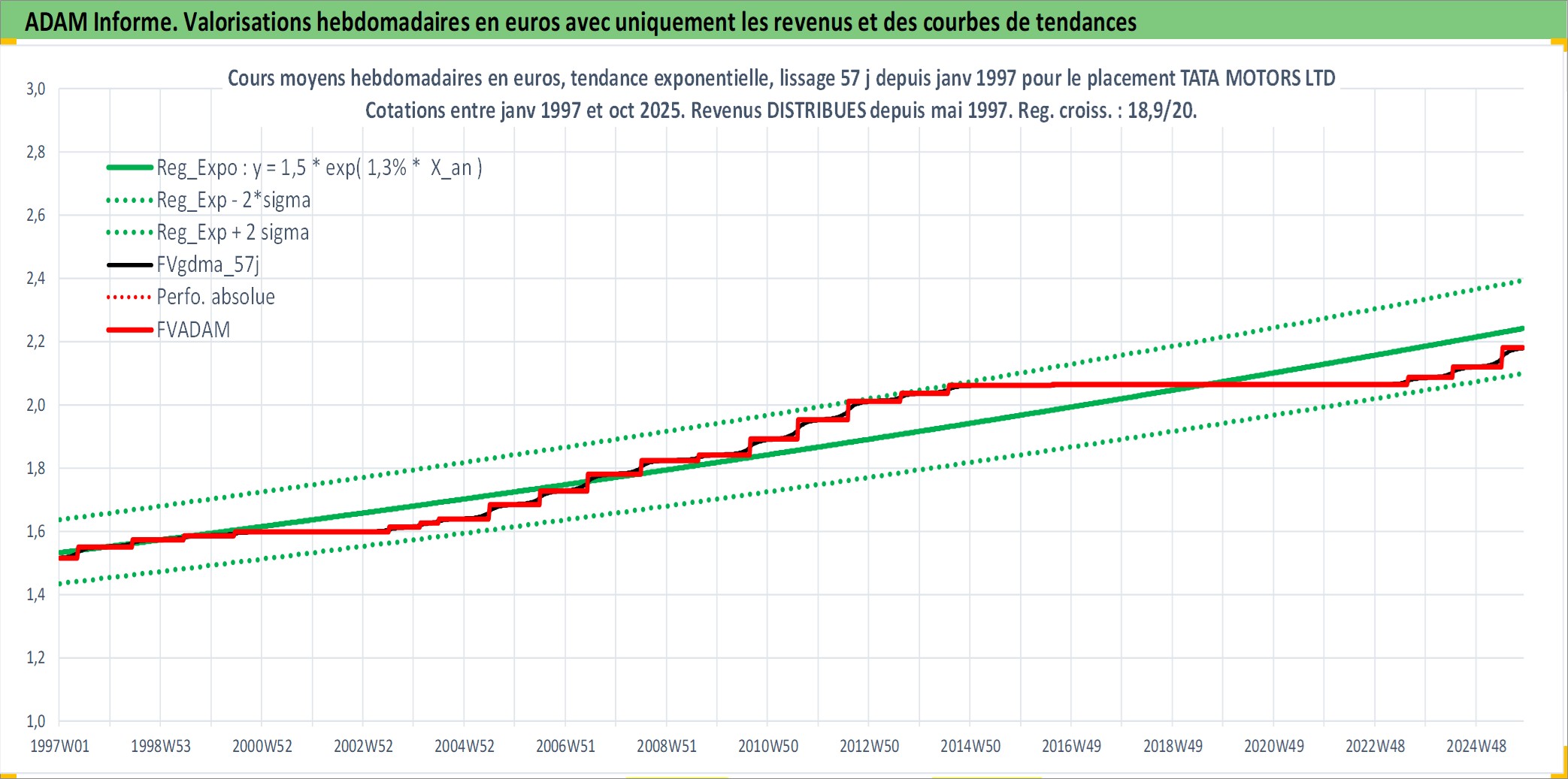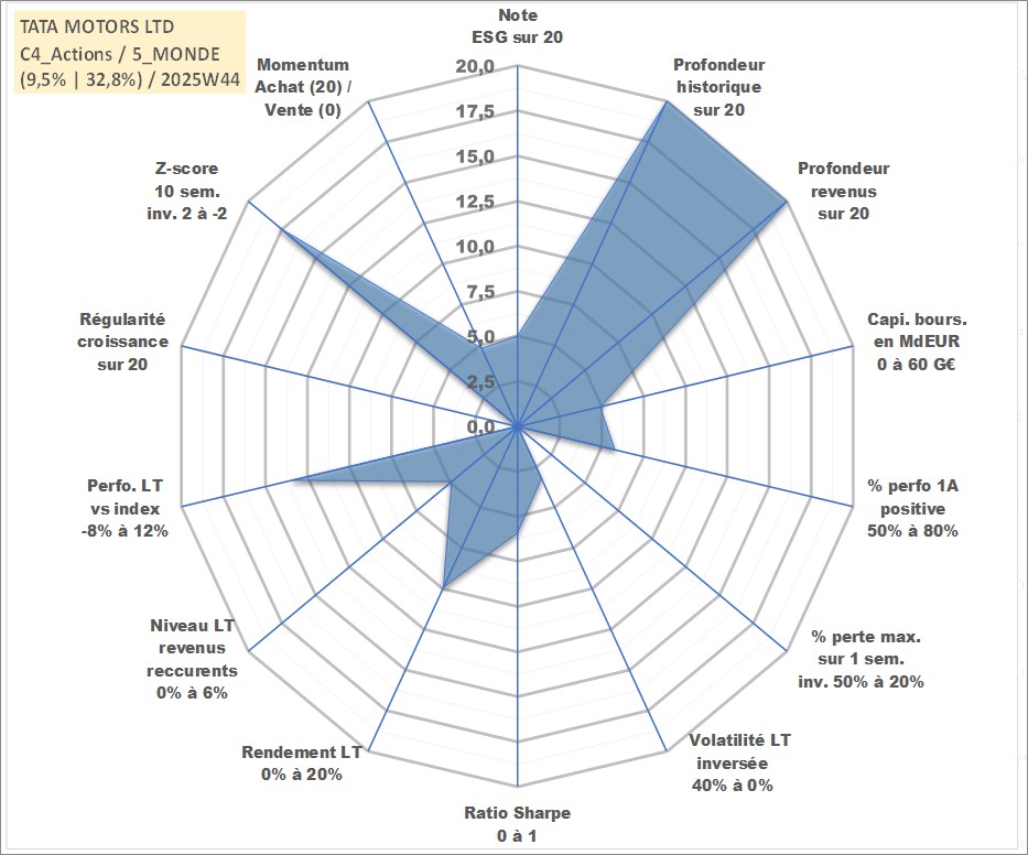 Site dédié aux investisseursPage dédiée sur site financeAnalyse des valorisations hebdomadaires de l'action TATA MOTORS LTD. Cet actif est cote en INR. Les valorisations sont en contrevaleur EURO et couvrent les semaines 1997W01 a 2025W44. Les revenus de cet actif financier sont pris en compte depuis la semaine 1997W20. La note globale ESG de cet actif est estimee a 5.0 (apres rebasage entre 0 et 20).