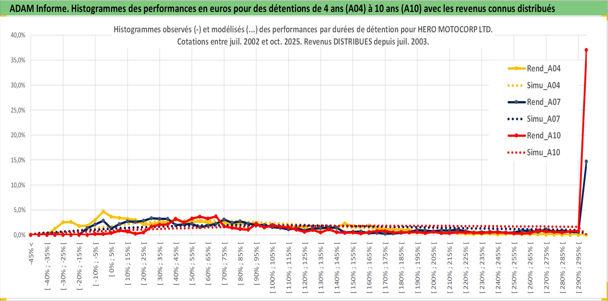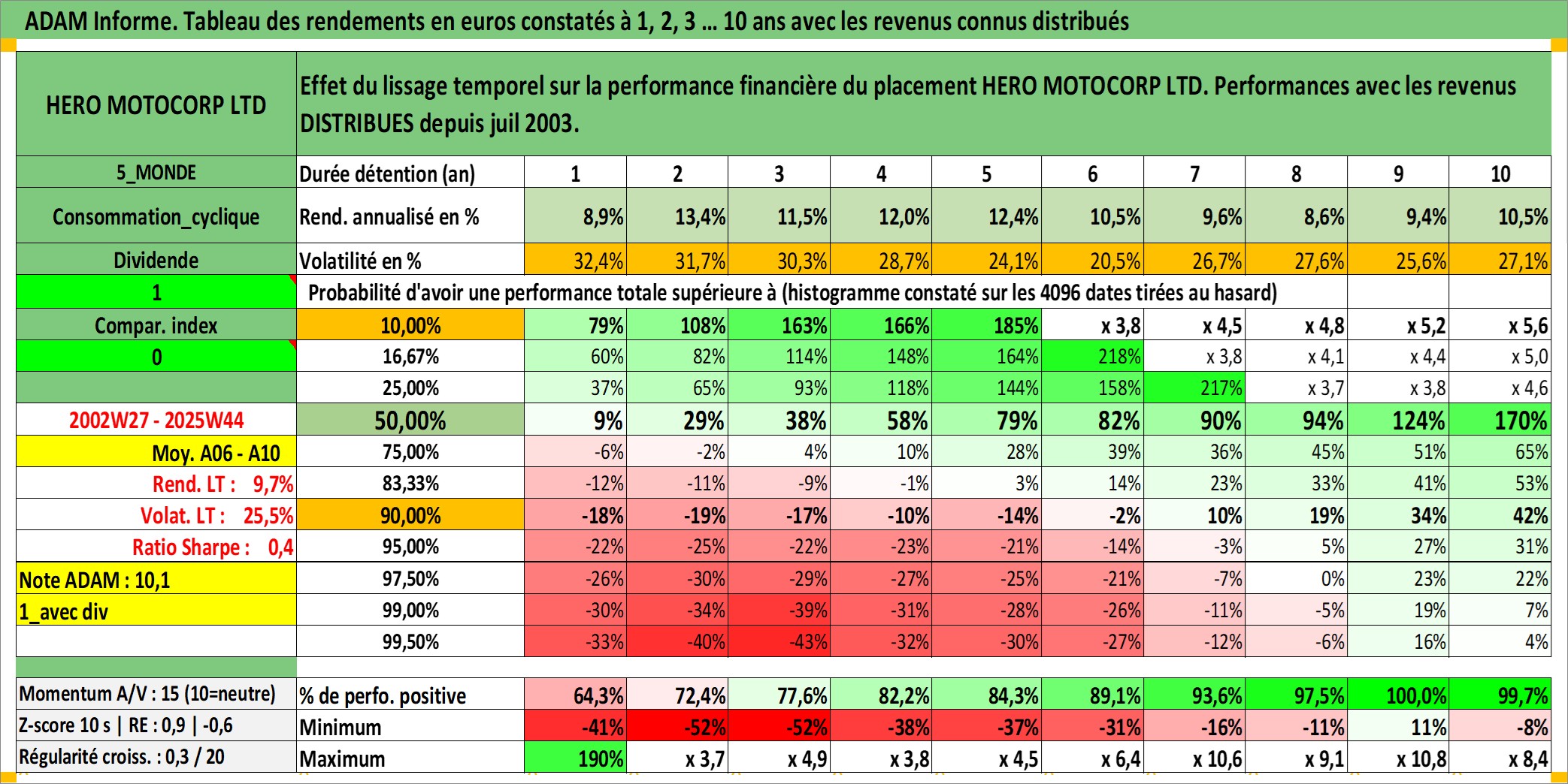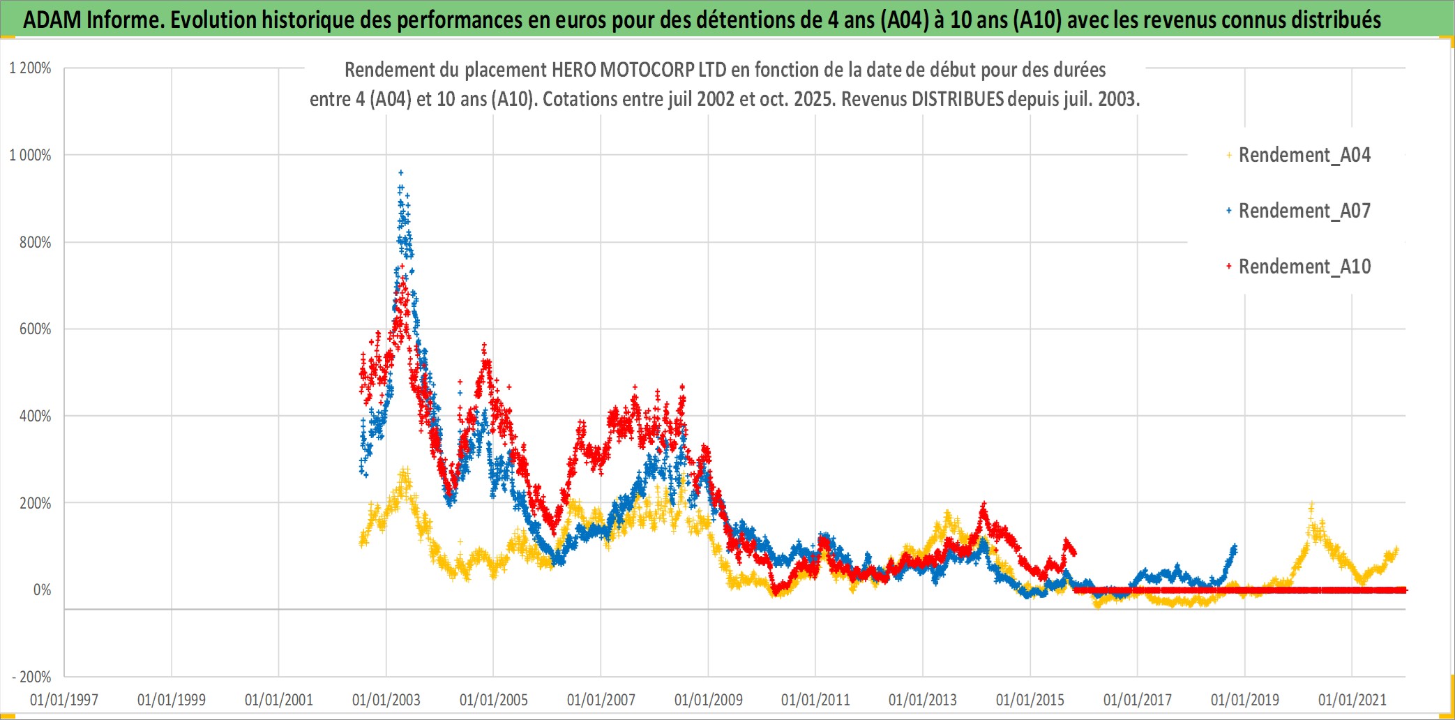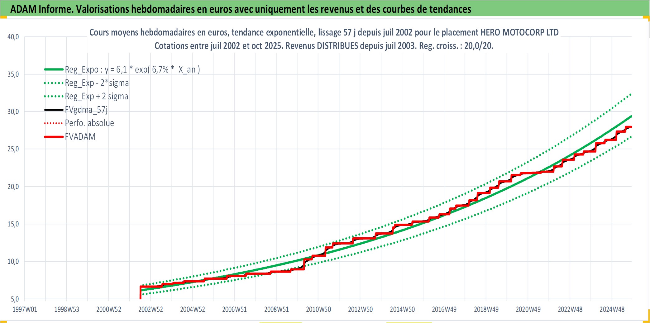 Site dédié aux investisseursPage dédiée sur site financeAnalyse des valorisations hebdomadaires de l'action HERO MOTOCORP LTD. Cet actif est cote en INR. Les valorisations sont en contrevaleur EURO et couvrent les semaines 2002W27 a 2025W44. Les revenus de cet actif financier sont pris en compte depuis la semaine 2003W29. La note globale ESG de cet actif est estimee a 16.0 (apres rebasage entre 0 et 20).