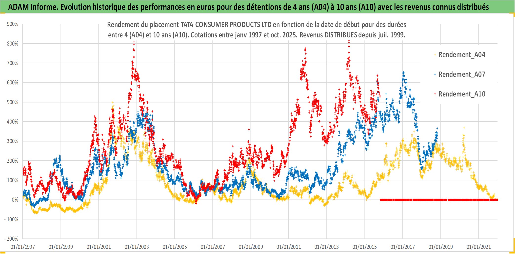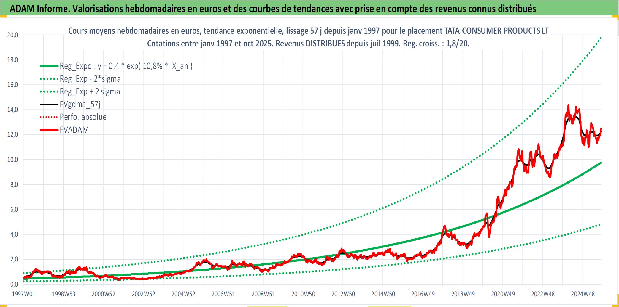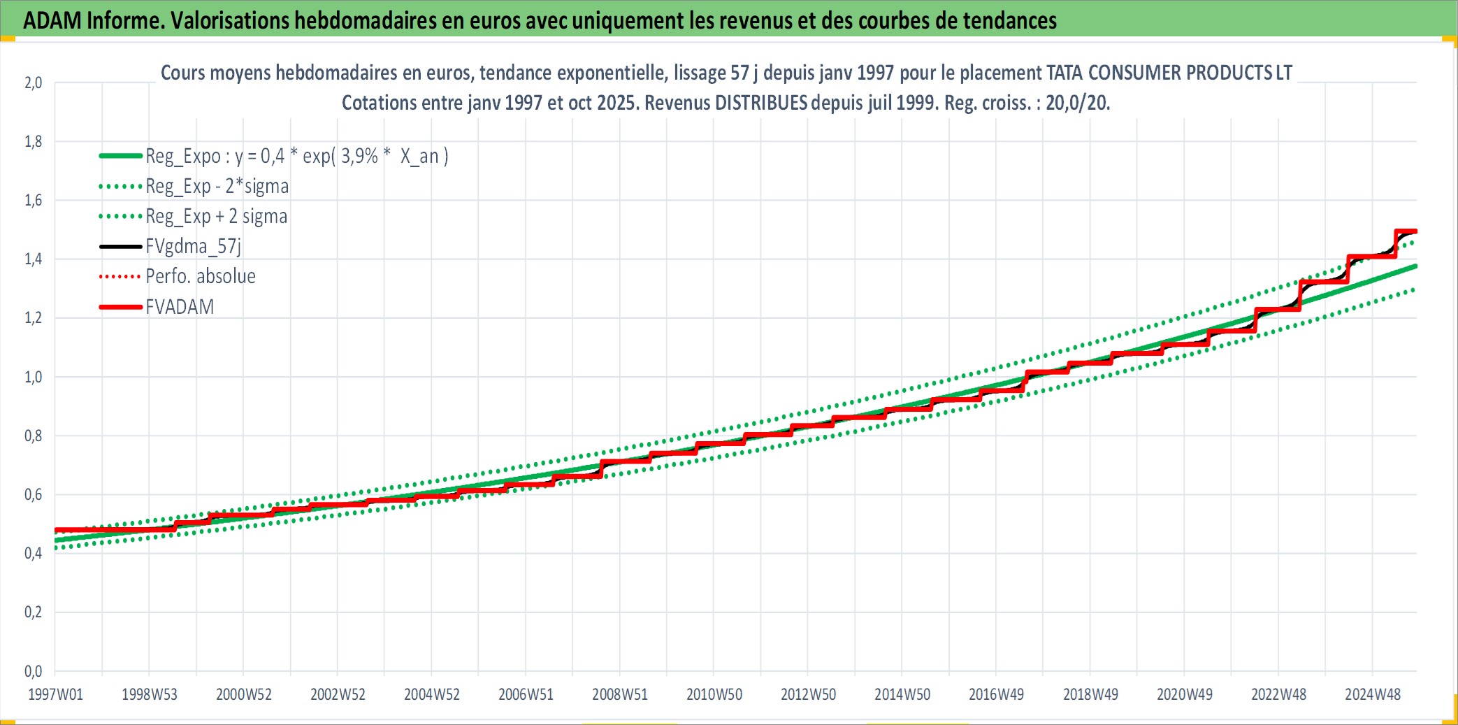 Site dédié aux investisseursPage dédiée sur site financeAnalyse des valorisations hebdomadaires de l'action TATA CONSUMER PRODUCTS LTD. Cet actif est cote en INR. Les valorisations sont en contrevaleur EURO et couvrent les semaines 1997W01 a 2025W44. Les revenus de cet actif financier sont pris en compte depuis la semaine 1999W29. La note ESG de cet actif n'est pas connue.