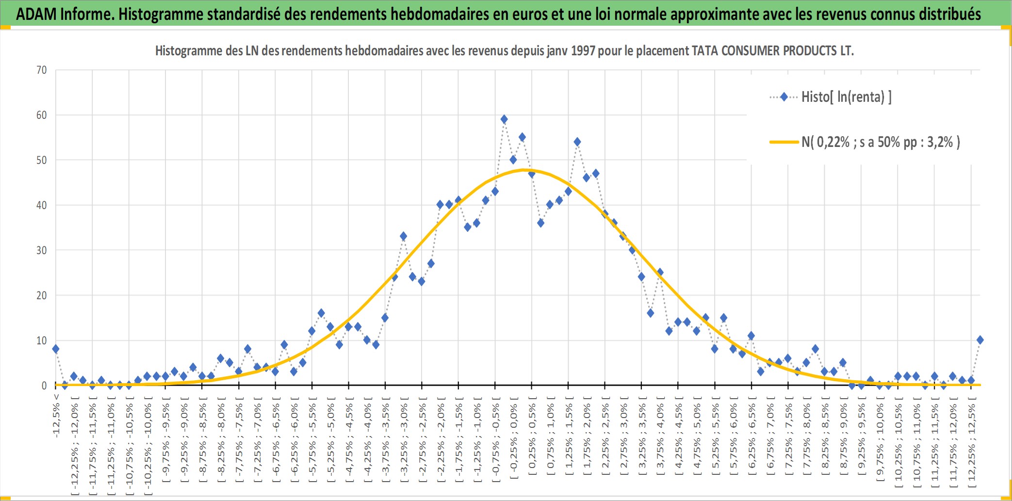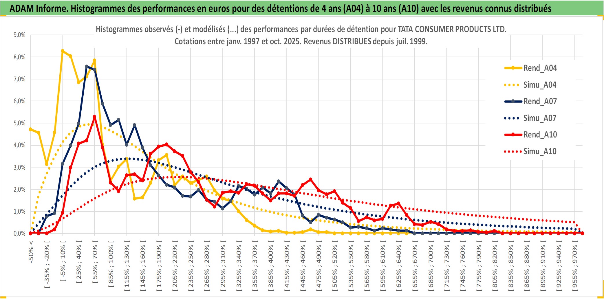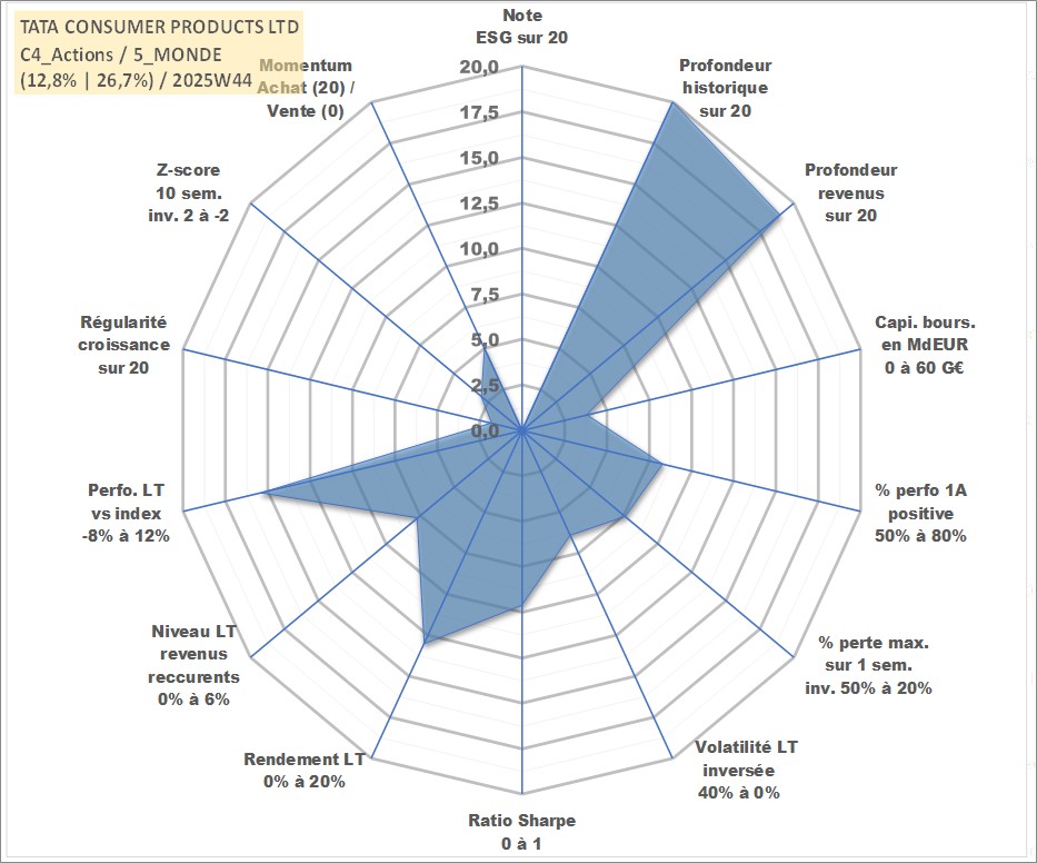 Site dédié aux investisseursPage dédiée sur site financeAnalyse des valorisations hebdomadaires de l'action TATA CONSUMER PRODUCTS LTD. Cet actif est cote en INR. Les valorisations sont en contrevaleur EURO et couvrent les semaines 1997W01 a 2025W44. Les revenus de cet actif financier sont pris en compte depuis la semaine 1999W29. La note ESG de cet actif n'est pas connue.