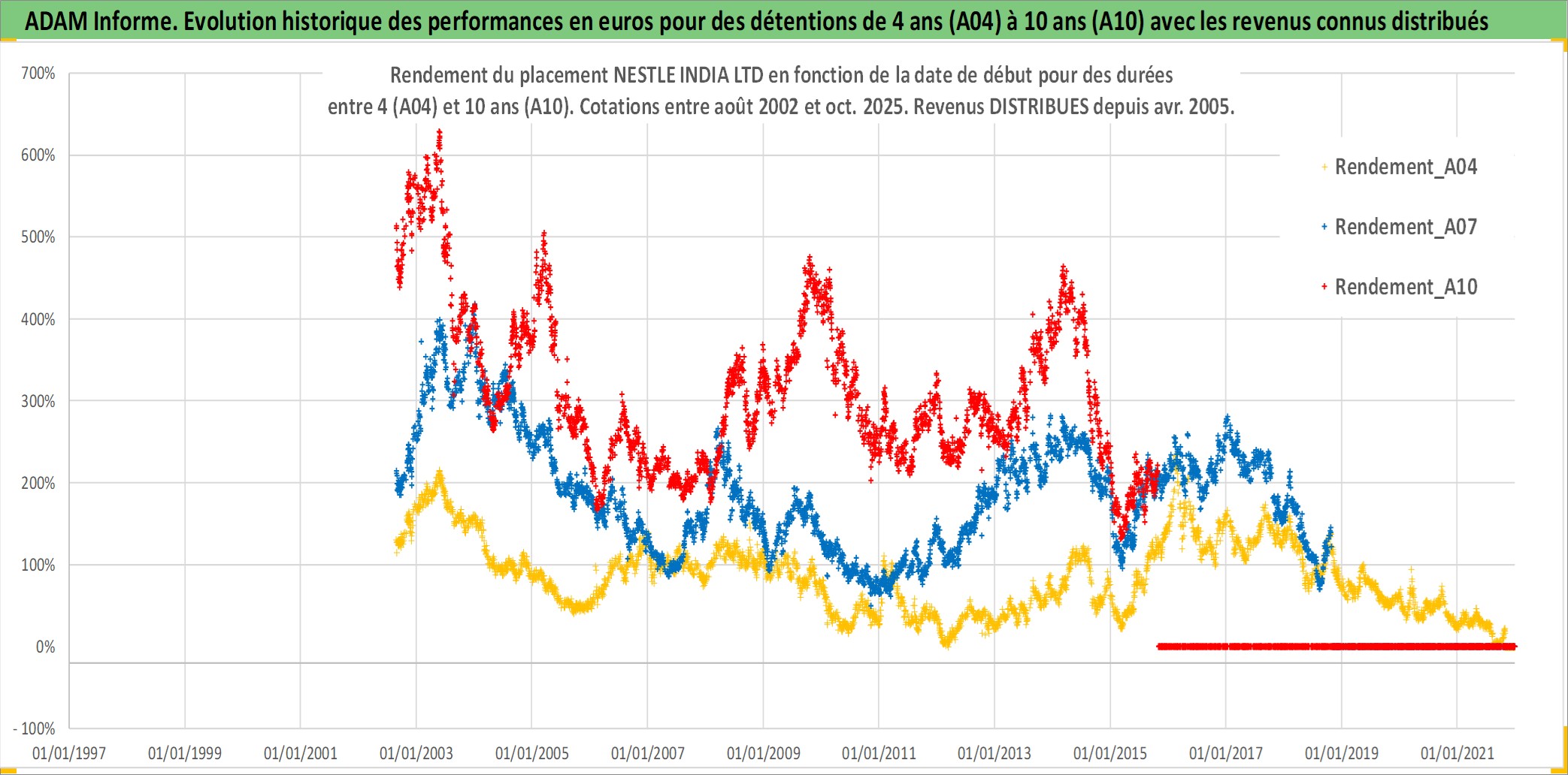 Site dédié aux investisseursPage dédiée sur site financeAnalyse des valorisations hebdomadaires de l'action NESTLE INDIA LTD. Cet actif est cote en INR. Les valorisations sont en contrevaleur EURO et couvrent les semaines 2002W33 a 2025W44. Les revenus de cet actif financier sont pris en compte depuis la semaine 2005W16. La note globale ESG de cet actif est estimee a 6.0 (apres rebasage entre 0 et 20).
