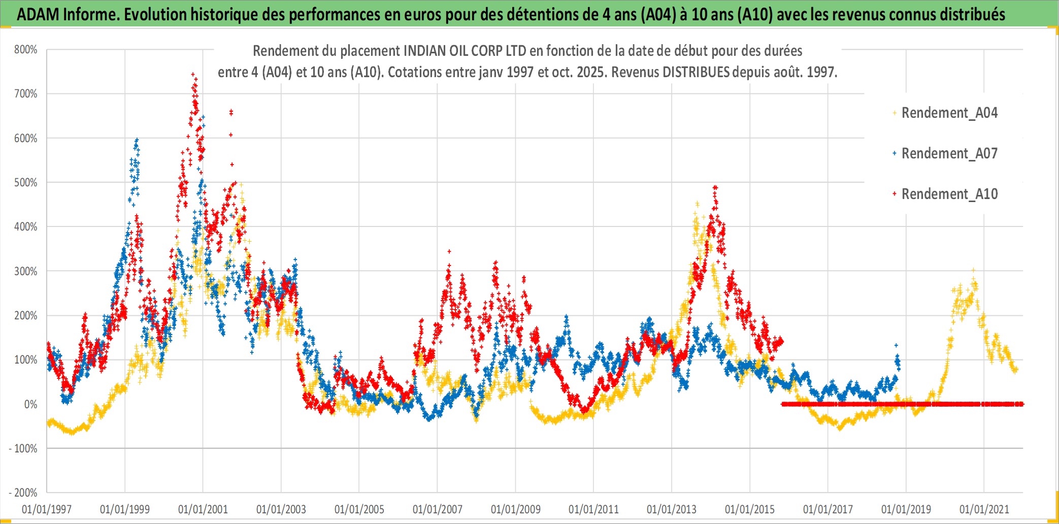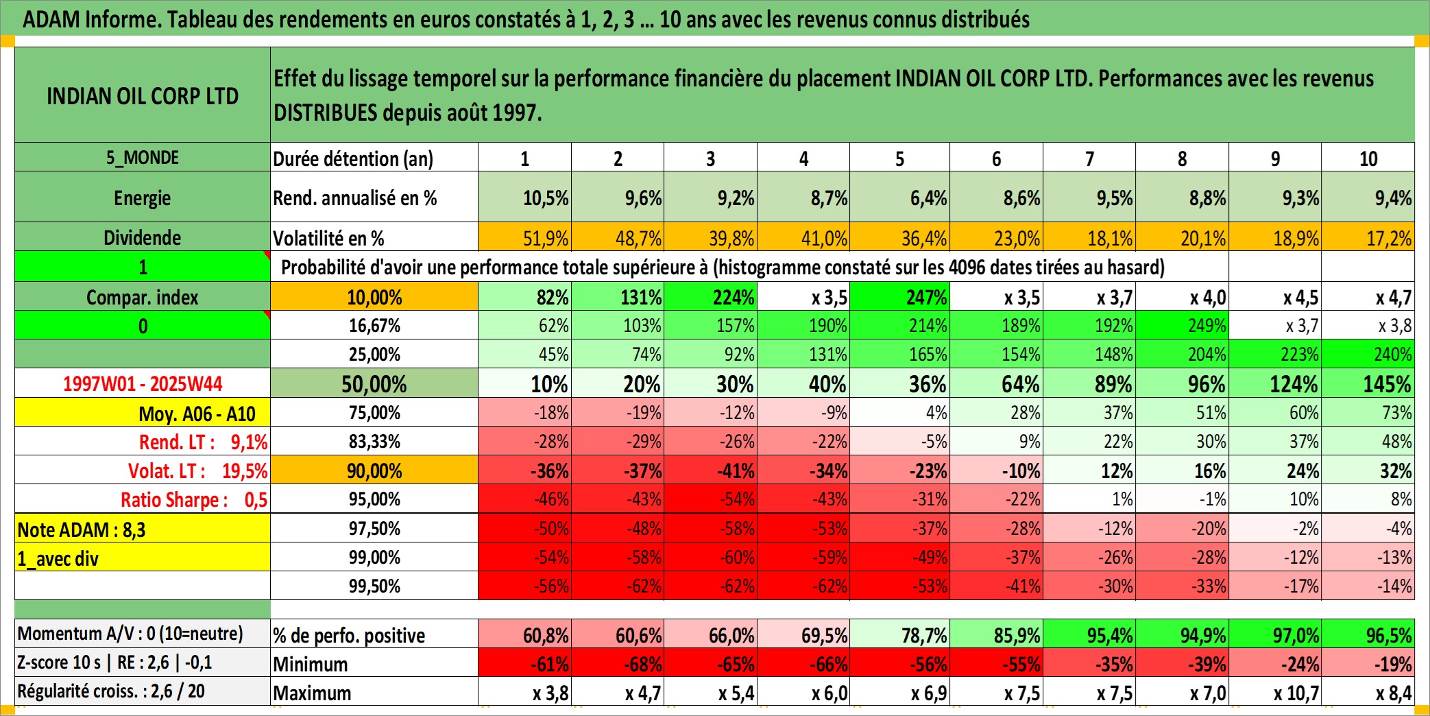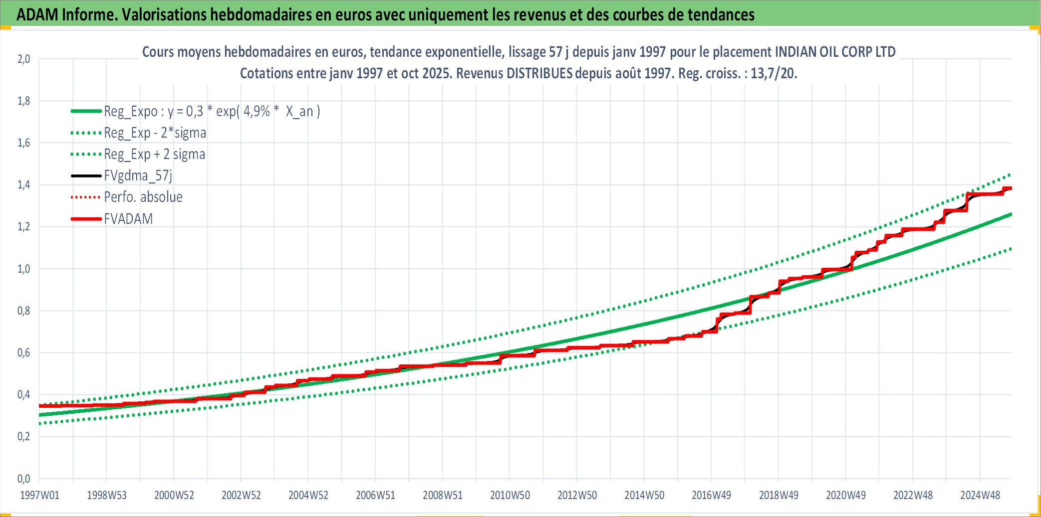 Site dédié aux investisseursPage dédiée sur site financeAnalyse des valorisations hebdomadaires de l'action INDIAN OIL CORP LTD. Cet actif est cote en INR. Les valorisations sont en contrevaleur EURO et couvrent les semaines 1997W01 a 2025W44. Les revenus de cet actif financier sont pris en compte depuis la semaine 1997W35. La note globale ESG de cet actif est estimee a 3.0 (apres rebasage entre 0 et 20).