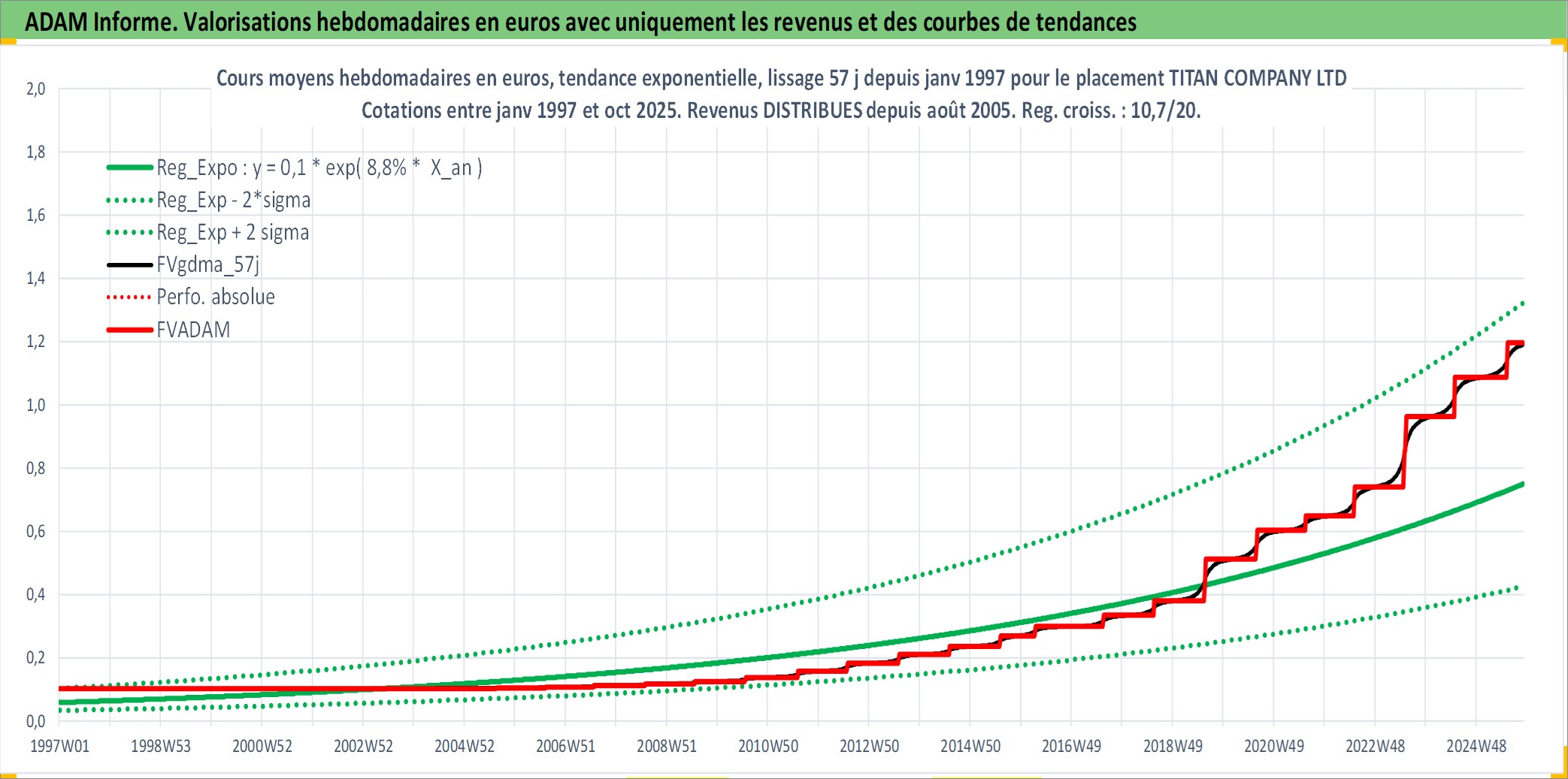 Site dédié aux investisseursPage dédiée sur site financeAnalyse des valorisations hebdomadaires de l'action TITAN COMPANY LTD. Cet actif est cote en INR. Les valorisations sont en contrevaleur EURO et couvrent les semaines 1997W01 a 2025W44. Les revenus de cet actif financier sont pris en compte depuis la semaine 2005W32. La note globale ESG de cet actif est estimee a 13.0 (apres rebasage entre 0 et 20).