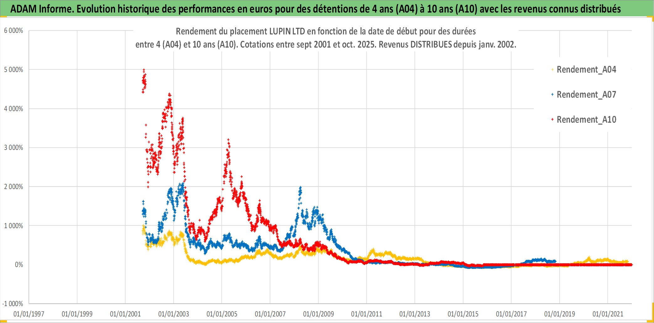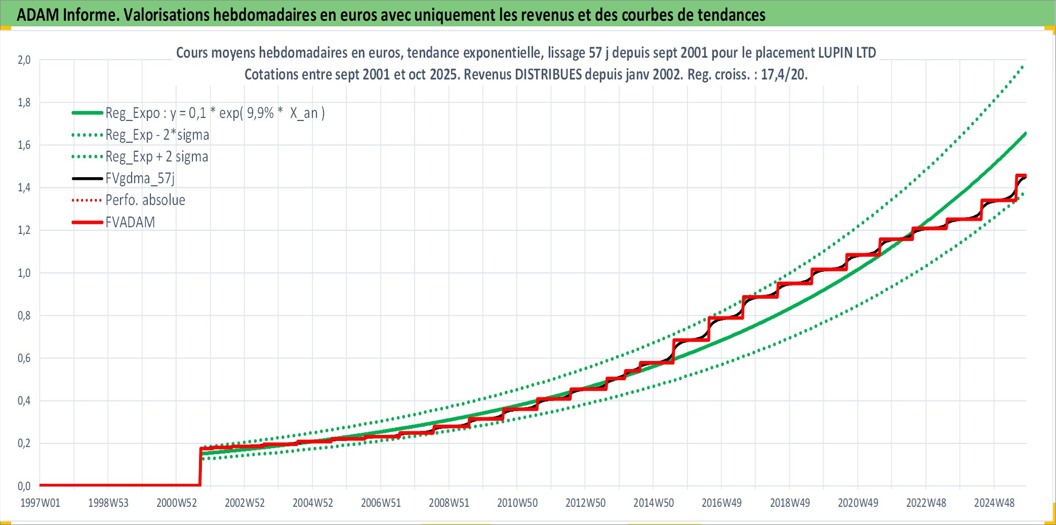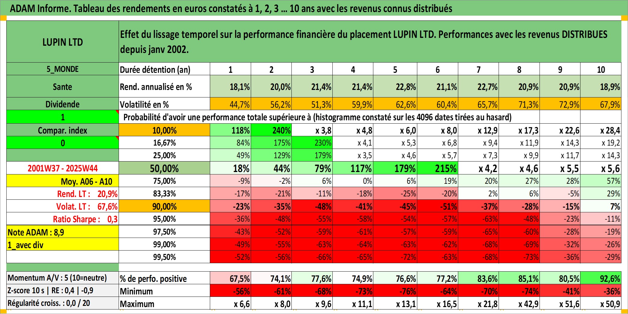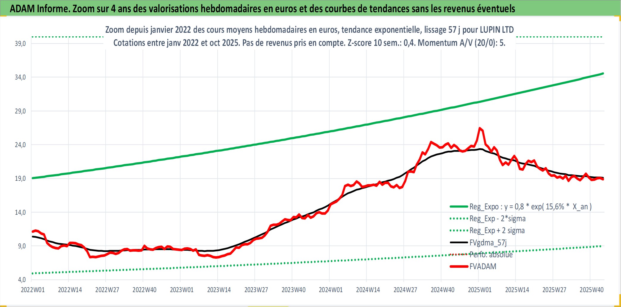 Site dédié aux investisseursPage dédiée sur site financeAnalyse des valorisations hebdomadaires de l'action LUPIN LTD. Cet actif est cote en INR. Les valorisations sont en contrevaleur EURO et couvrent les semaines 2001W37 a 2025W44. Les revenus de cet actif financier sont pris en compte depuis la semaine 2002W04. La note globale ESG de cet actif est estimee a 2.0 (apres rebasage entre 0 et 20).