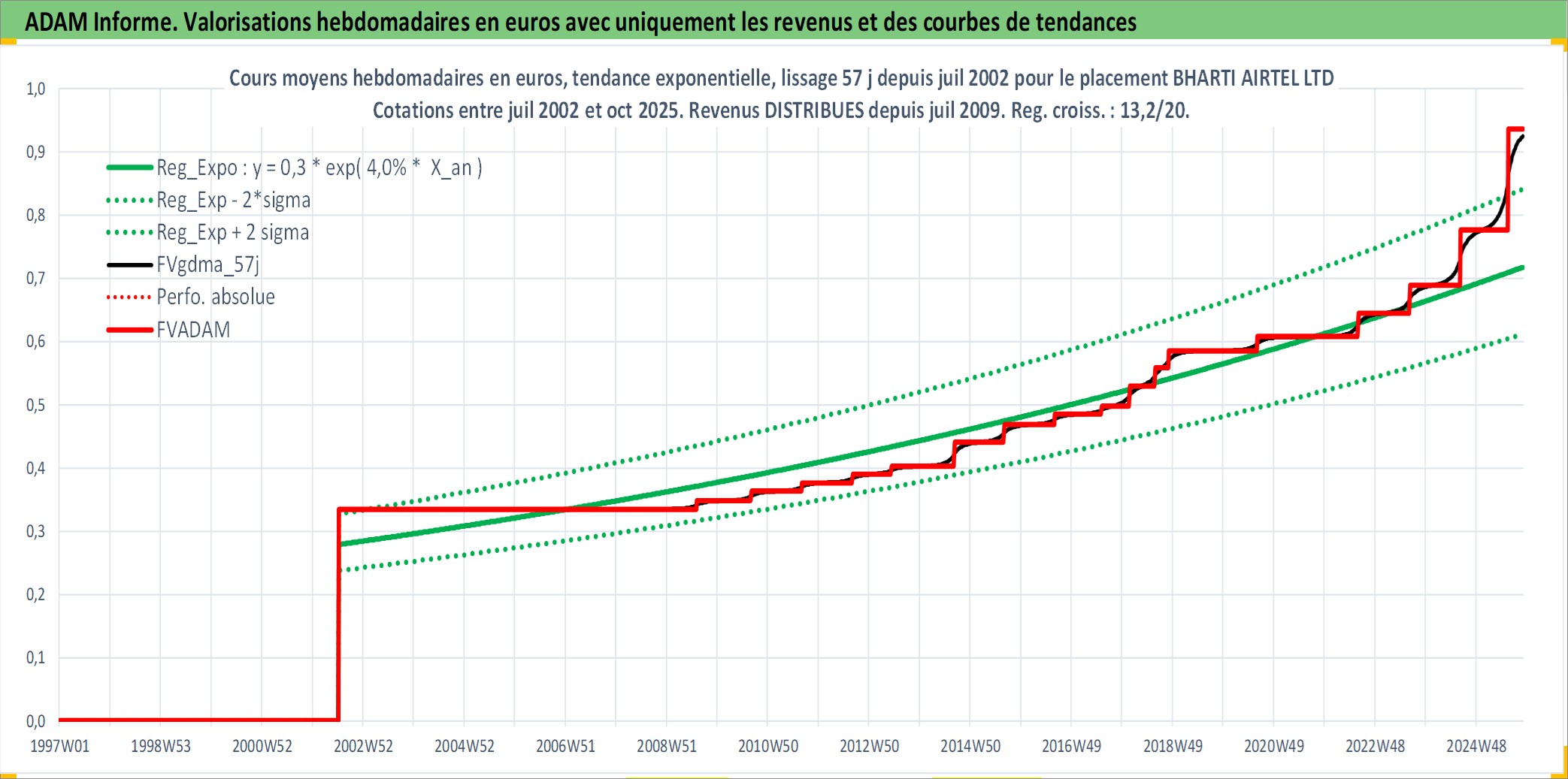 Site dédié aux investisseursPage dédiée sur site financeAnalyse des valorisations hebdomadaires de l'action BHARTI AIRTEL LTD. Cet actif est cote en INR. Les valorisations sont en contrevaleur EURO et couvrent les semaines 2002W27 a 2025W44. Les revenus de cet actif financier sont pris en compte depuis la semaine 2009W30. La note globale ESG de cet actif est estimee a 10.0 (apres rebasage entre 0 et 20).