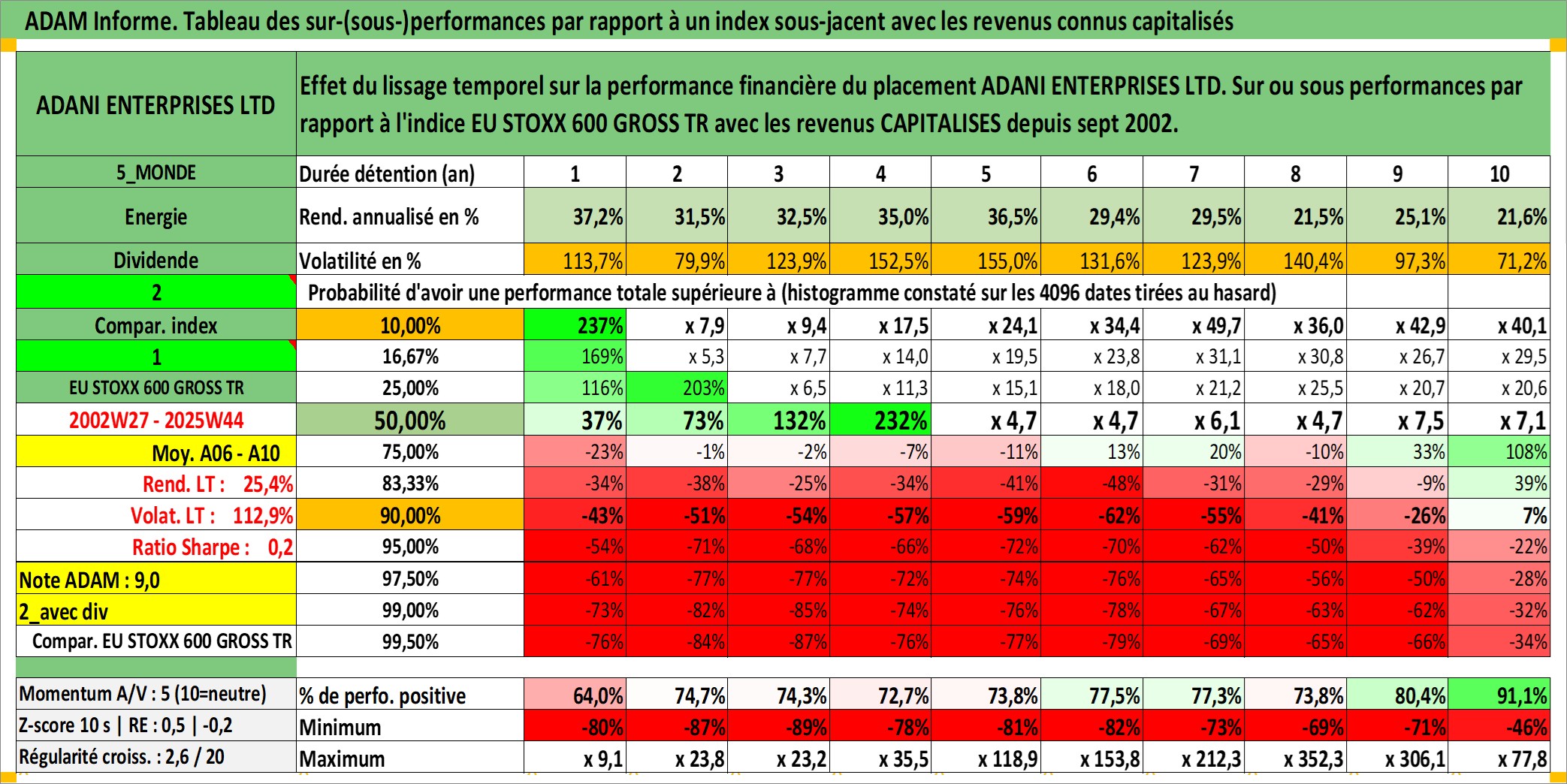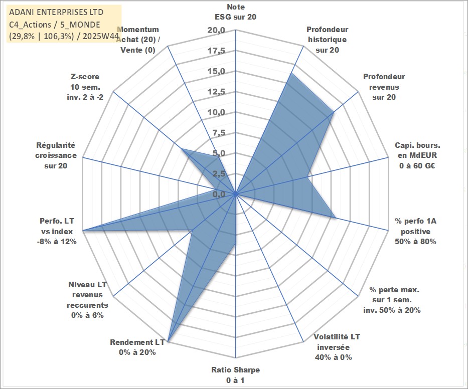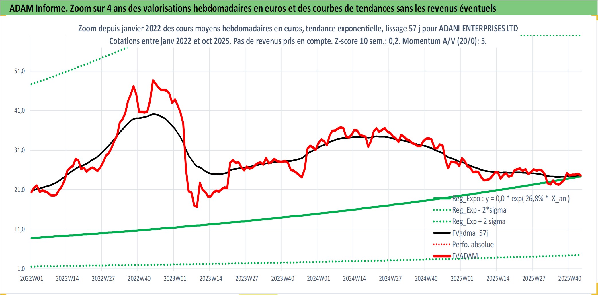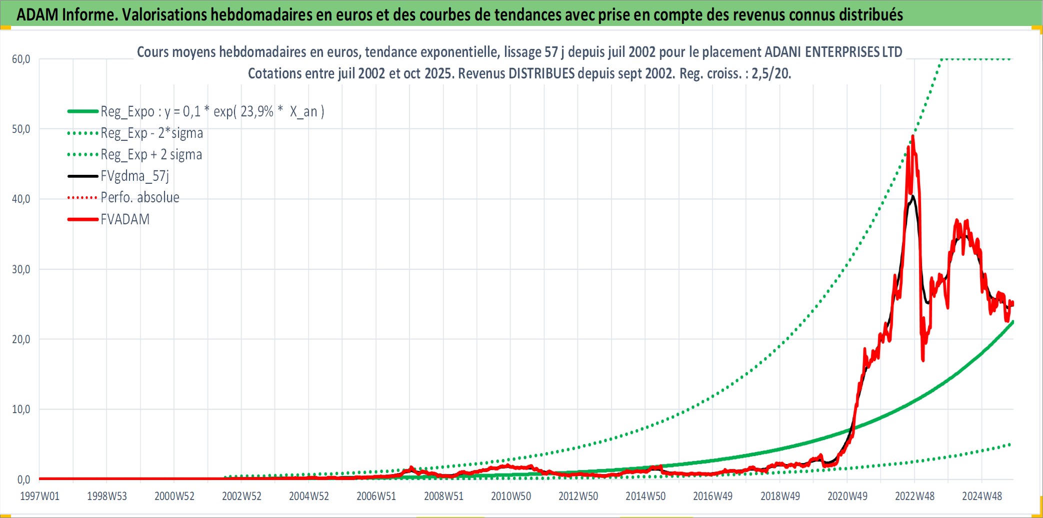 Site dédié aux investisseursPage dédiée sur site financeAnalyse des valorisations hebdomadaires de l'action ADANI ENTERPRISES LTD. Cet actif est cote en INR. Les valorisations sont en contrevaleur EURO et couvrent les semaines 2002W27 a 2025W44. Les revenus de cet actif financier sont pris en compte depuis la semaine 2002W36. La note ESG de cet actif n'est pas connue.