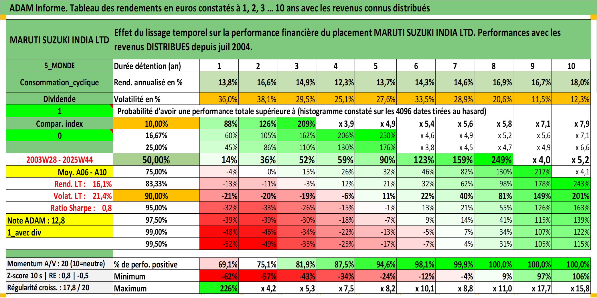 Site dédié aux investisseursPage dédiée sur site financeAnalyse des valorisations hebdomadaires de l'action MARUTI SUZUKI INDIA LTD. Cet actif est cote en INR. Les valorisations sont en contrevaleur EURO et couvrent les semaines 2003W28 a 2025W44. Les revenus de cet actif financier sont pris en compte depuis la semaine 2004W28. La note globale ESG de cet actif est estimee a 7.0 (apres rebasage entre 0 et 20).