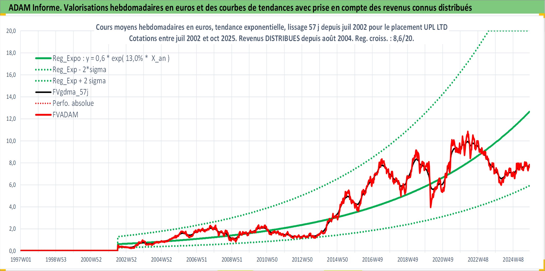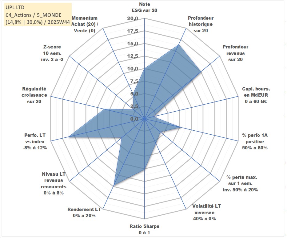 Site dédié aux investisseursPage dédiée sur site financeAnalyse des valorisations hebdomadaires de l'action UPL LTD. Cet actif est cote en INR. Les valorisations sont en contrevaleur EURO et couvrent les semaines 2002W27 a 2025W44. Les revenus de cet actif financier sont pris en compte depuis la semaine 2004W34. La note globale ESG de cet actif est estimee a 10.0 (apres rebasage entre 0 et 20).