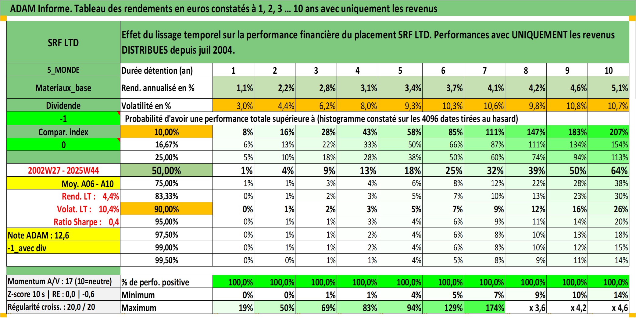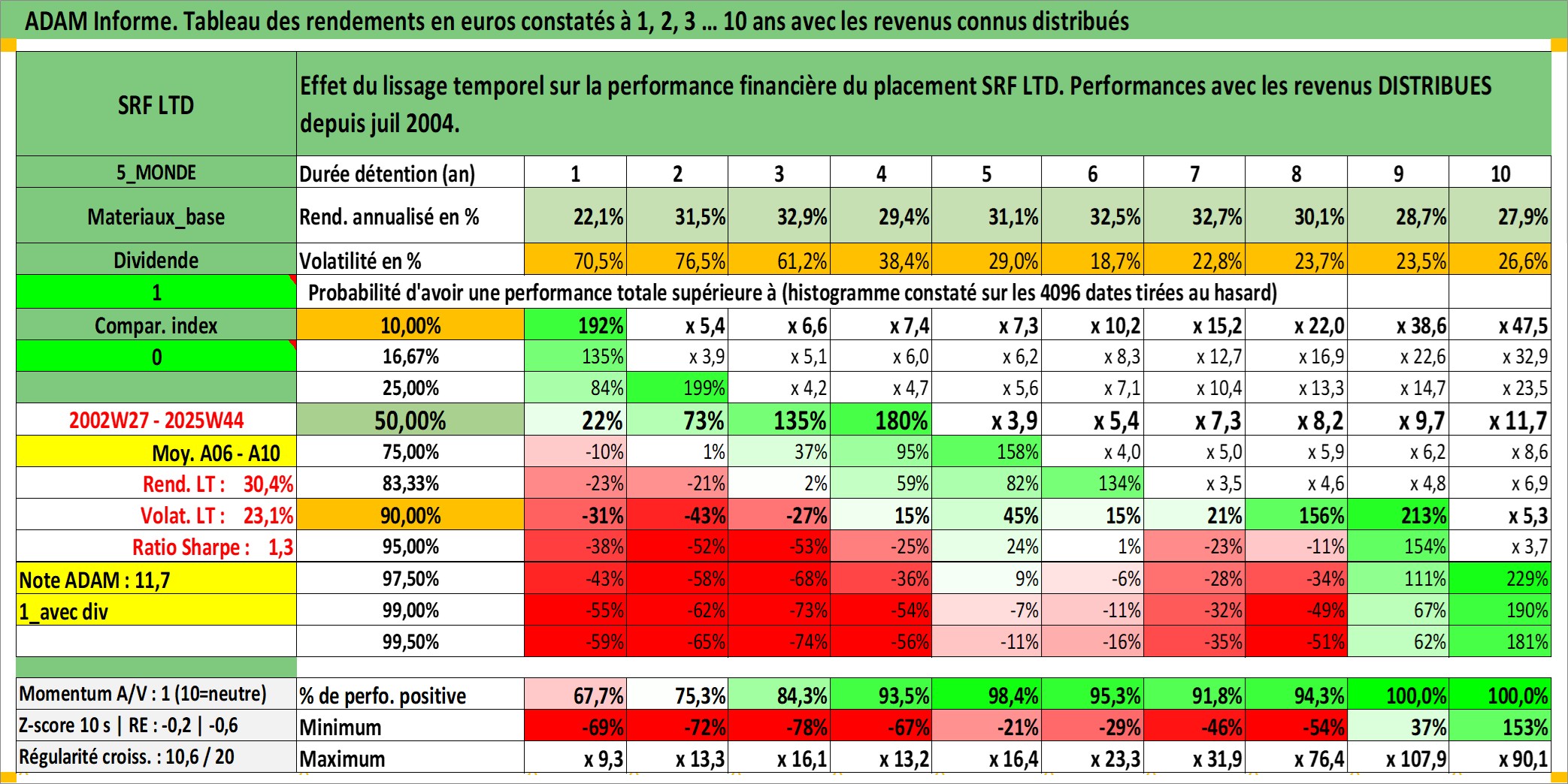 Site dédié aux investisseursPage dédiée sur site financeAnalyse des valorisations hebdomadaires de l'action SRF LTD. Cet actif est cote en INR. Les valorisations sont en contrevaleur EURO et couvrent les semaines 2002W27 a 2025W44. Les revenus de cet actif financier sont pris en compte depuis la semaine 2004W31. La note ESG de cet actif n'est pas connue.