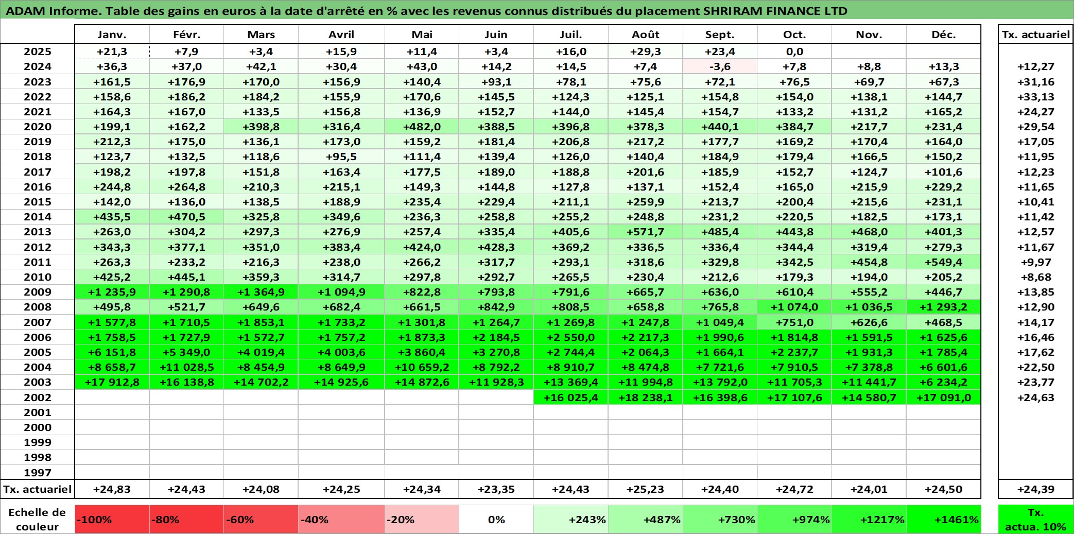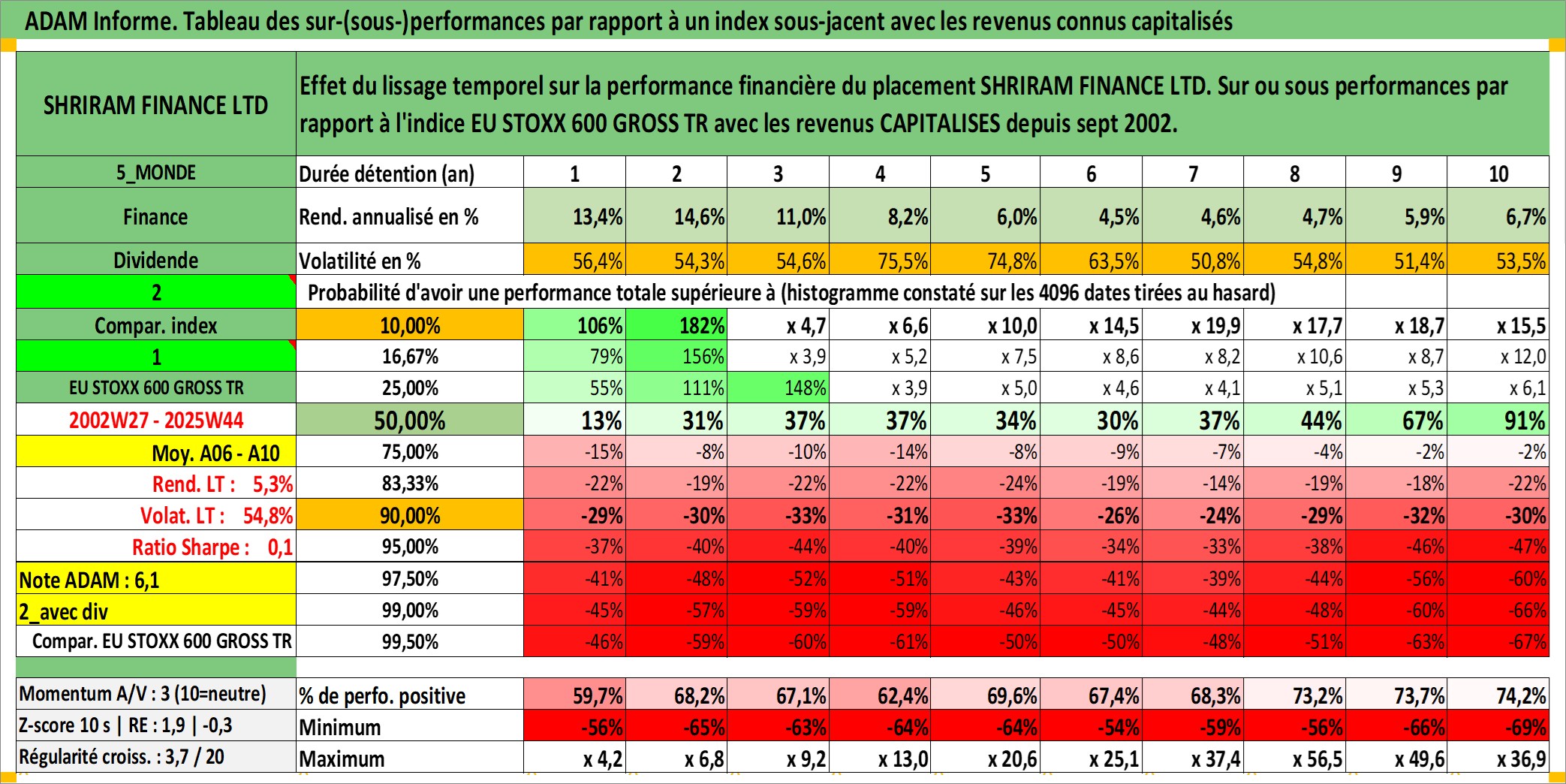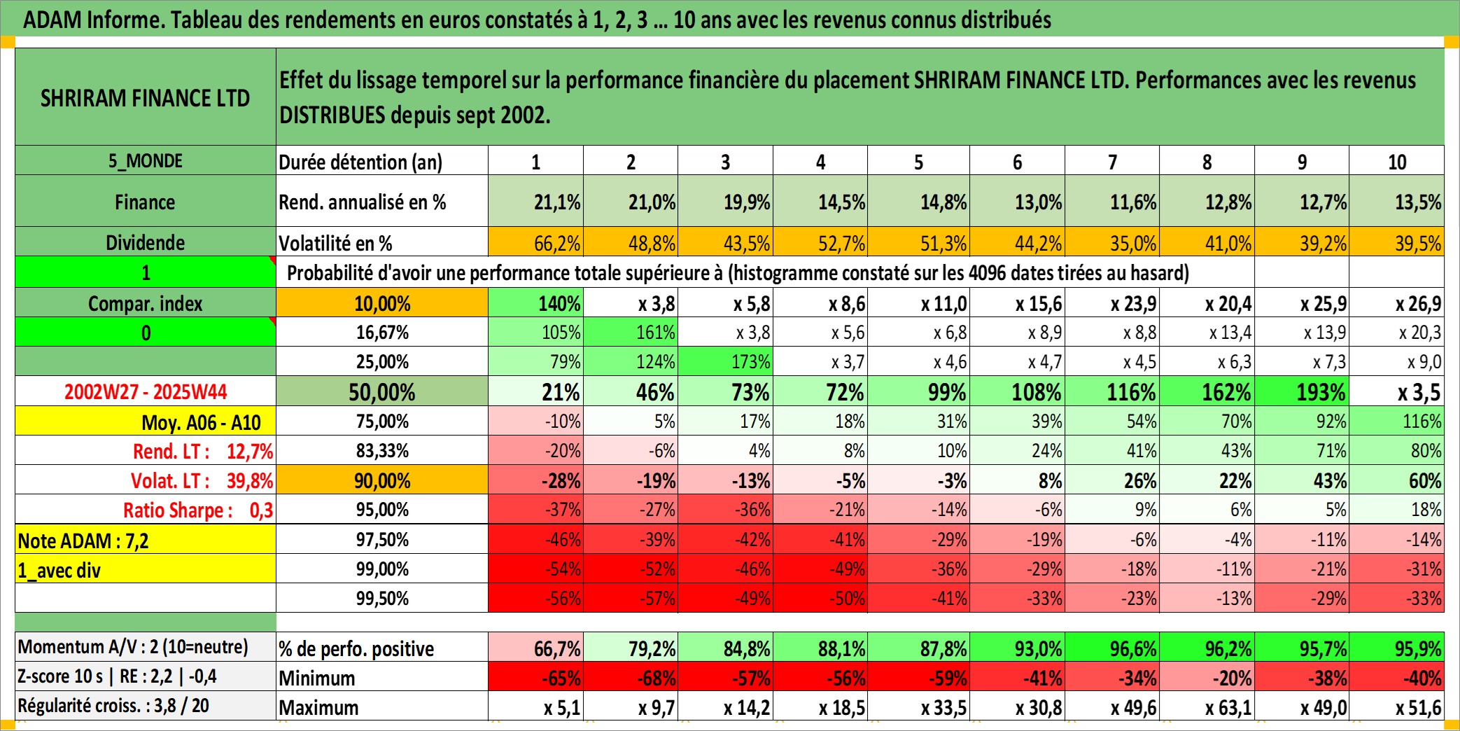 Site dédié aux investisseursPage dédiée sur site financeAnalyse des valorisations hebdomadaires de l'action SHRIRAM FINANCE LTD. Cet actif est cote en INR. Les valorisations sont en contrevaleur EURO et couvrent les semaines 2002W27 a 2025W44. Les revenus de cet actif financier sont pris en compte depuis la semaine 2002W37. La note ESG de cet actif n'est pas connue.