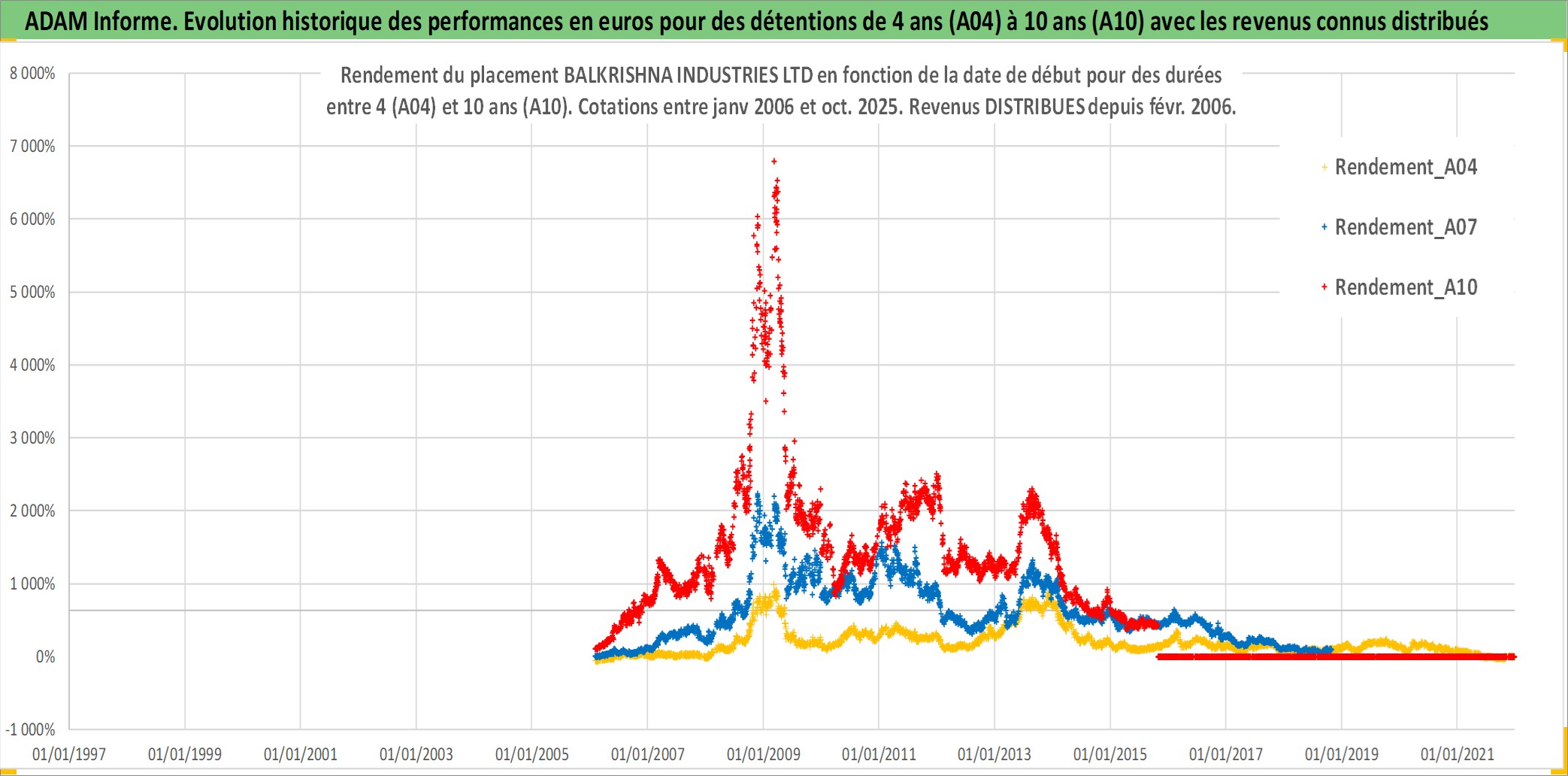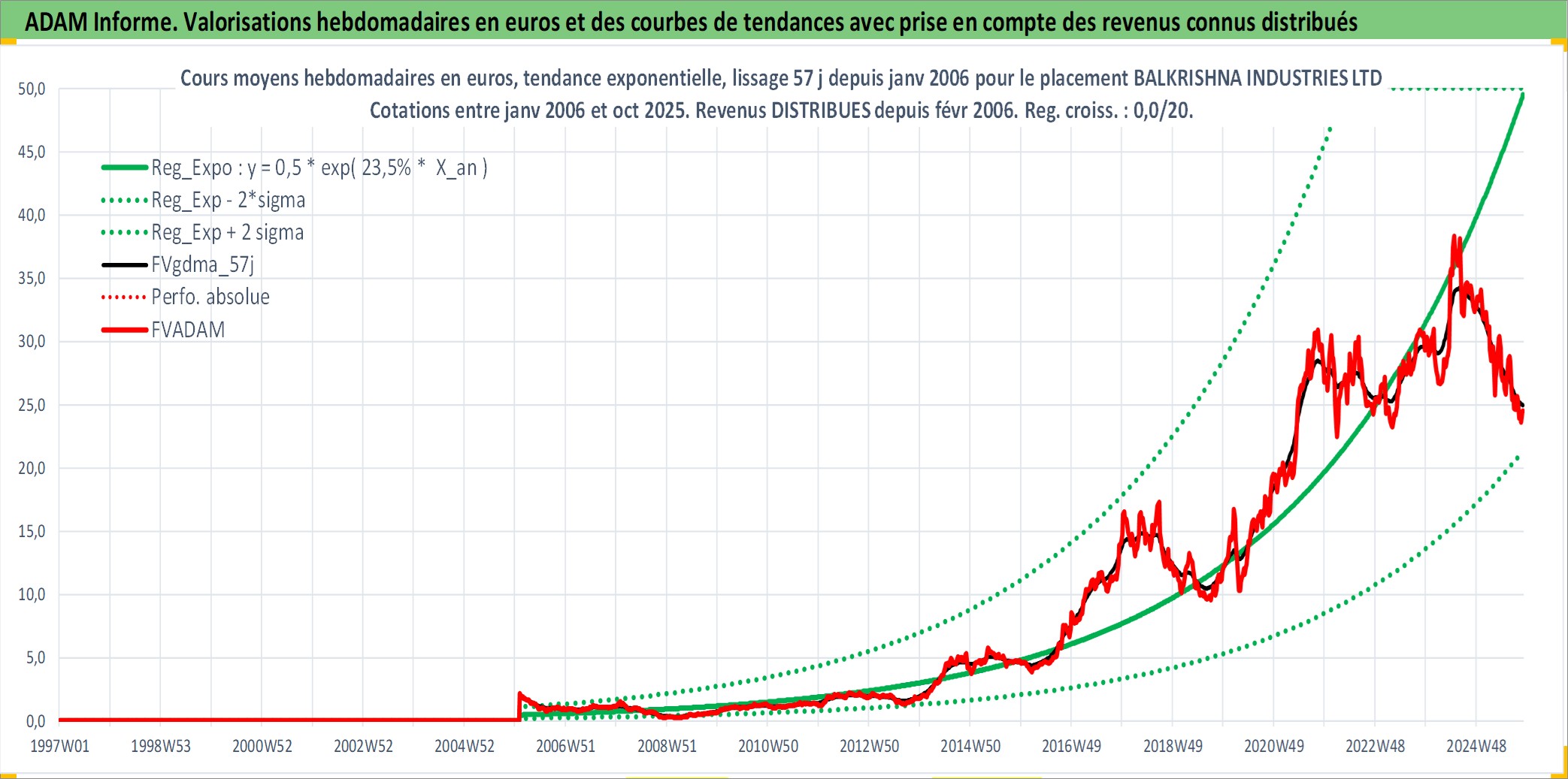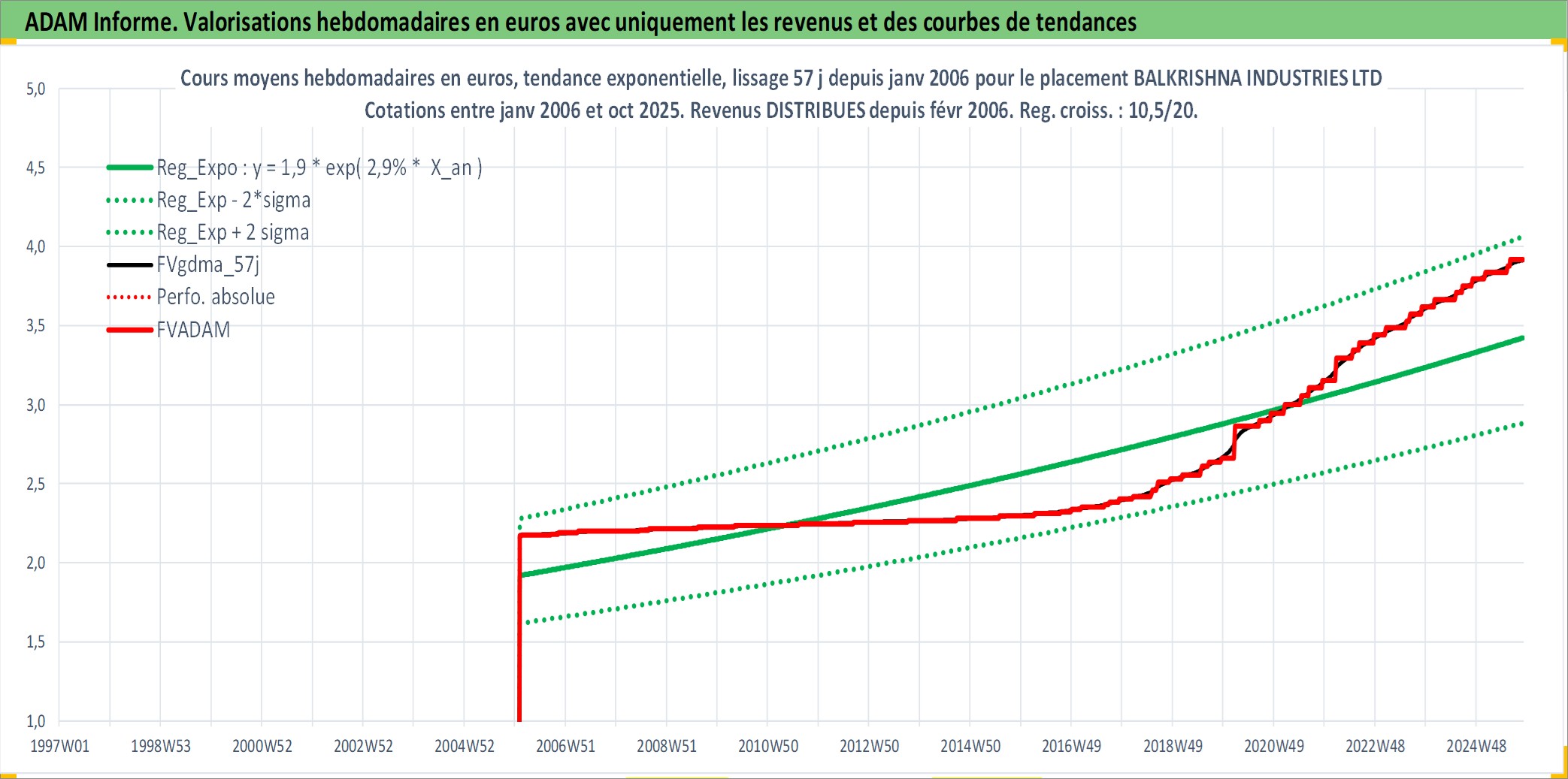 Site dédié aux investisseursPage dédiée sur site financeAnalyse des valorisations hebdomadaires de l'action BALKRISHNA INDUSTRIES LTD. Cet actif est cote en INR. Les valorisations sont en contrevaleur EURO et couvrent les semaines 2006W04 a 2025W44. Les revenus de cet actif financier sont pris en compte depuis la semaine 2006W06. La note ESG de cet actif n'est pas connue.