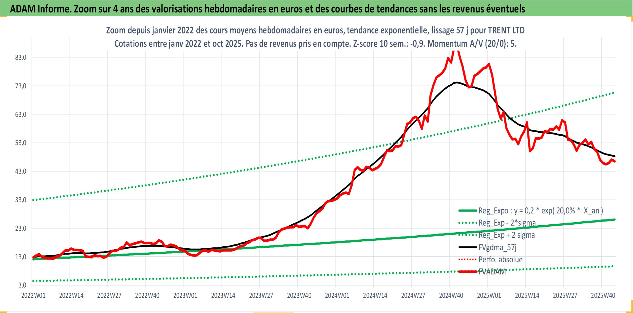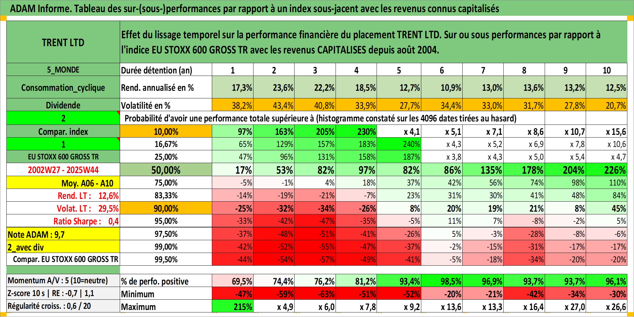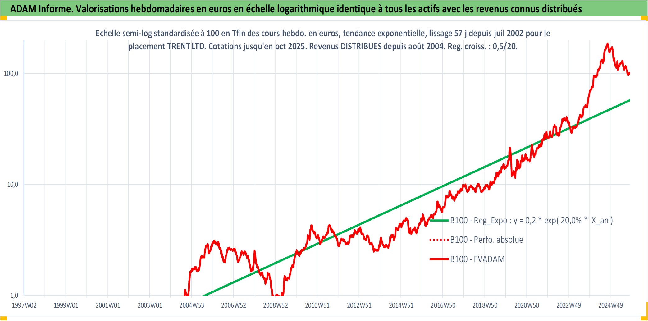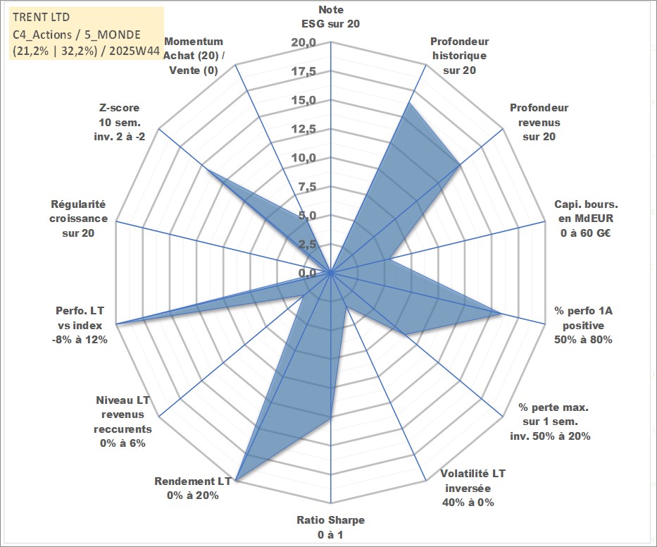 Site dédié aux investisseursPage dédiée sur site financeAnalyse des valorisations hebdomadaires de l'action TRENT LTD. Cet actif est cote en INR. Les valorisations sont en contrevaleur EURO et couvrent les semaines 2002W27 a 2025W44. Les revenus de cet actif financier sont pris en compte depuis la semaine 2004W32. La note ESG de cet actif n'est pas connue.